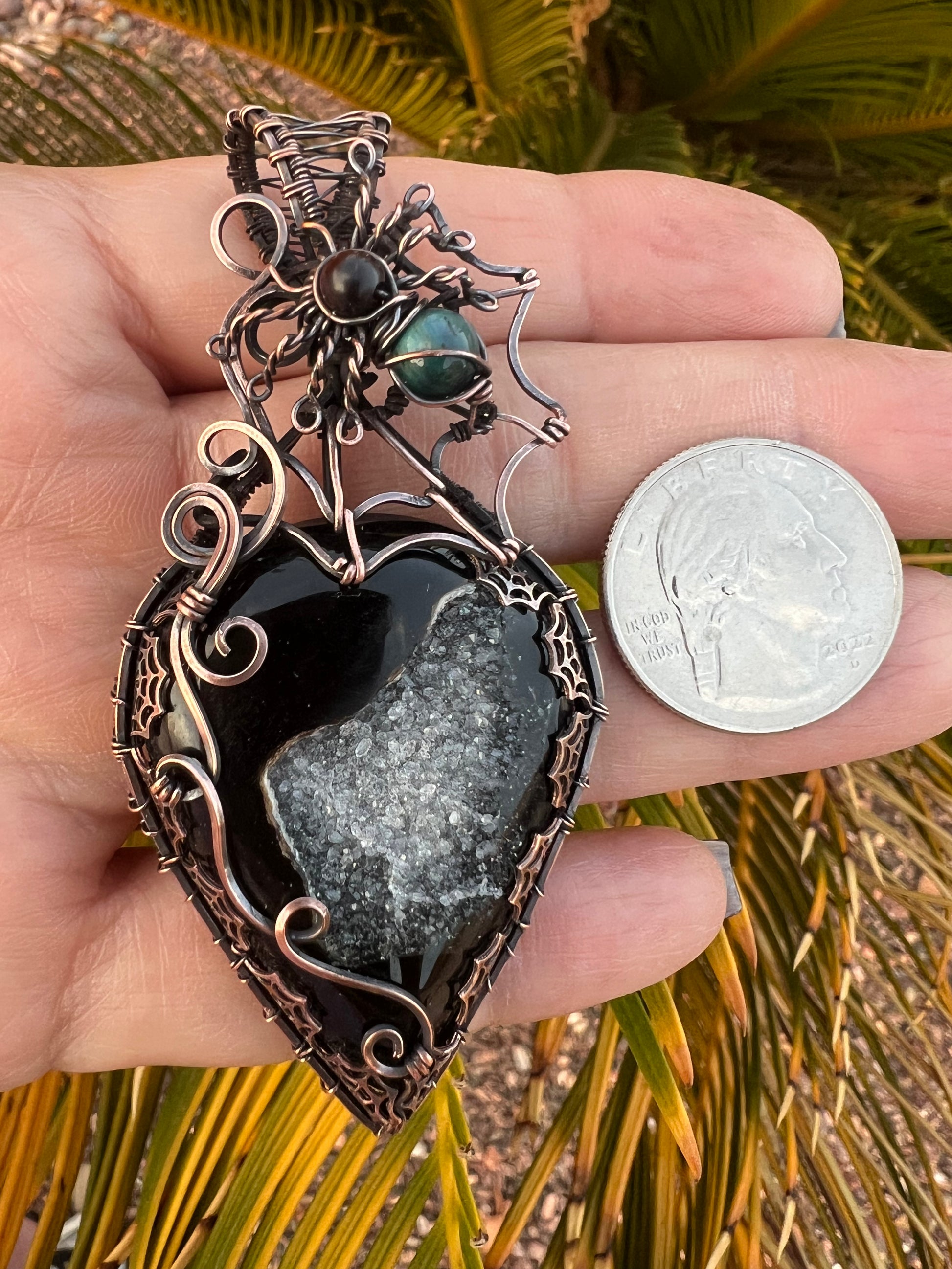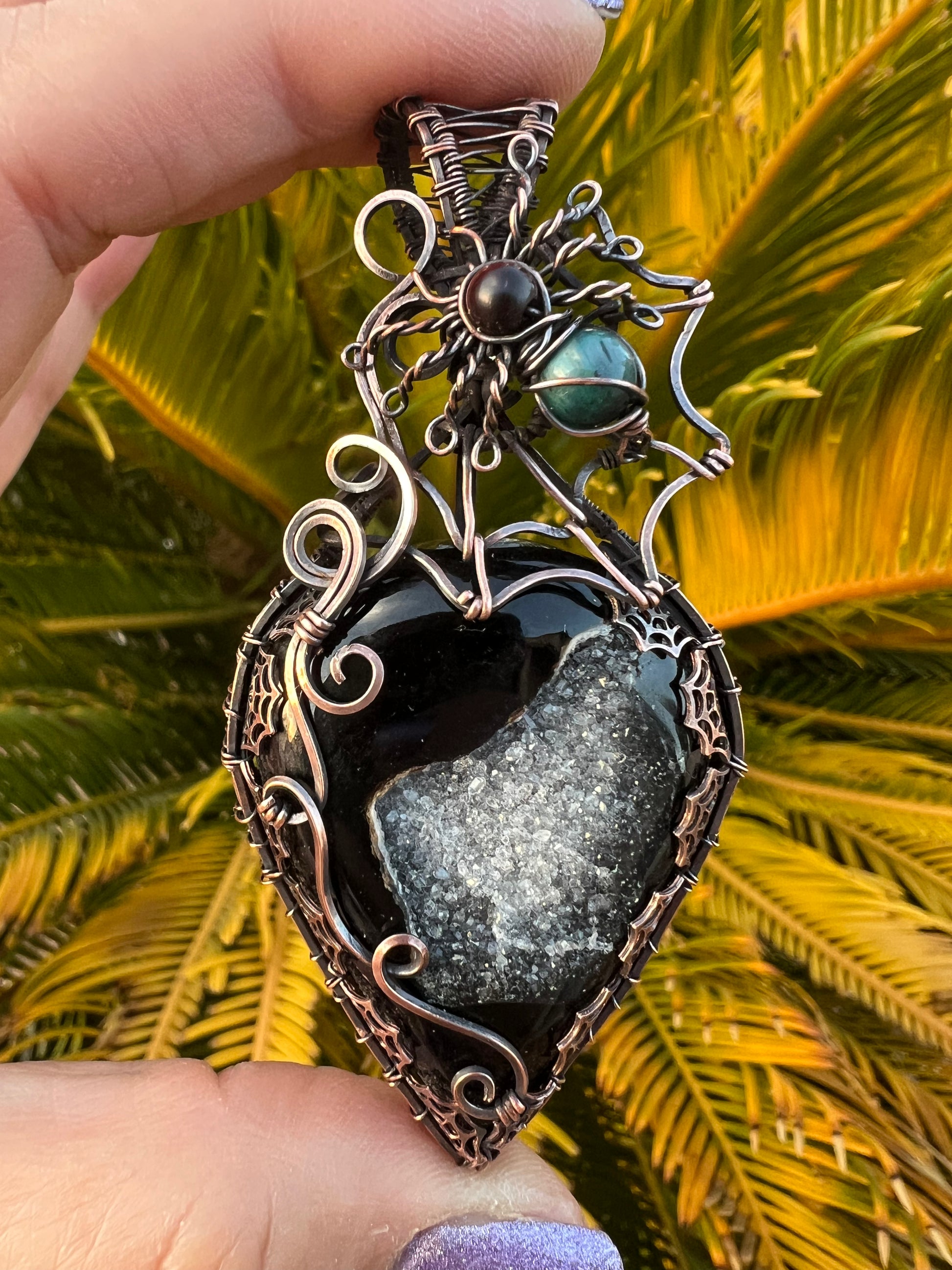 A shimmering black druzy, wrapped in swirling copper and crowned with a tiny spider guarding its web. This one-of-a-kind pendant weaves mystery, magic, and a touch of the macabre into wearable art.
