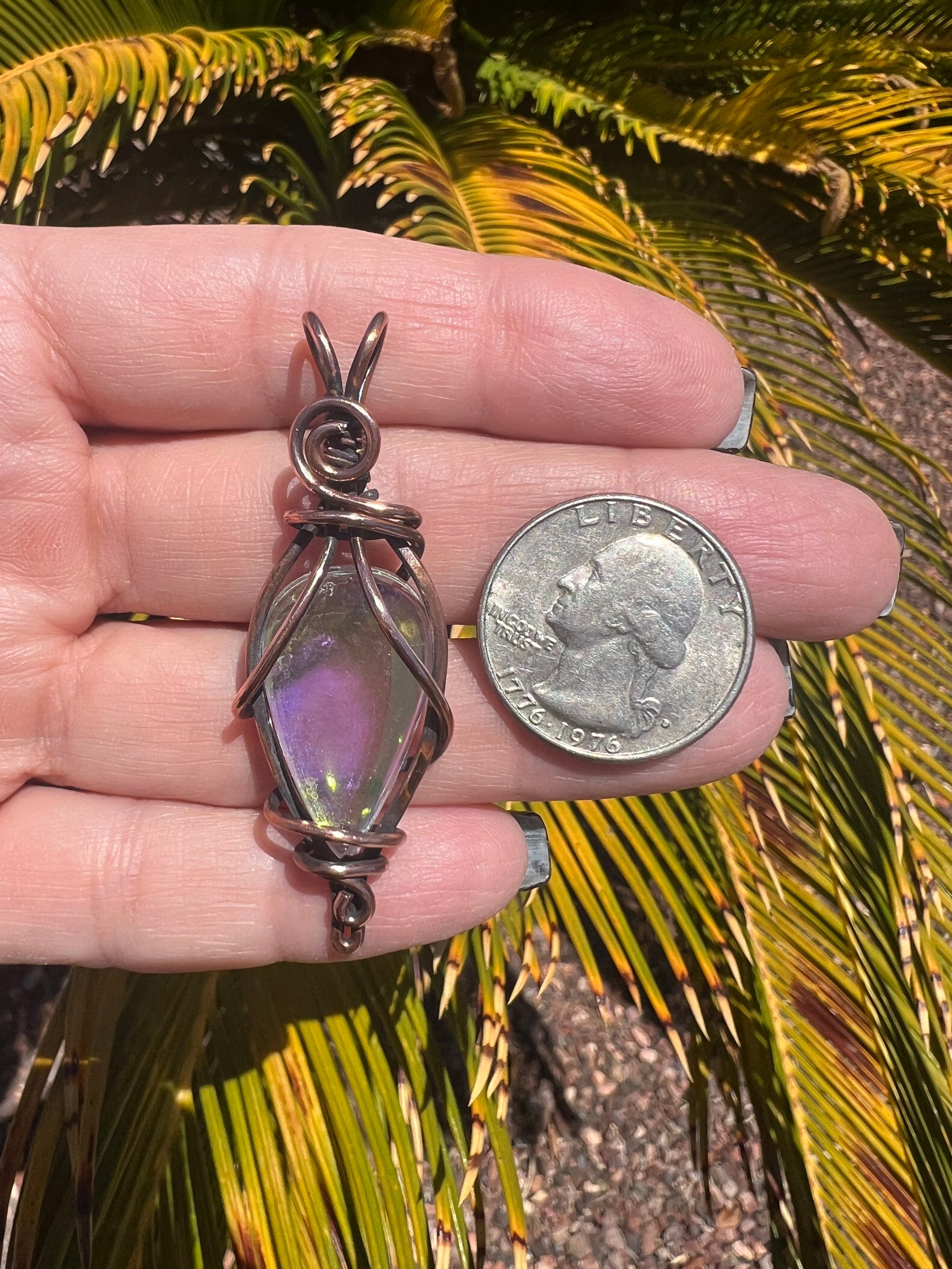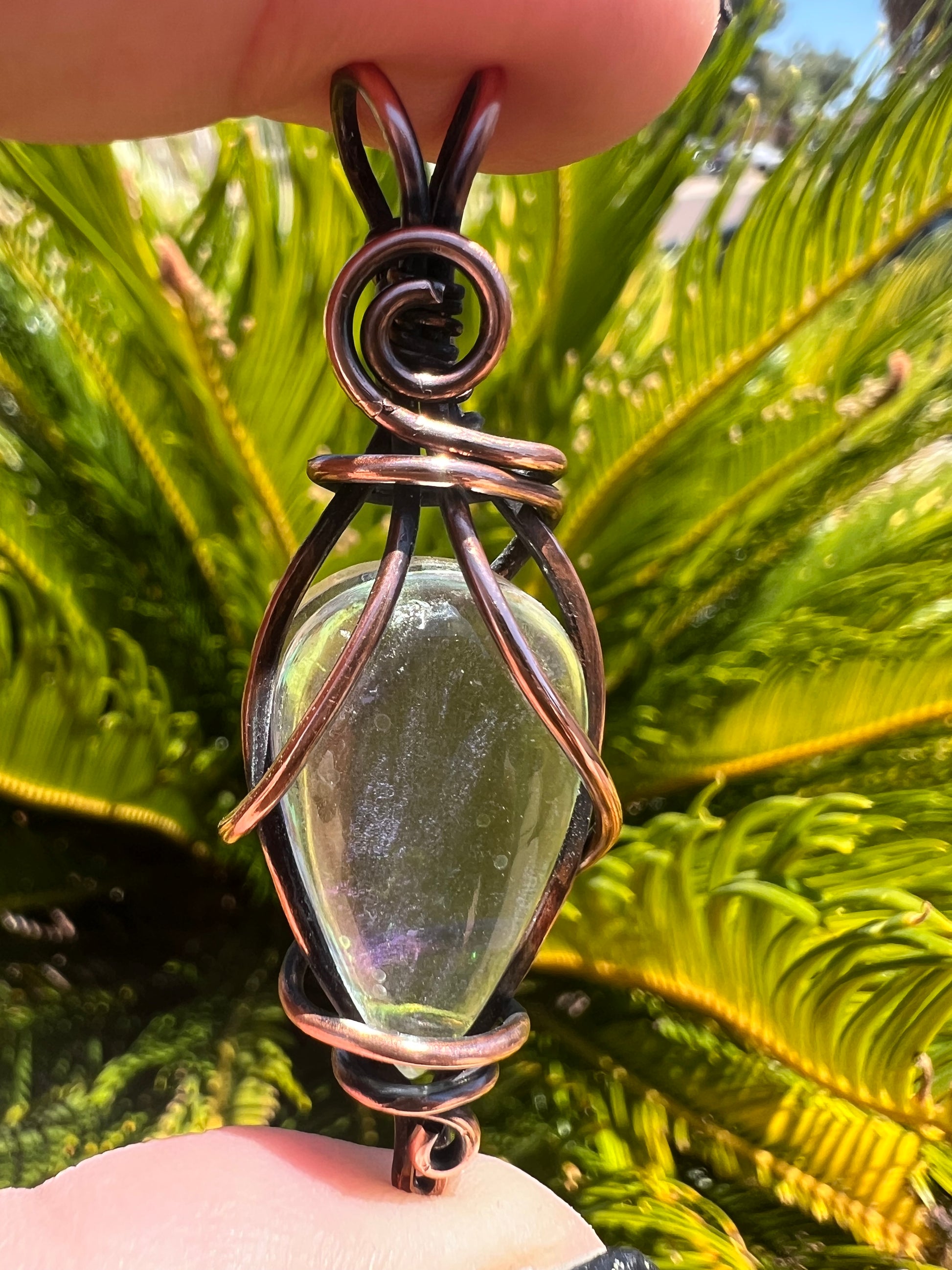 Captured in swirling copper wire, this aura glass glows with quiet mystery—like moonlight in motion. The teardrop shape magnifies inner clarity while the copper wrap grounds and protects. A radiant talisman for those who walk between worlds, seeking truth, peace, and energetic renewal.
