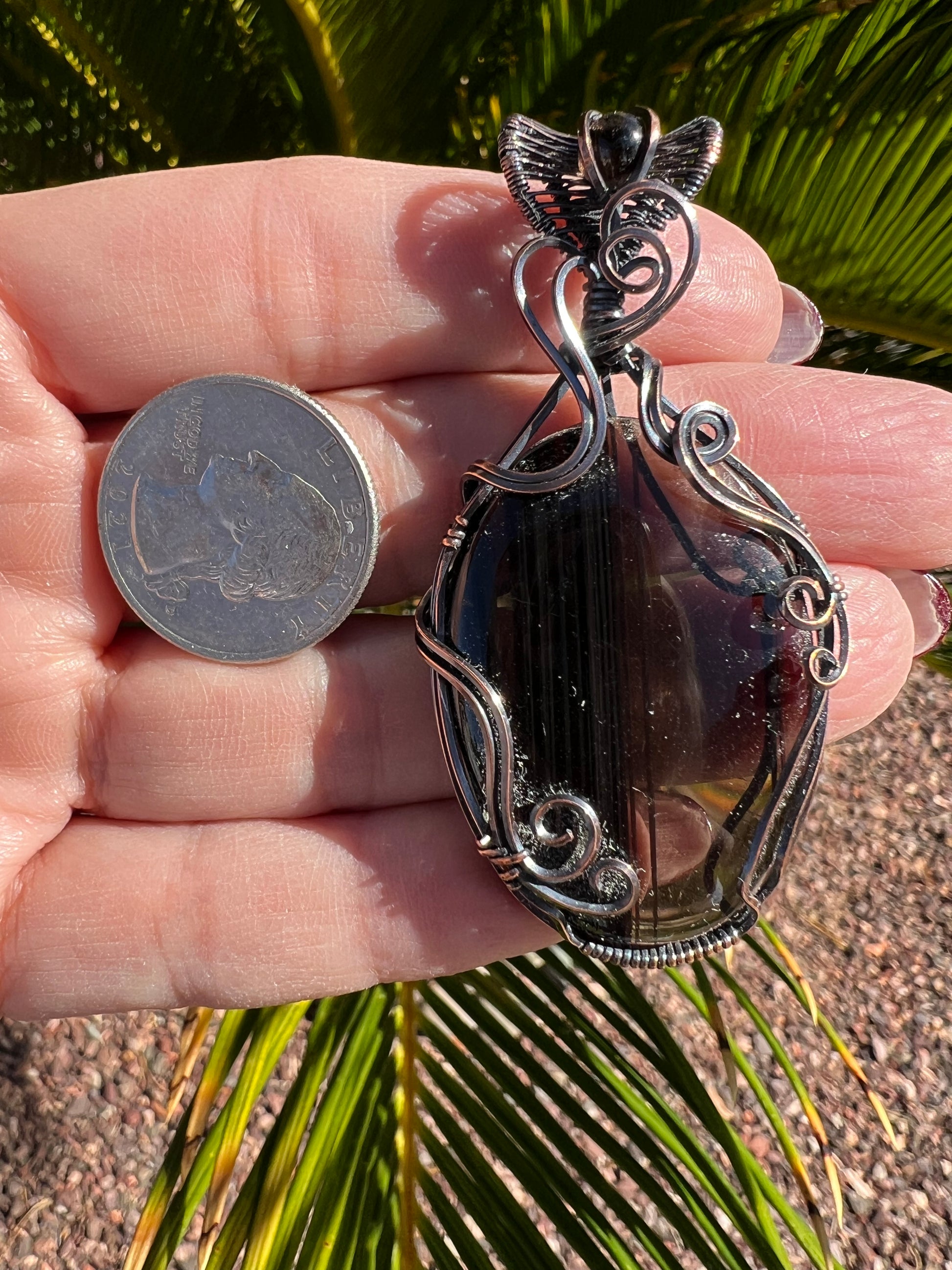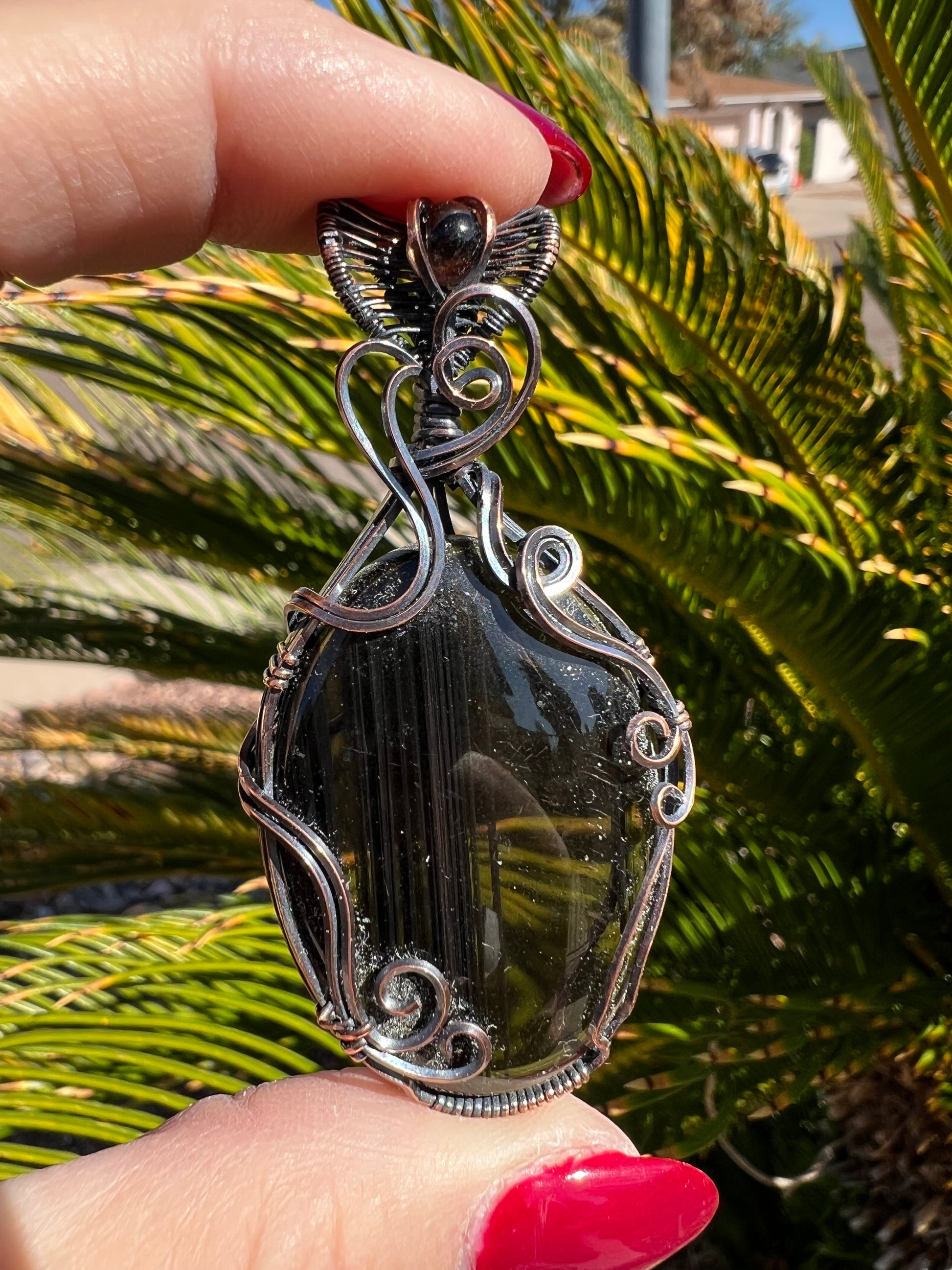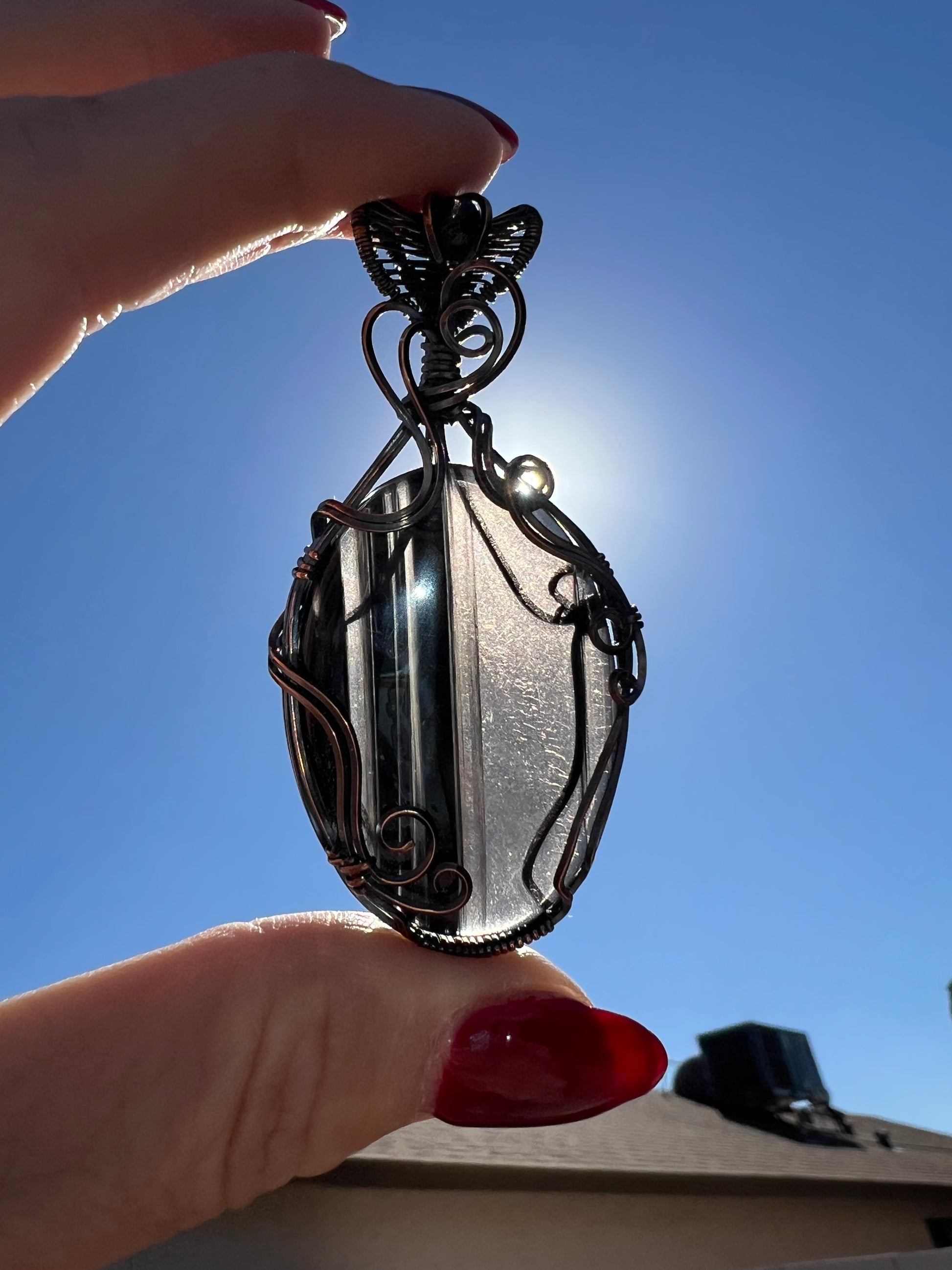 This banded Onyx pendant channels the essence of shadow work, inner strength, and sacred protection. Wrapped in oxidized copper and sterling silver tones, the swirling lines and heart-topped crown give it a dark, elegant beauty — fit for a high priestess or queen of her own magic.