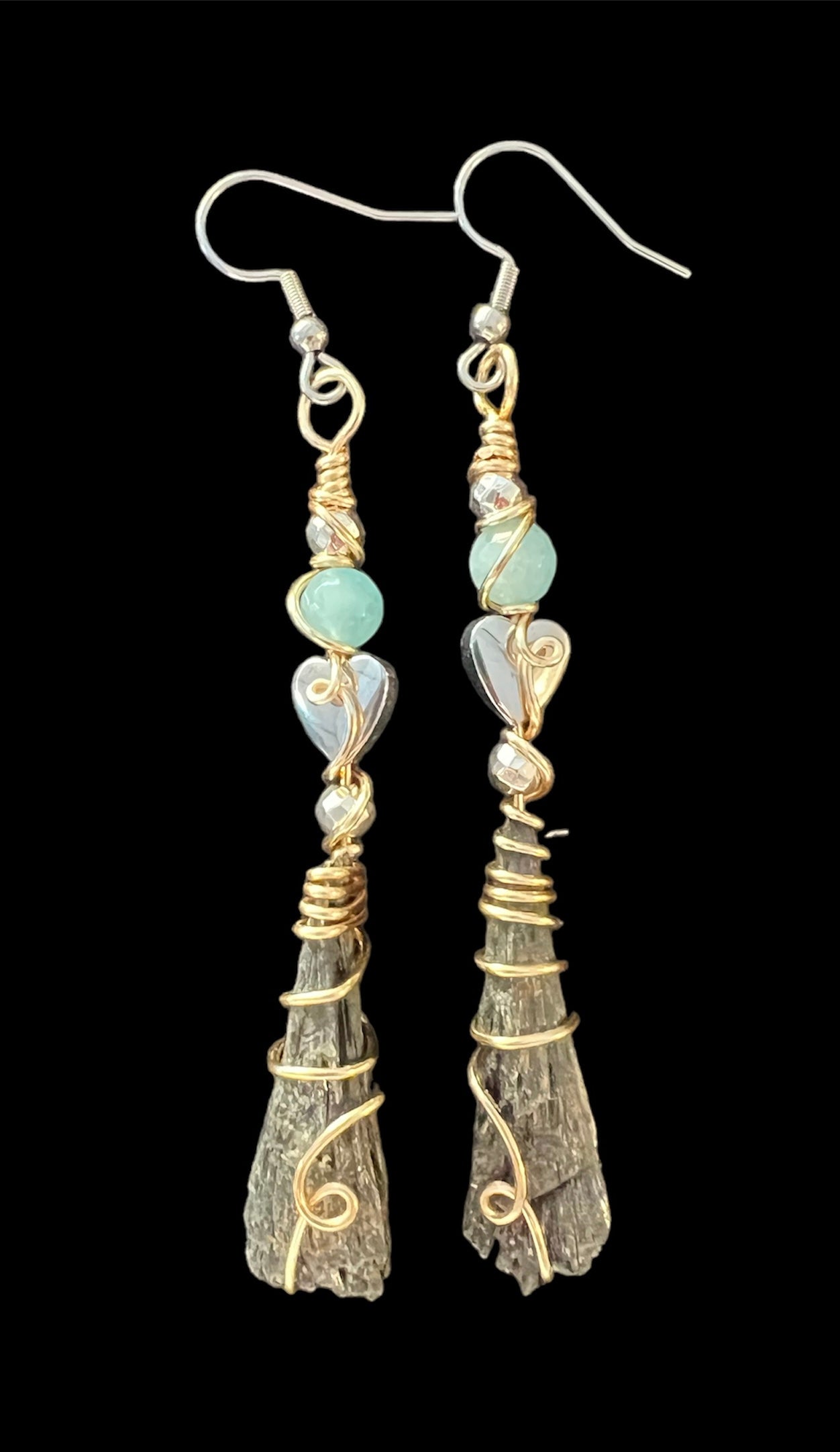 Black Kyanite with Blue Quartz and Hematite Heart bead in Gold color plated Nontarnish wire on a stainless steel ear hooks. 3 1/4 inches long