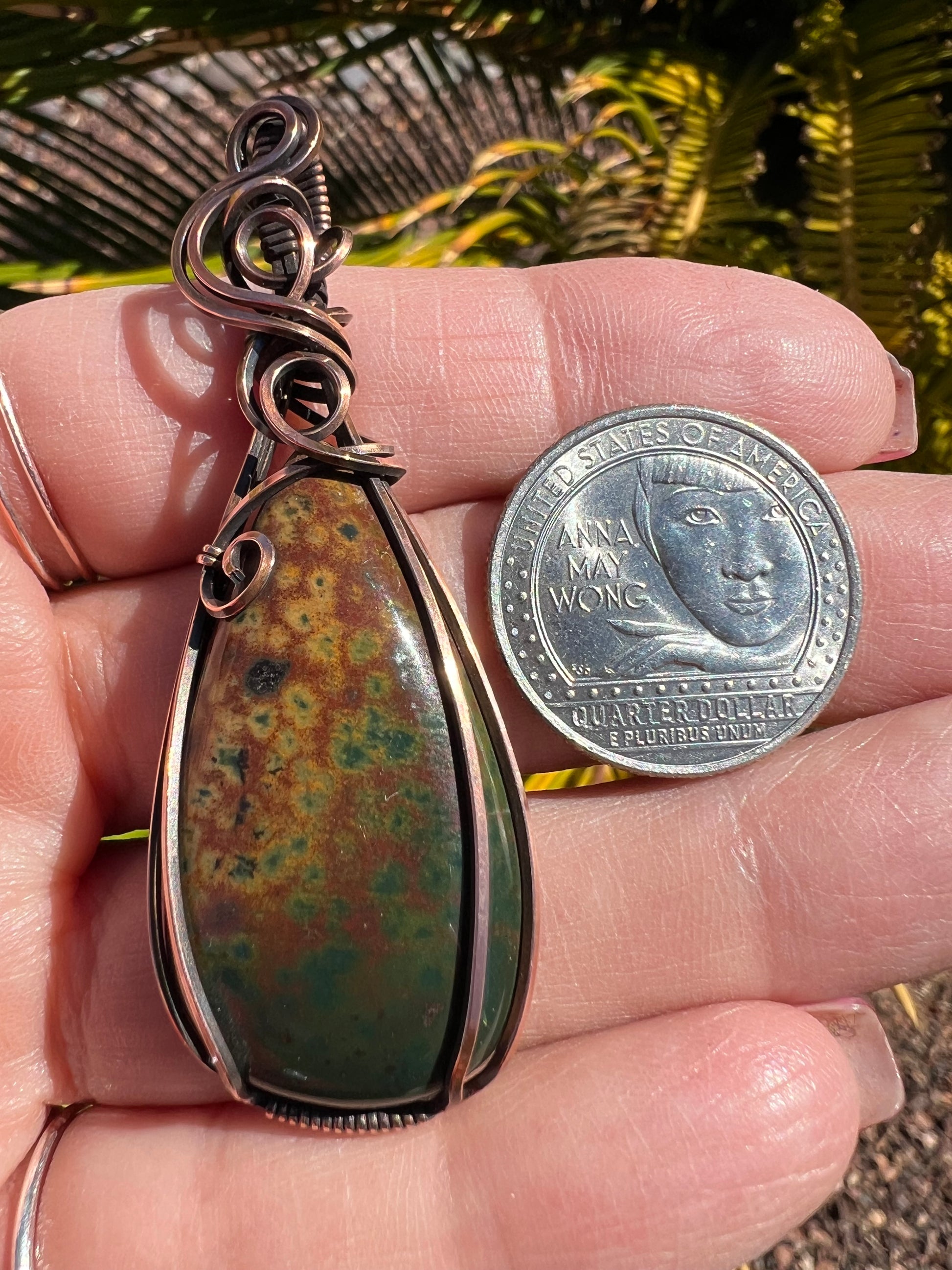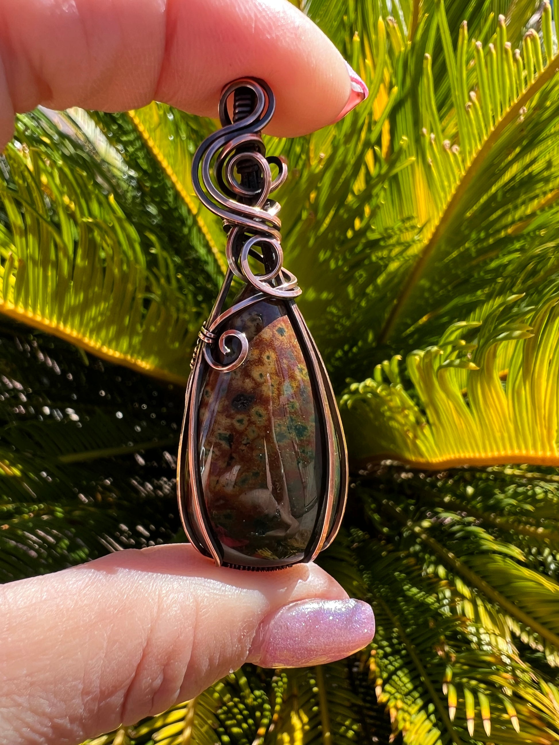 This handmade Bloodstone pendant holds the fierce beauty of nature — mossy greens and deep reds bloom like ancient flowers captured in stone. Wrapped in swirling oxidized copper, it’s a piece that feels both mystical and earthy, strong and sacred