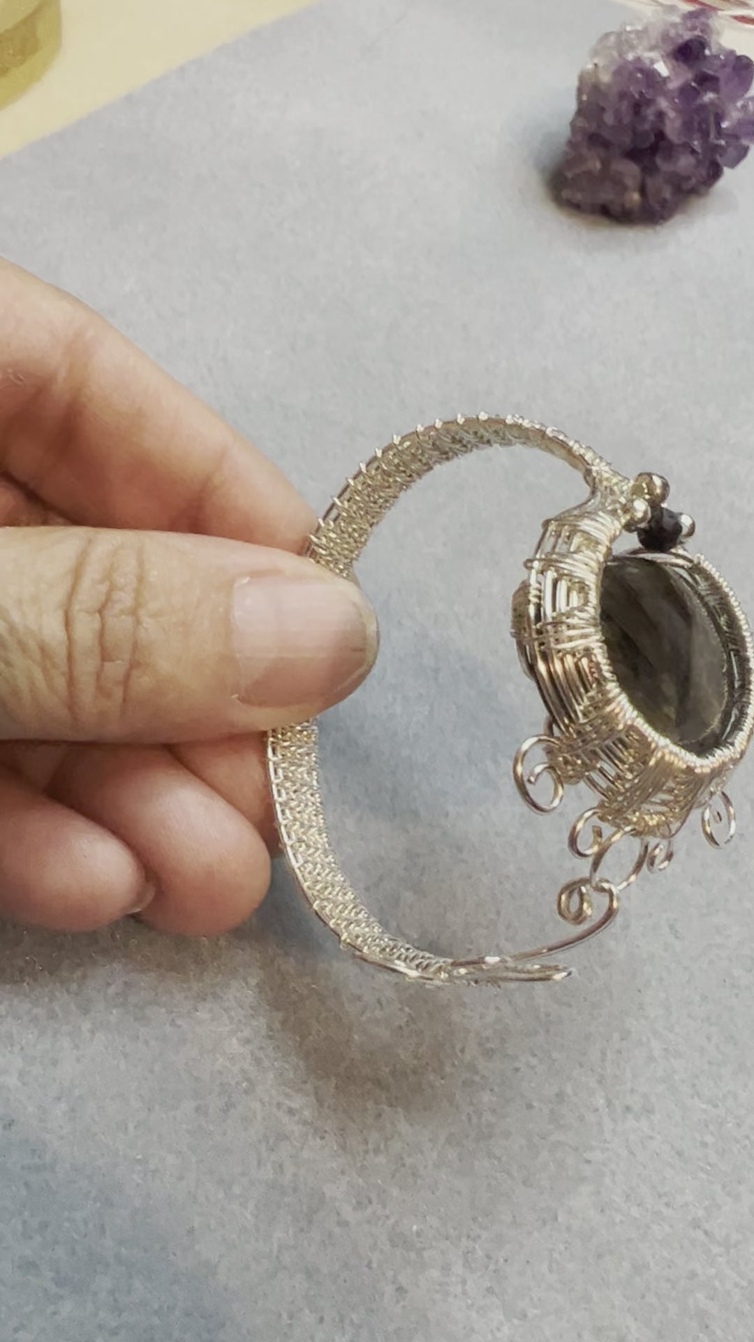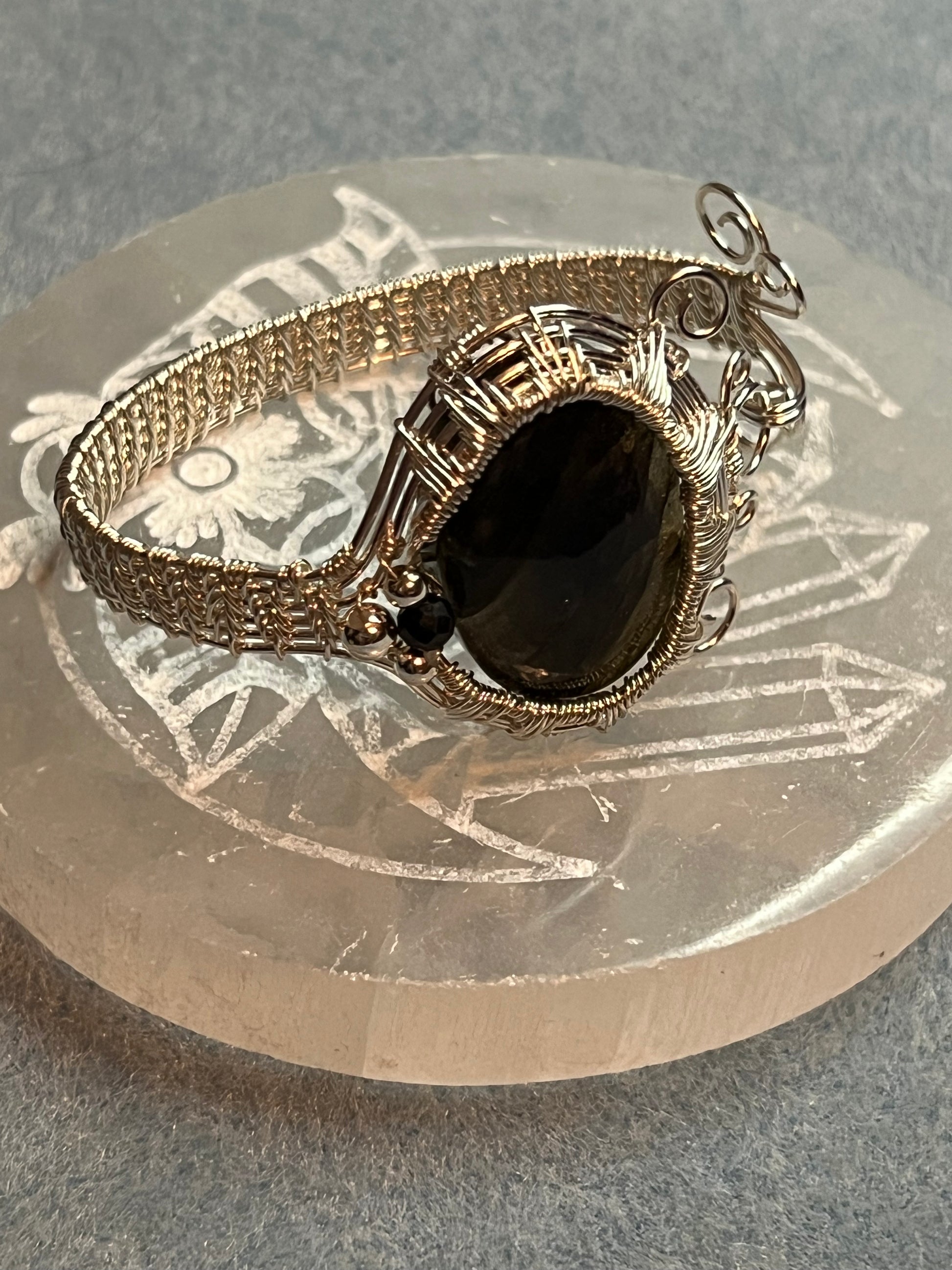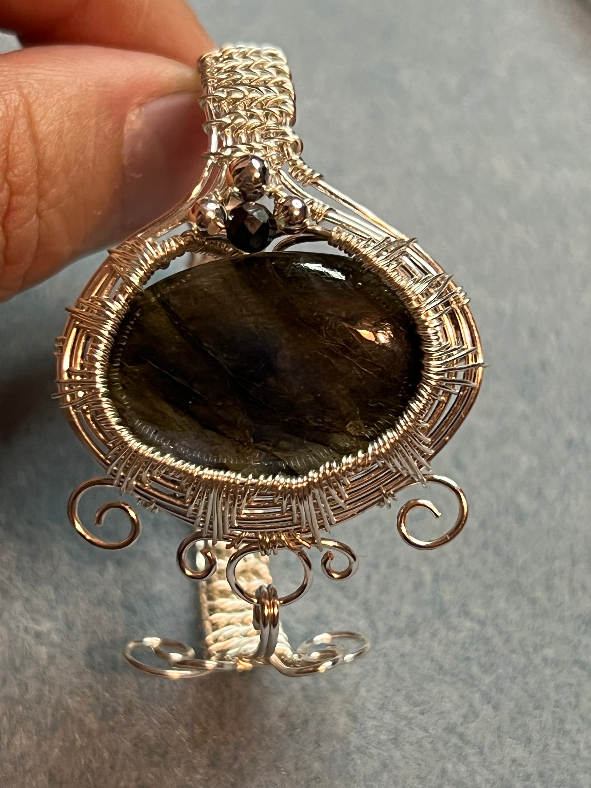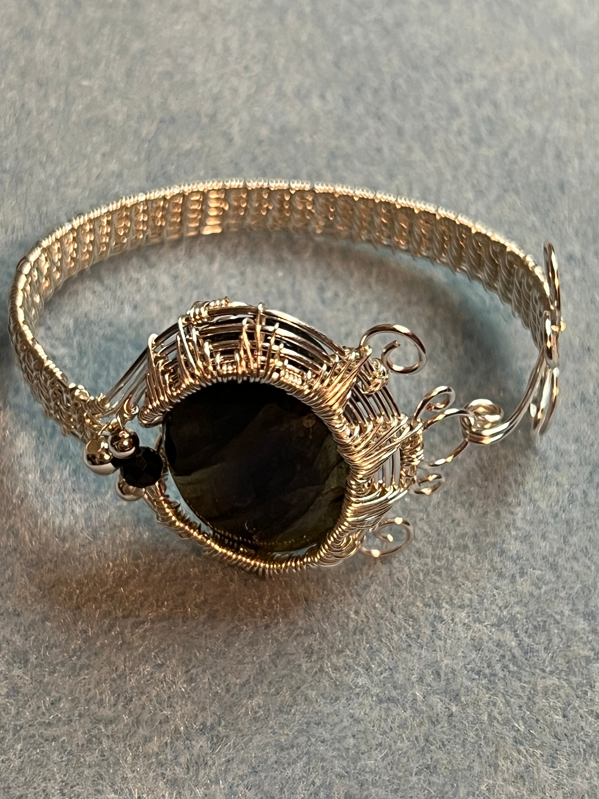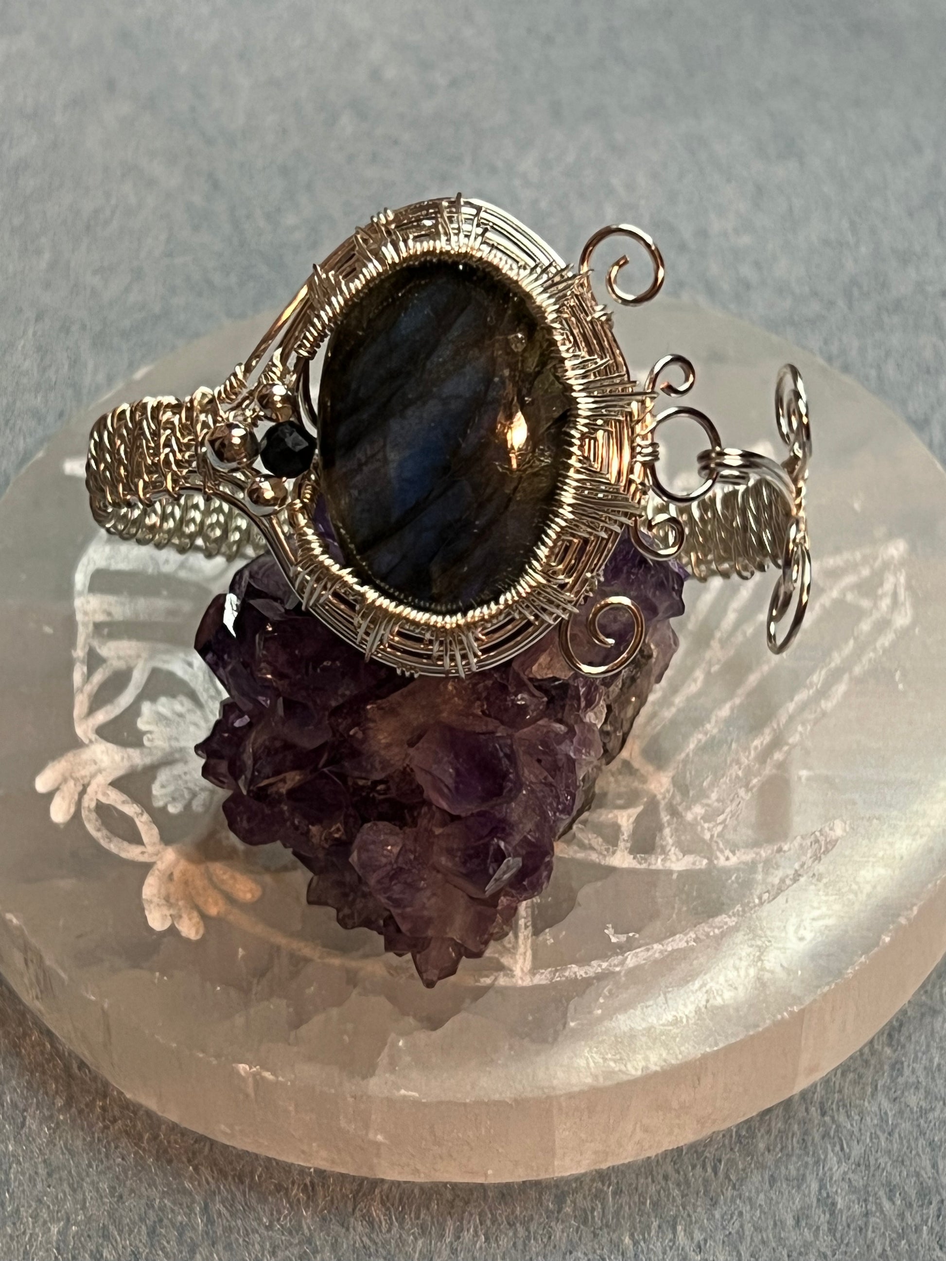 Beautiful Blue Flash Labradorite Accented with A Sapphire bead Hand Woven into a gorgeous Bracelet fits a size 5 in wrist. There is no play in the size it’s exactly 5 inches.