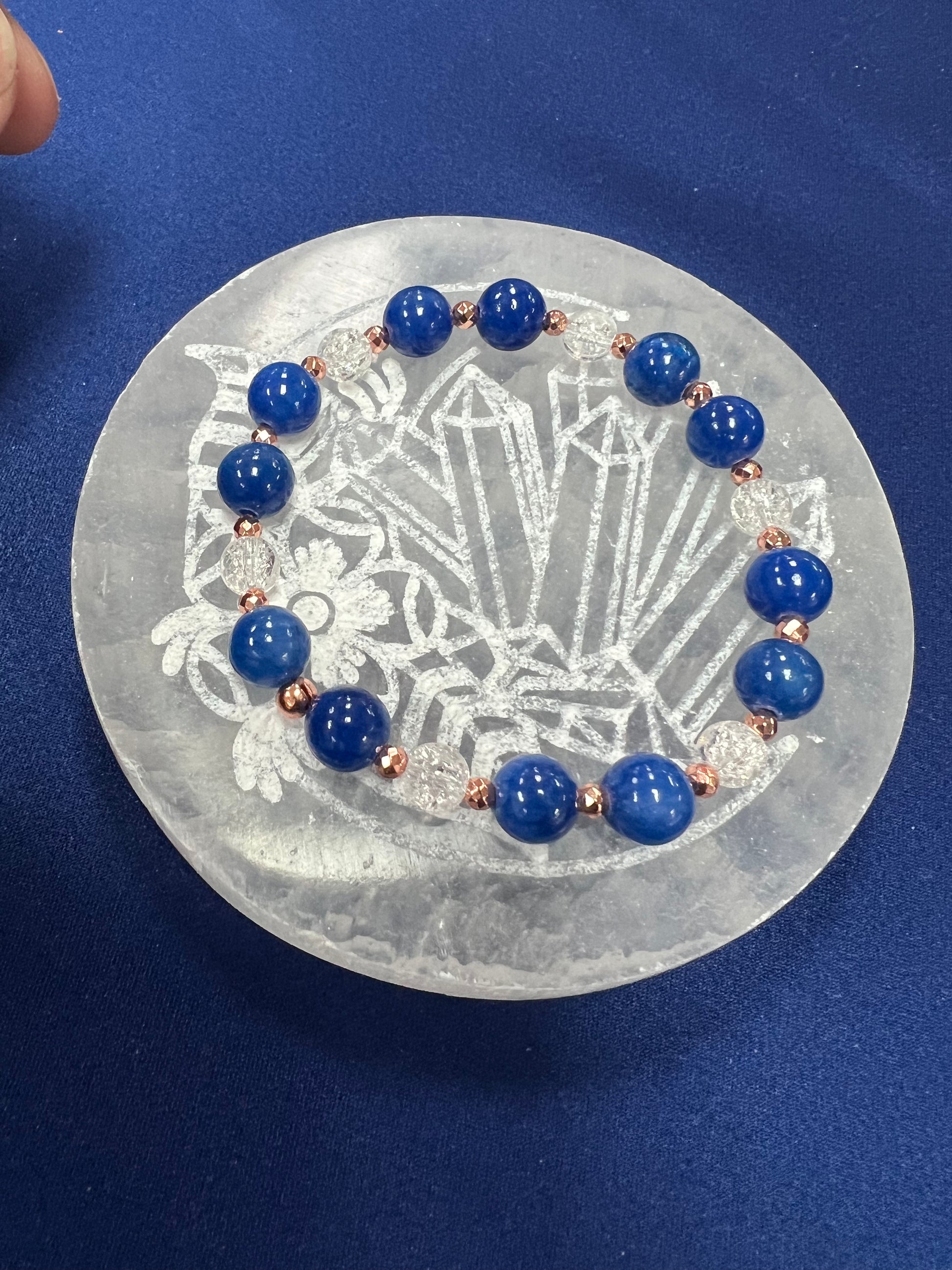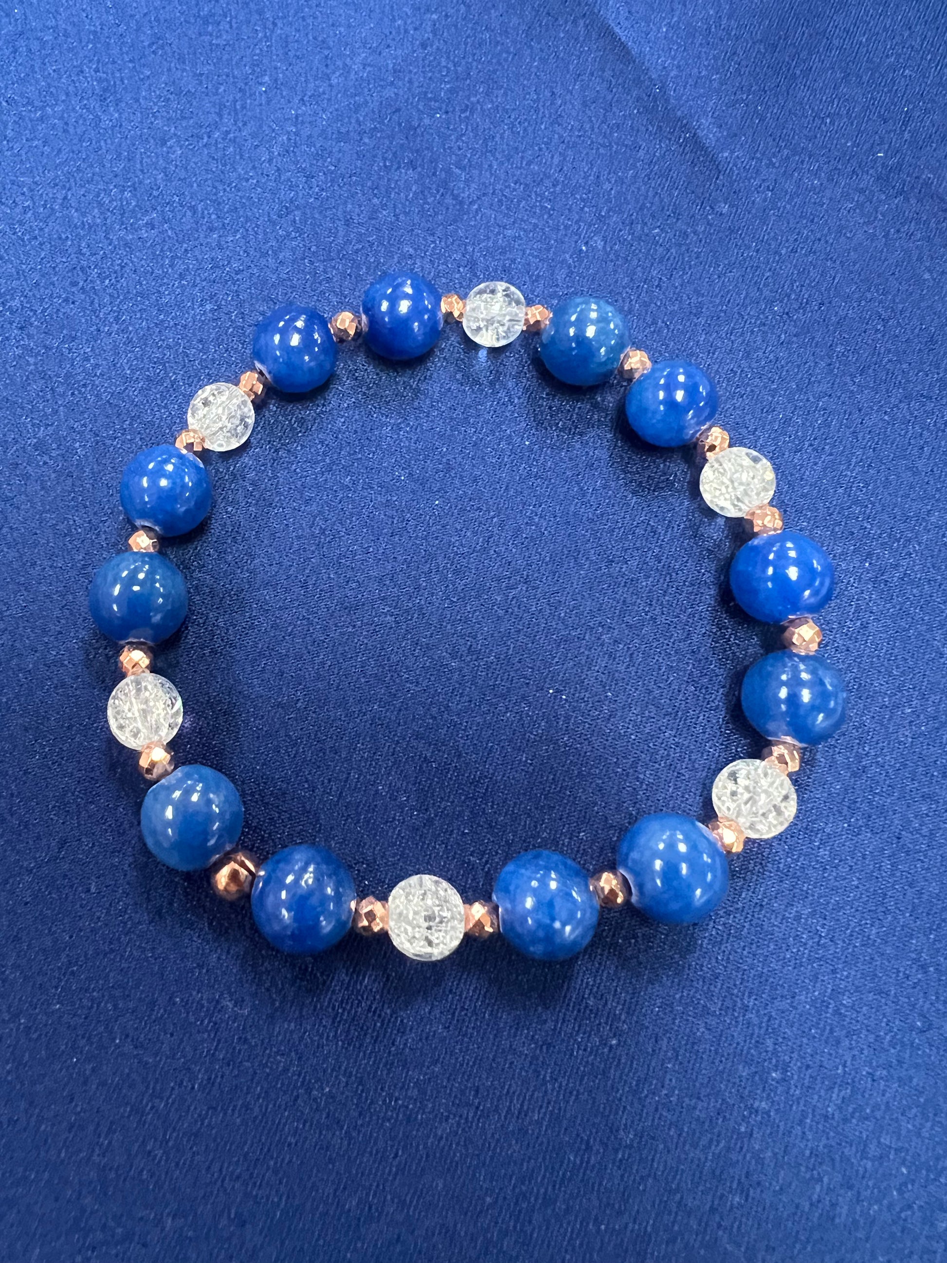 8mm Blue Jade 6 mm Crackle Quartz 3mm Copper colored Faceted Hematite beads on 0.8mm clear Stretchy Cord fits 7 inch wrist.