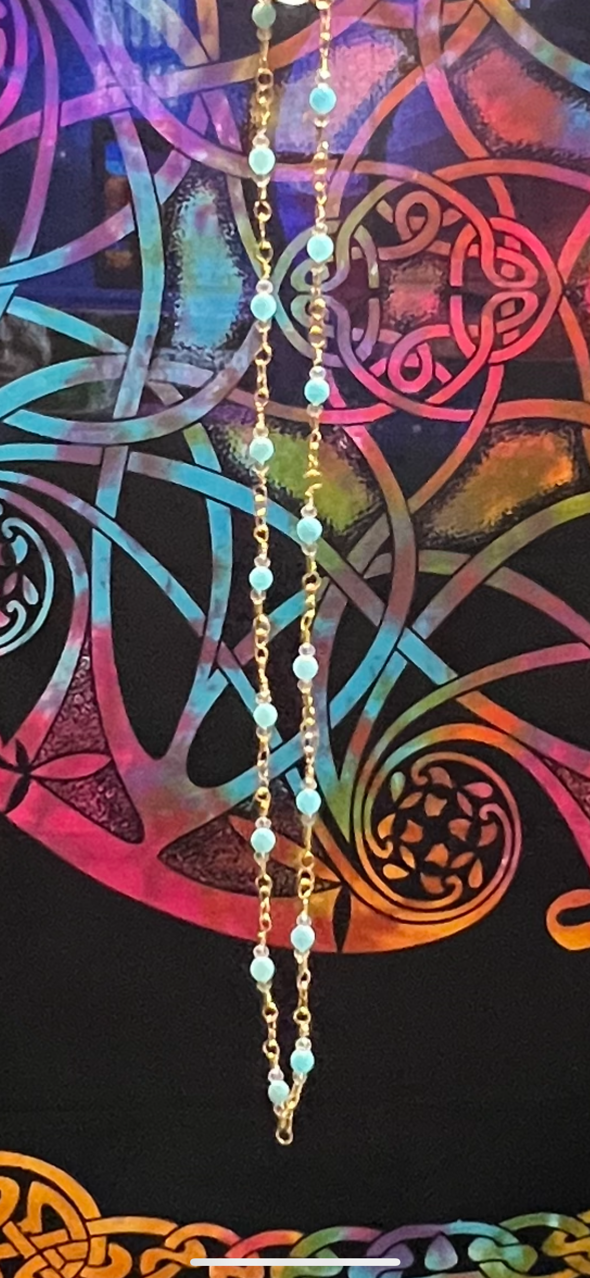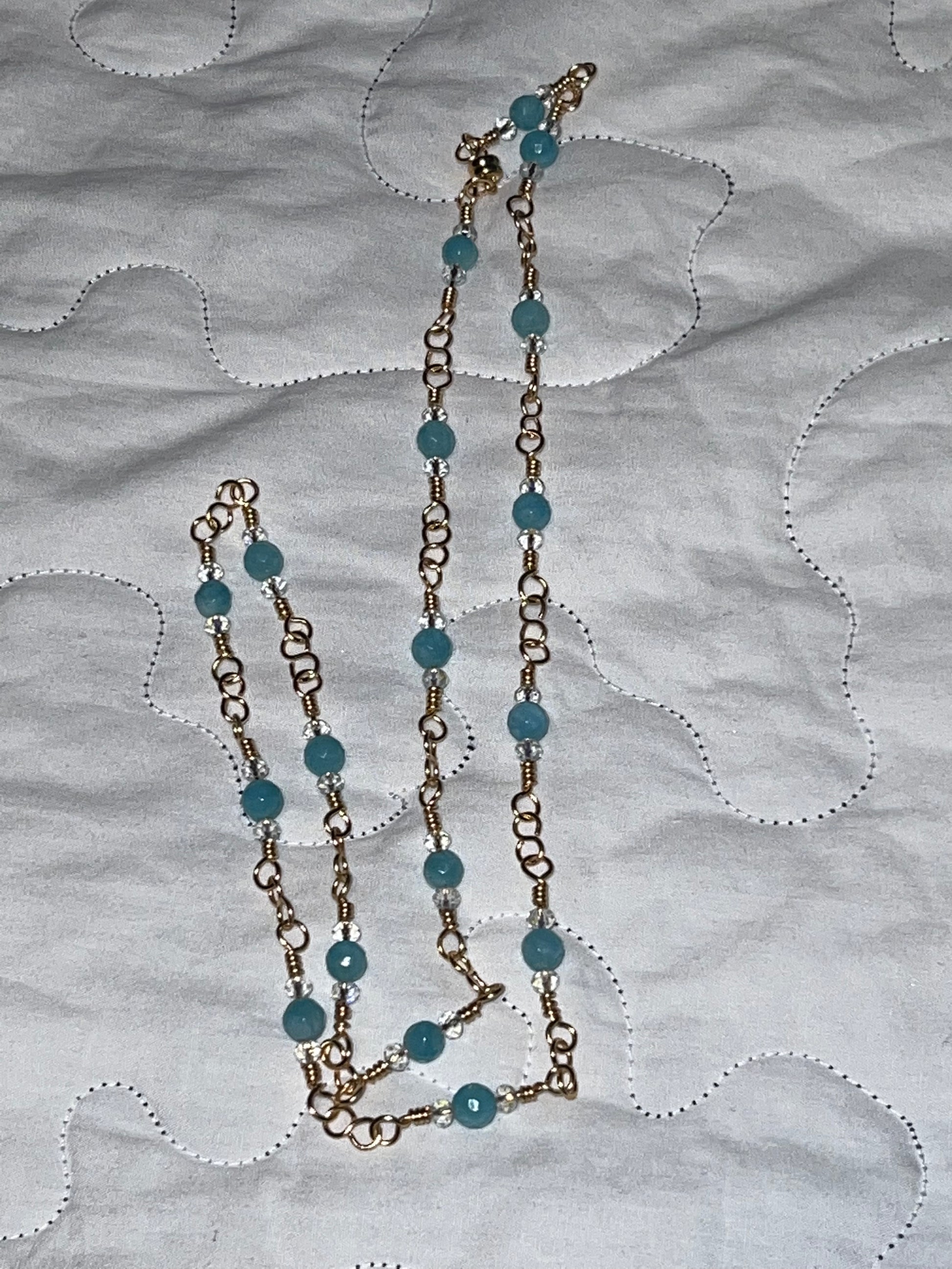 Blue Quartz accented with Crystal Aroura Borealis beads on 24 in handmade chain of gold colored silver plated copper Non-tarnish wire.