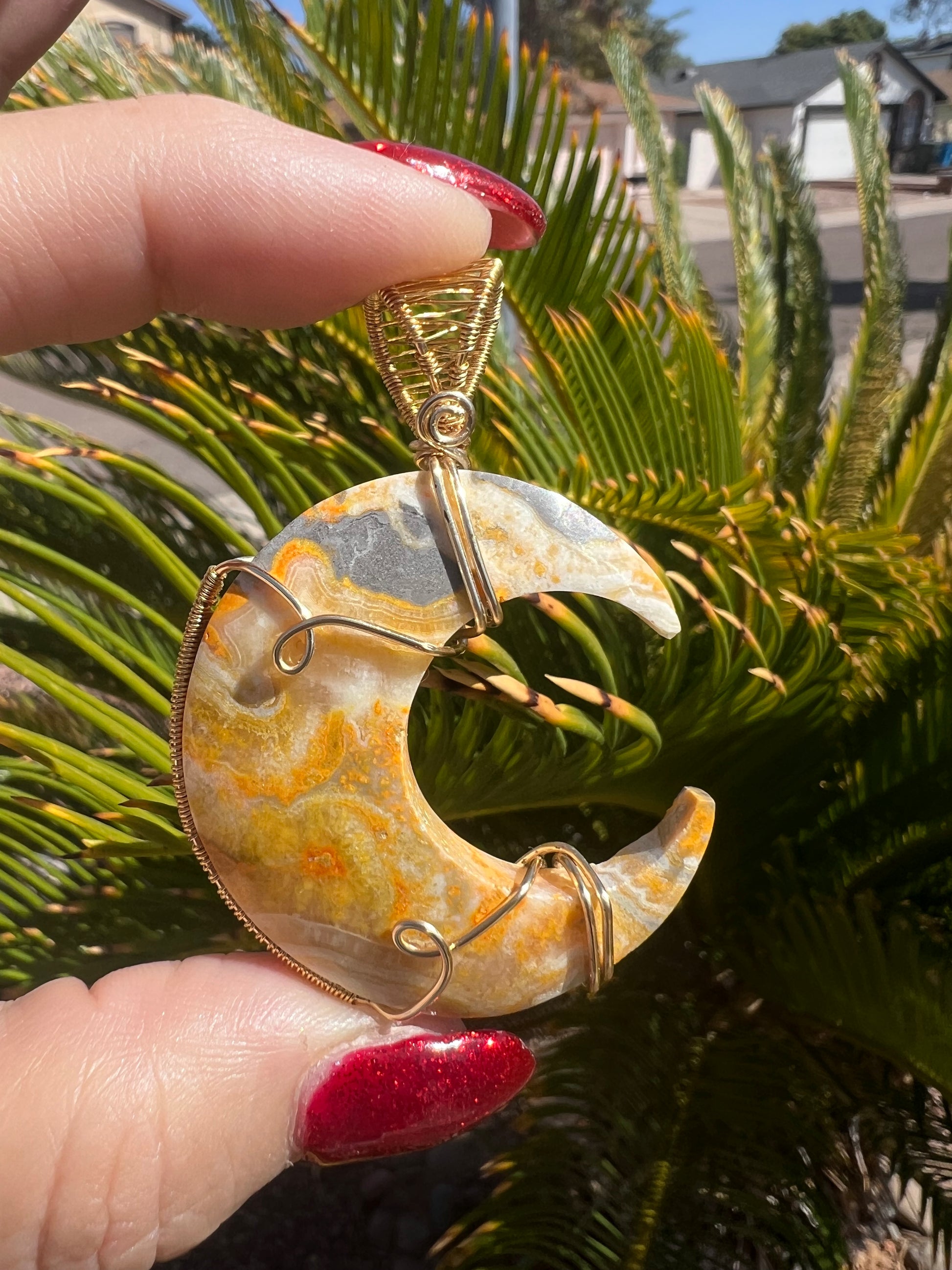 Bumblebee Jasper Crescent Moon wrapped in Gold color Parawire. 2.5 inches long 1 3/4 inches wide