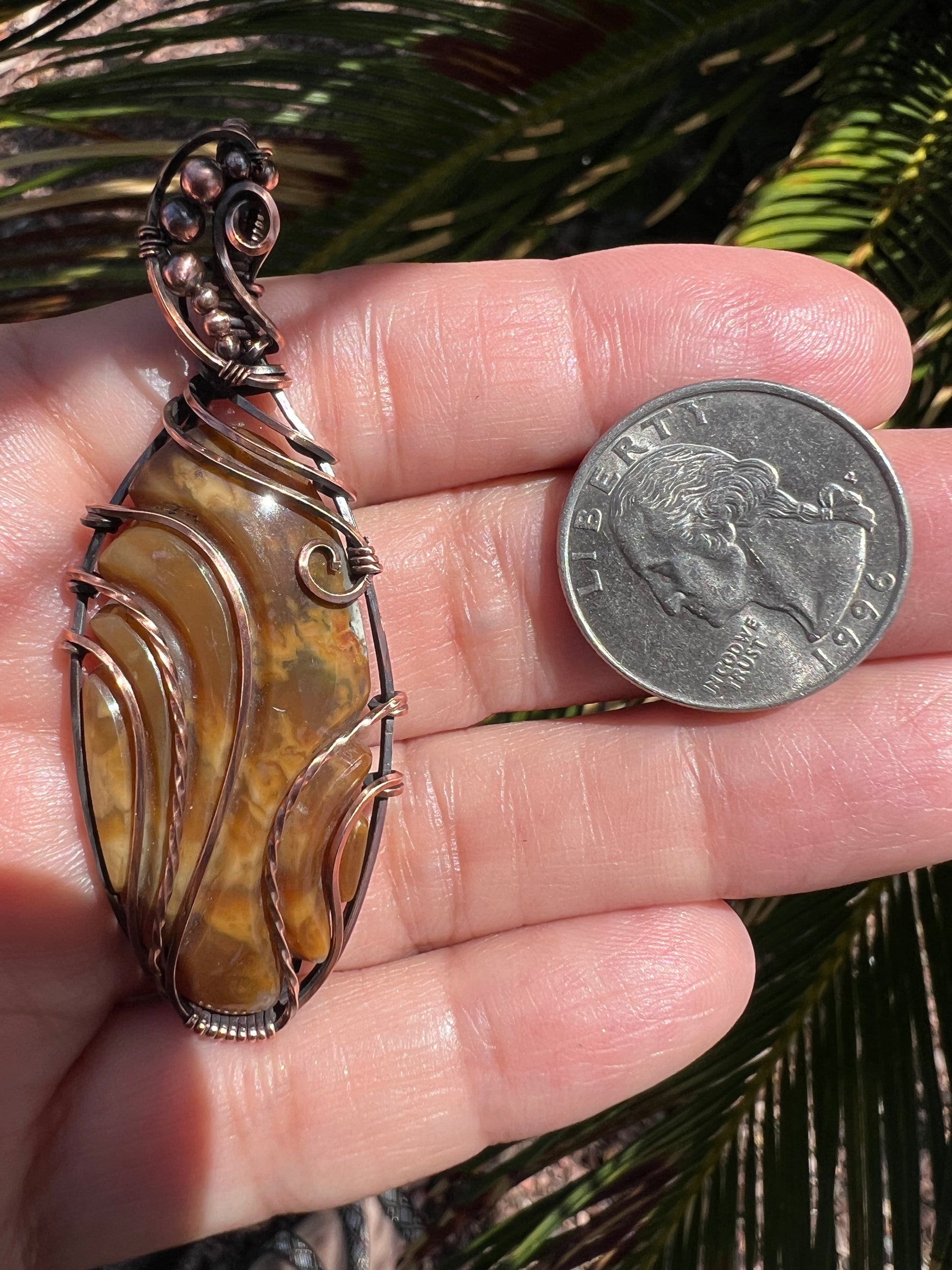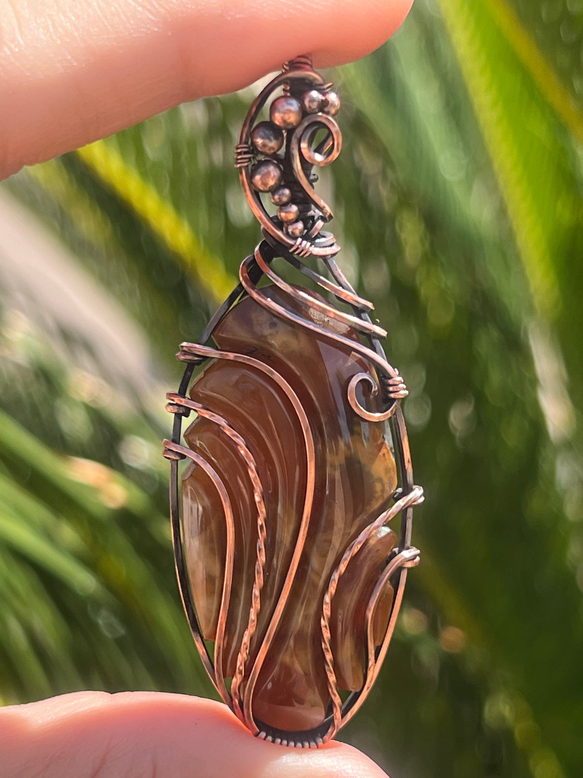 Carved Agate Wrapped in Oxidized Bare Copper Wire