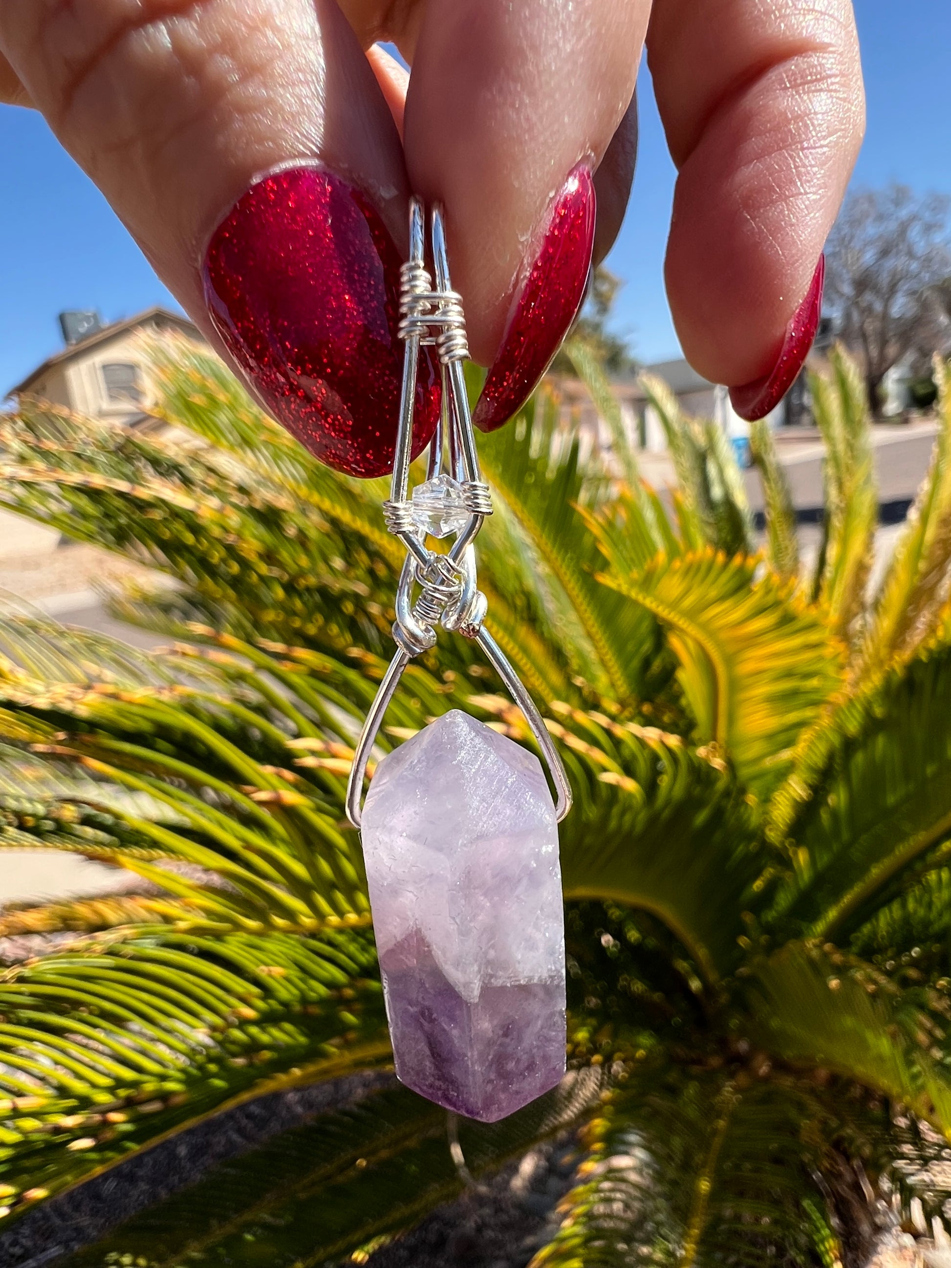Chevron Amethyst Double Point in Silver Plated Parawire. It’s 2 3/4 inches long.