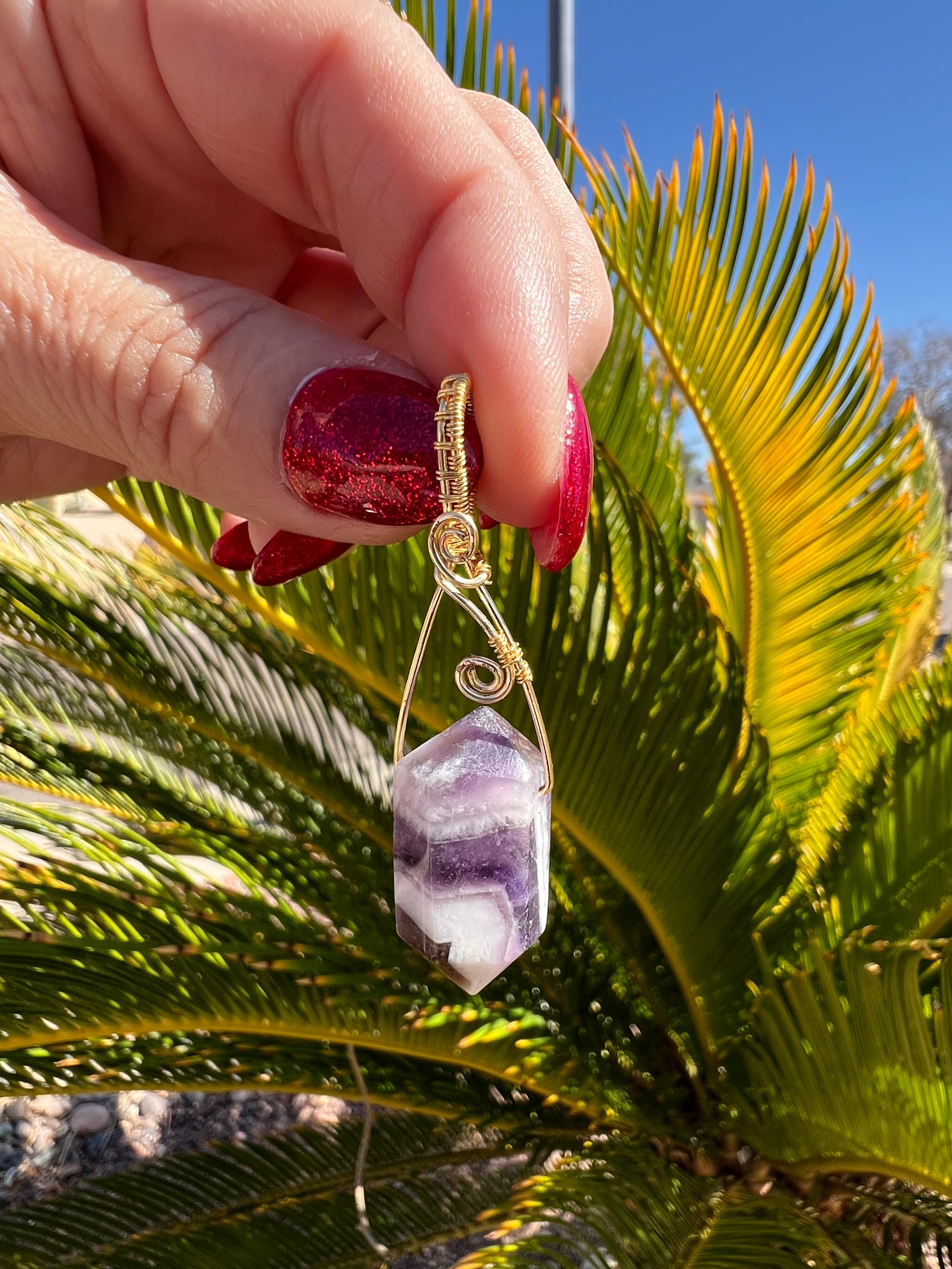 A little smaller then the rest this Chevron Amethyst Double Point is wrapped in Gold Color Parawire. It’s 2 1/4 inches long.