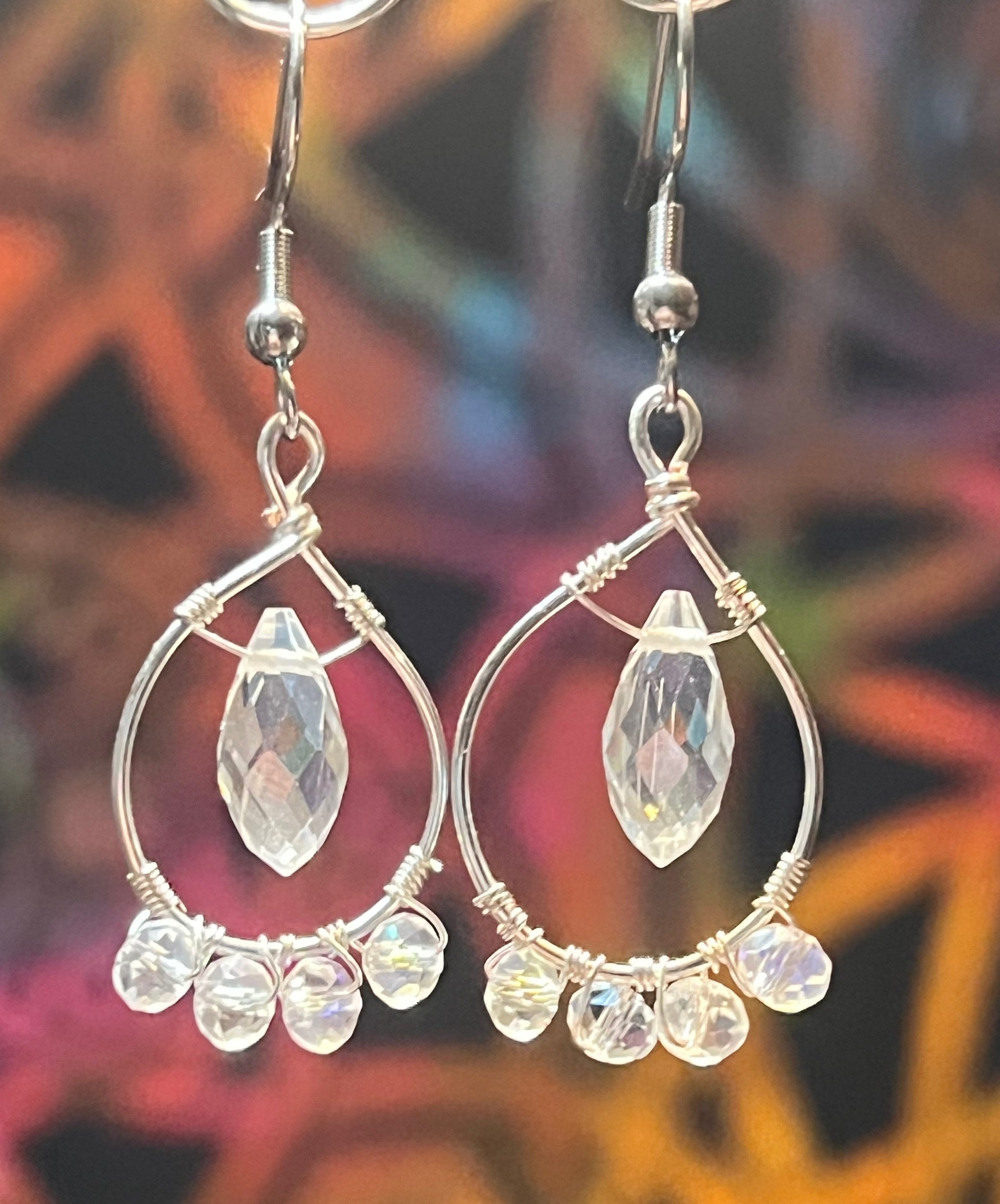 Crystal briolette on Silverplated No tarnish wire hoop wrapped with Crystal Aurora Borealis beads