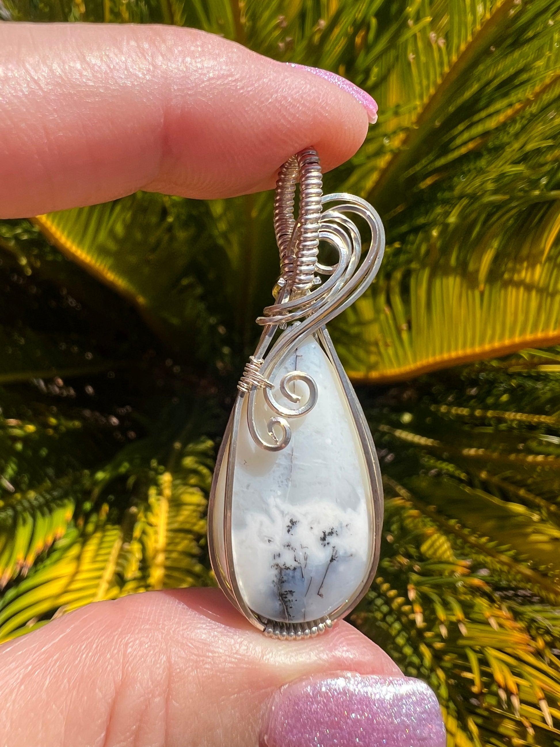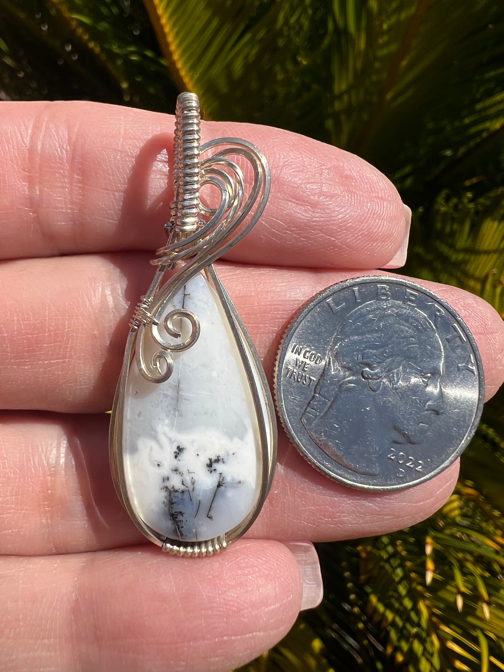 Like a quiet forest wrapped in snow, this dendritic Tiger Opal whispers of stillness, reflection, and the hidden messages of nature. Its soft, milky white base is brushed with inky tree-like inclusions, all held in a gentle sterling silver embrace. A peaceful talisman for grounding, meditation, and connecting to nature’s quiet wisdom.