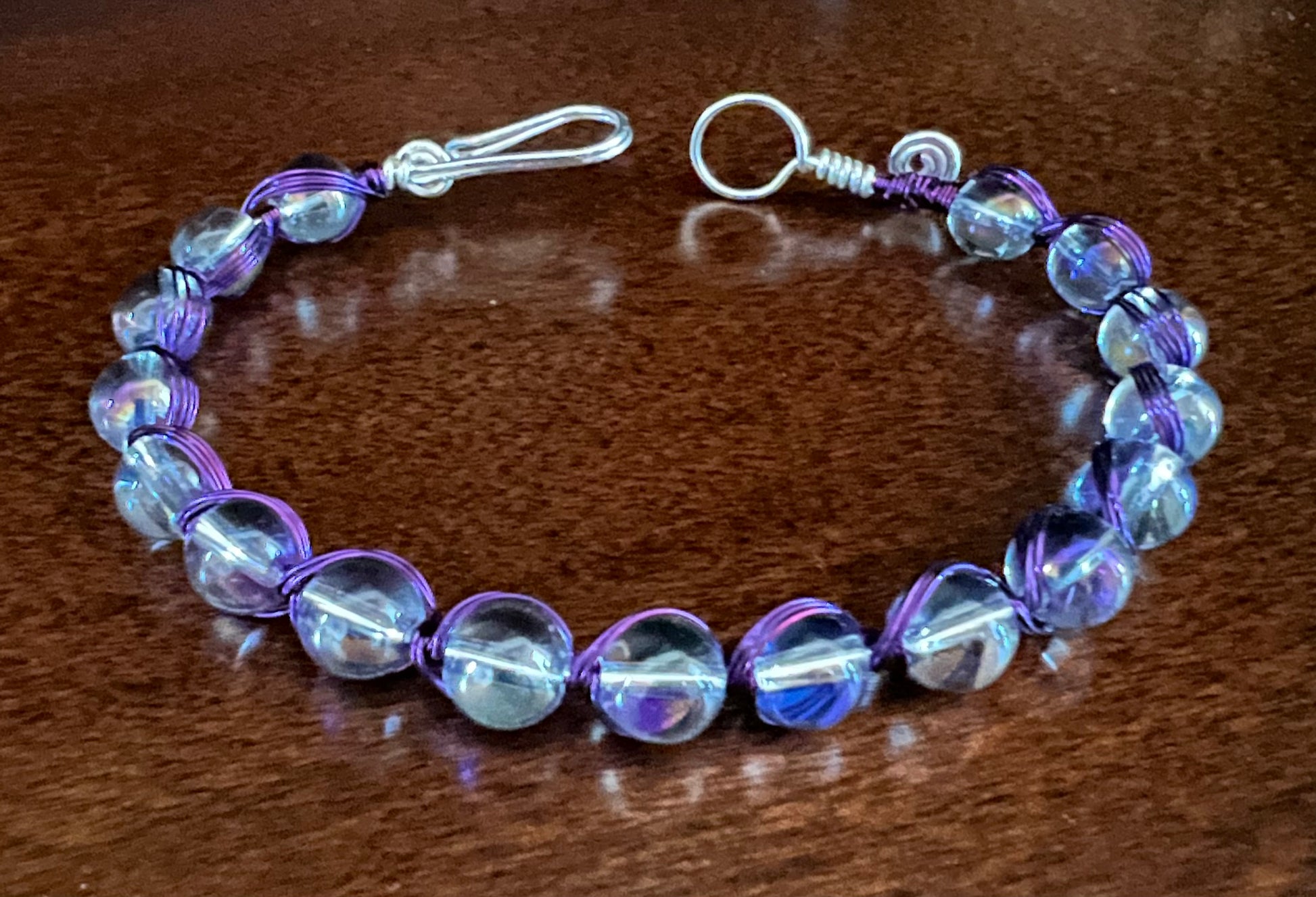 Crystal beads with a purple cast wrapped in purple coated non-tarnish wire on Silver non-tarnish wire, handmade hook clasp. Size 8”