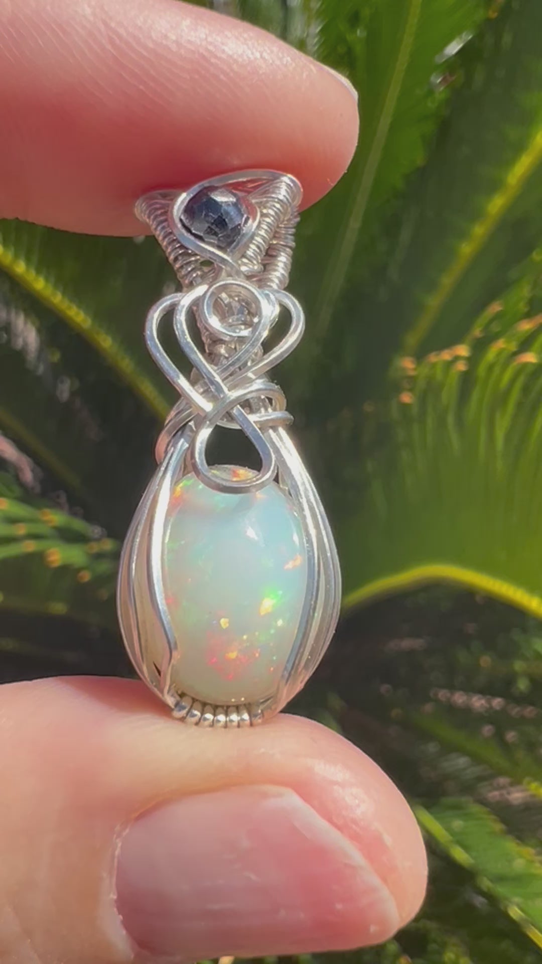 Ethiopian Opal w/ Sapphire accent bed on the bail Wrapped in Solid Sterling Silver wire 1.5 inches long