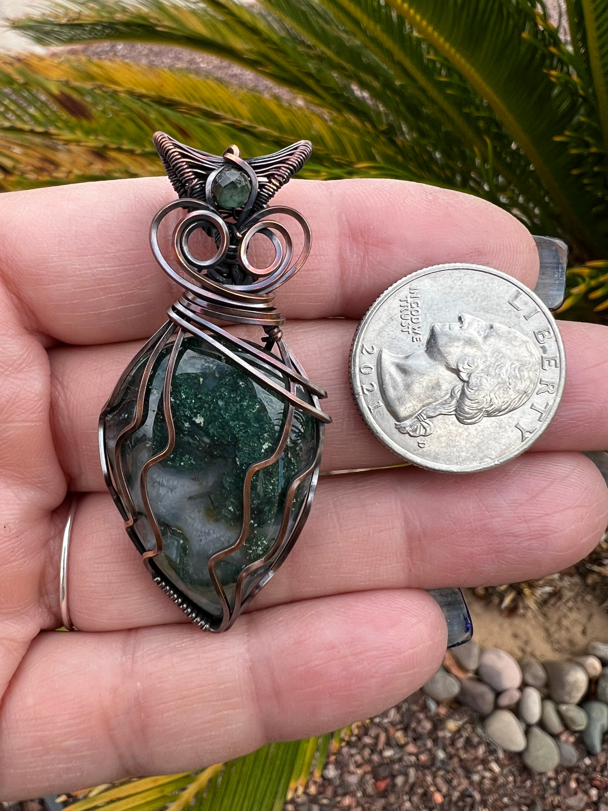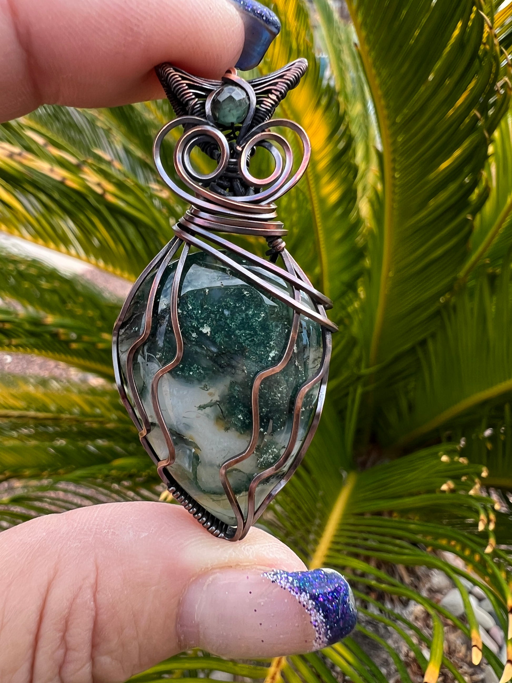 Green Moss Agate with Emerald accent bead wrapped in Bare Copper Wire oxidized and polished for an antique look.