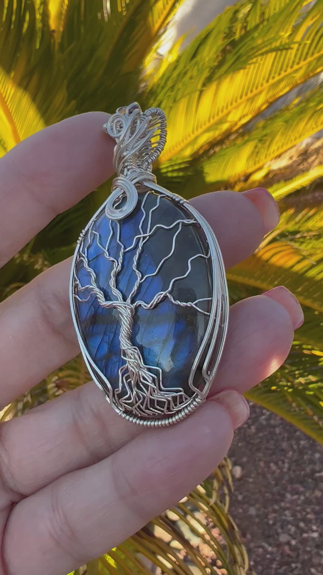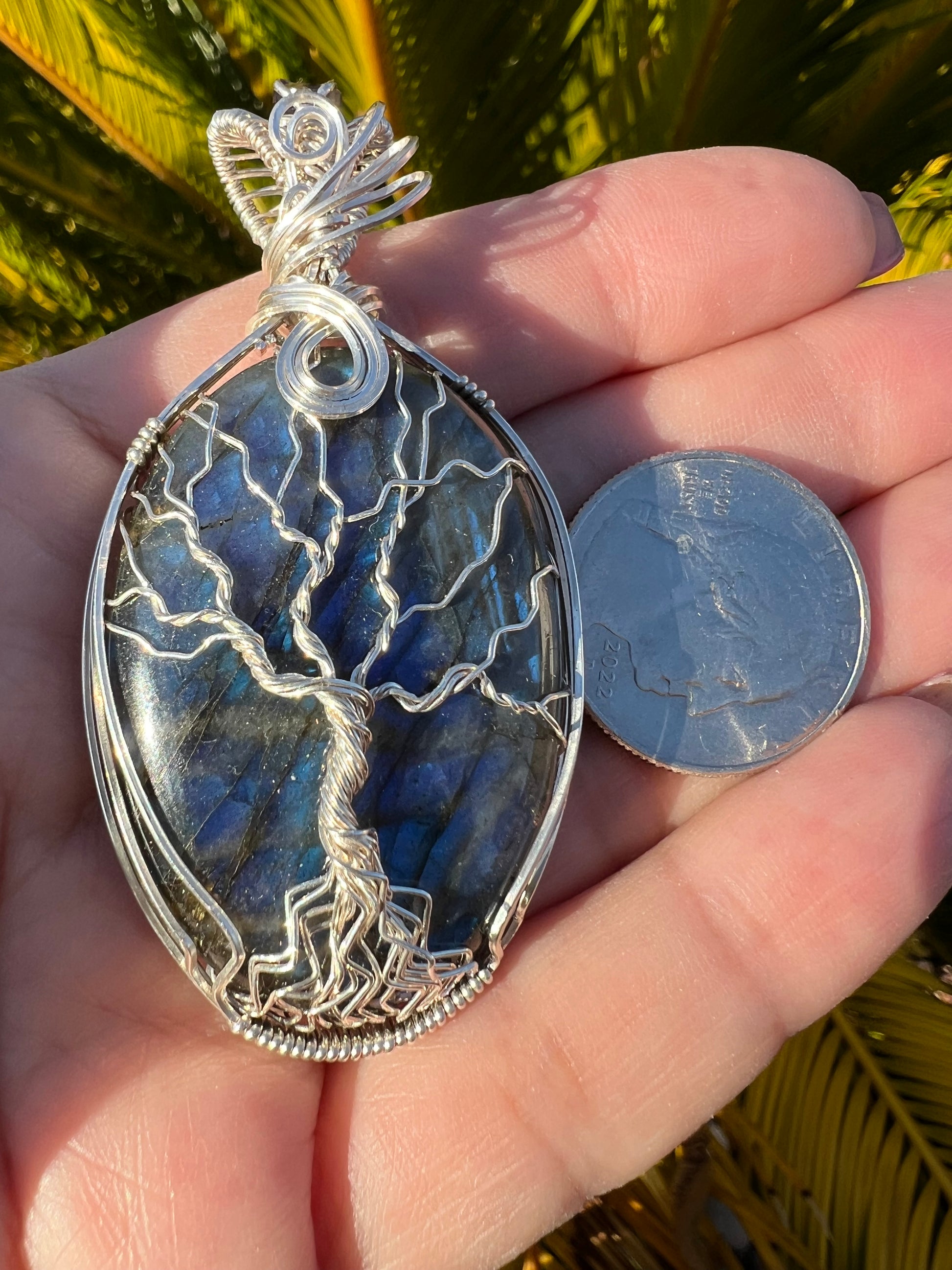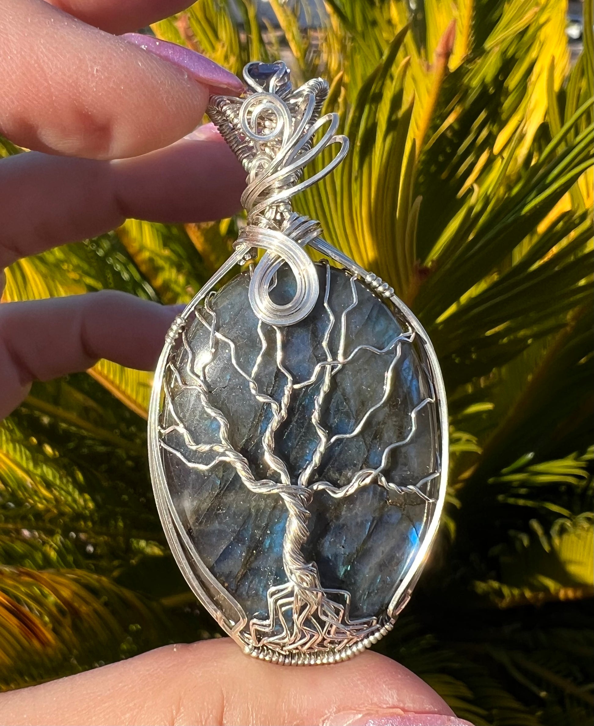 This Tree of Life pendant is a beacon of deep intuition and soul-rooted power. A radiant blue-flash labradorite anchors the piece with stormy cosmic shimmer, while sterling silver branches and roots reach and twist with precision and grace. Topping the design, a faceted iolite sits like a third-eye gem above the crown — clear, deep, and full of insight.