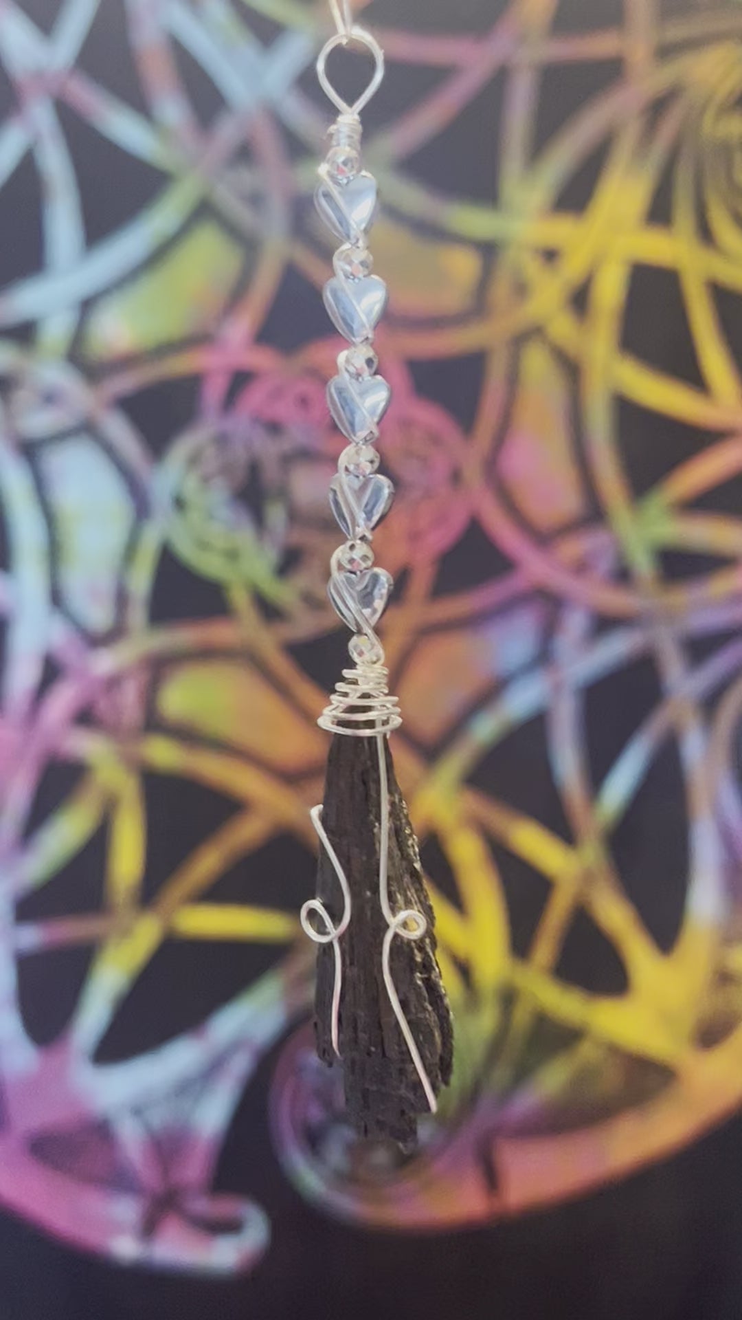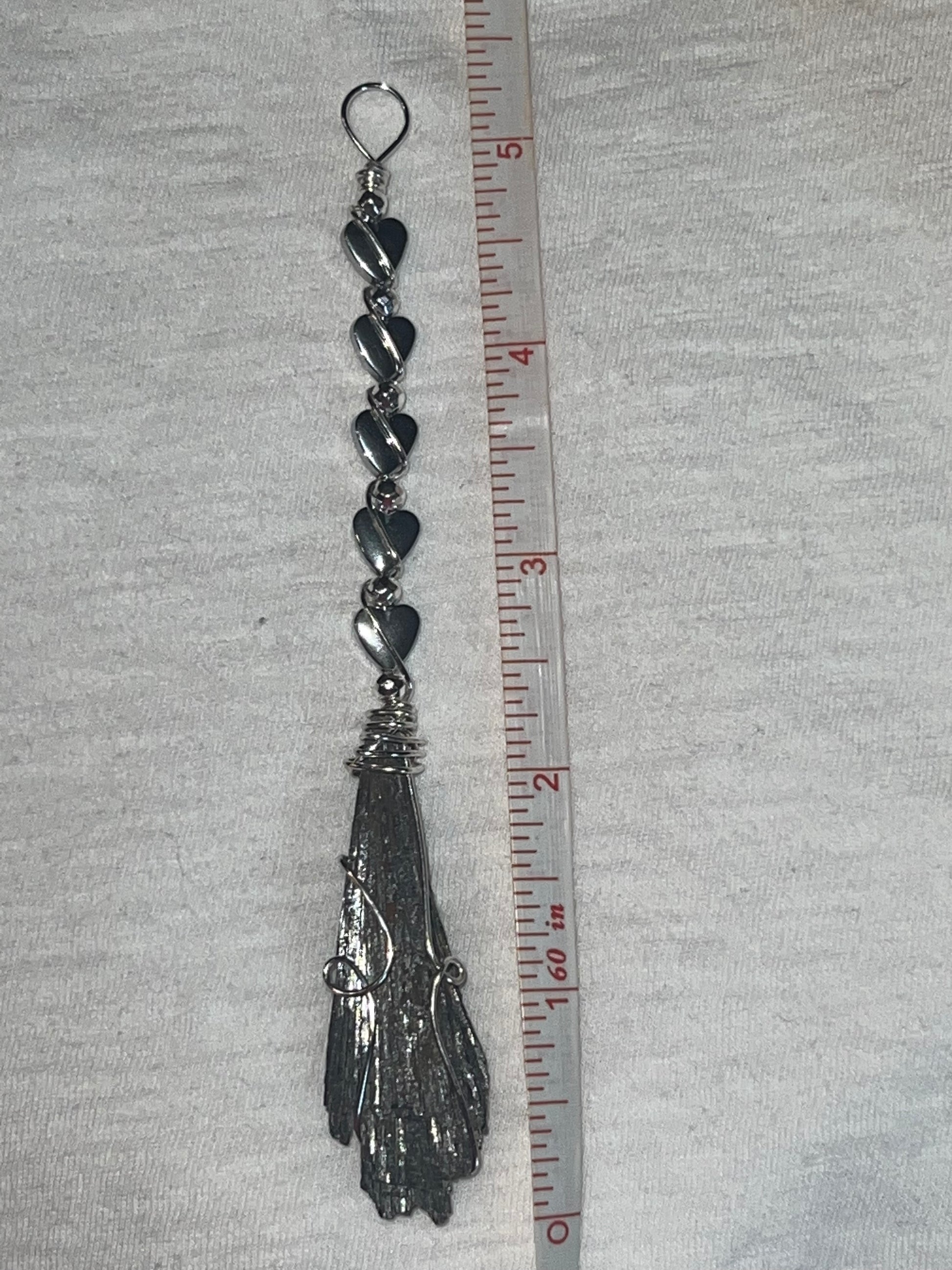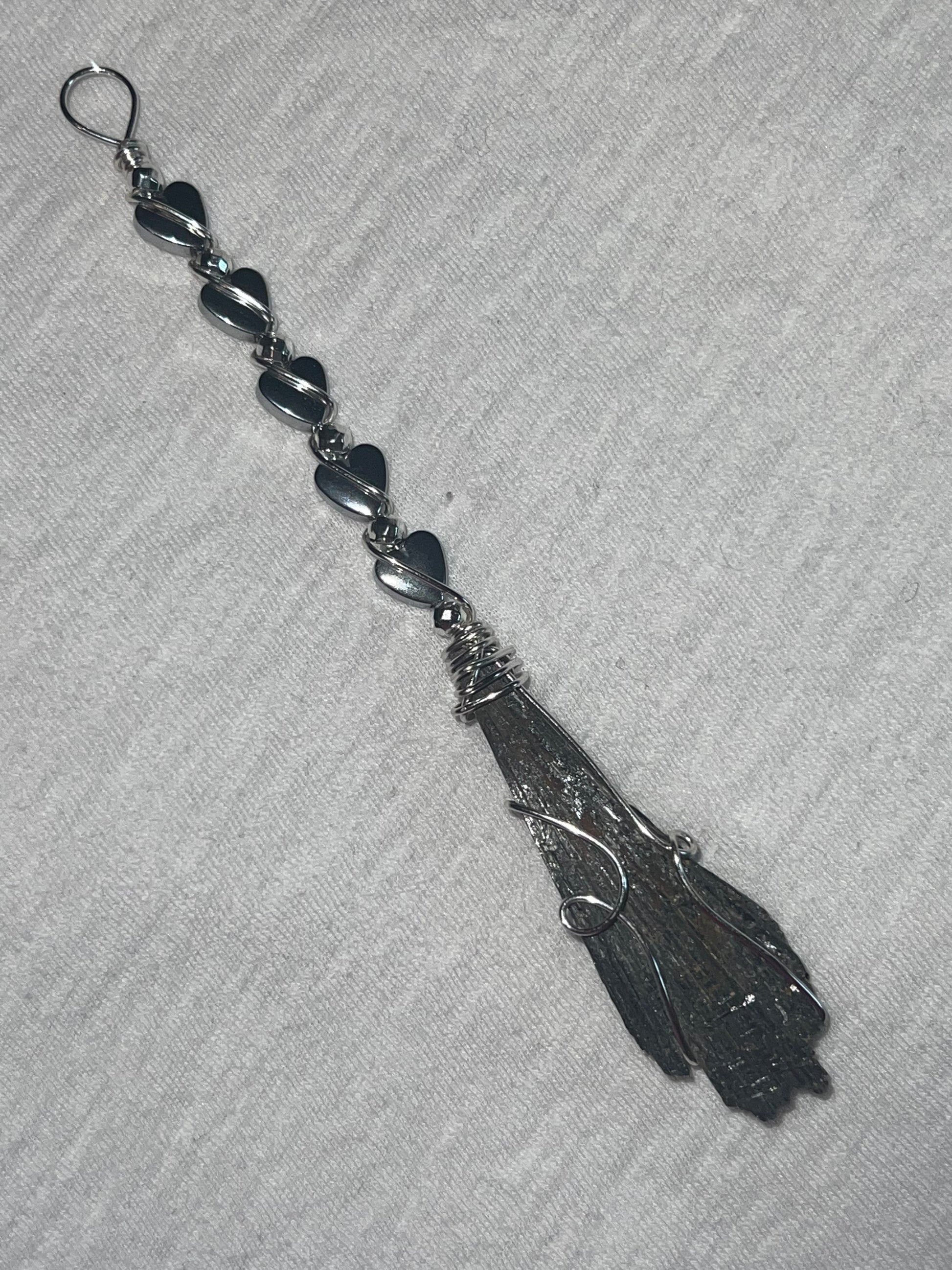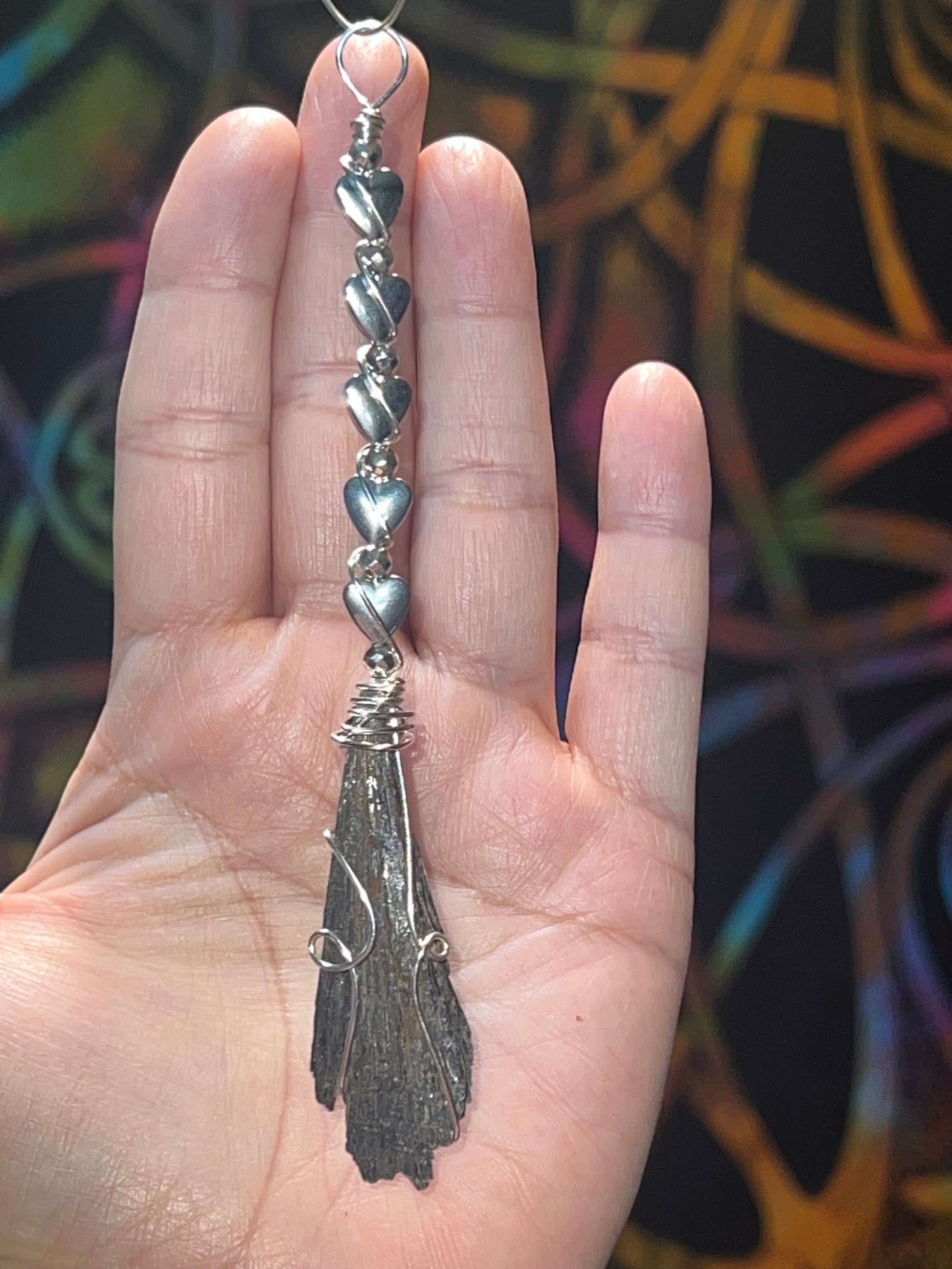Hematite Heart & faceted beads on Black Kyanite wrapped in Silver Plated Parawire. 5 1/4 inches long.