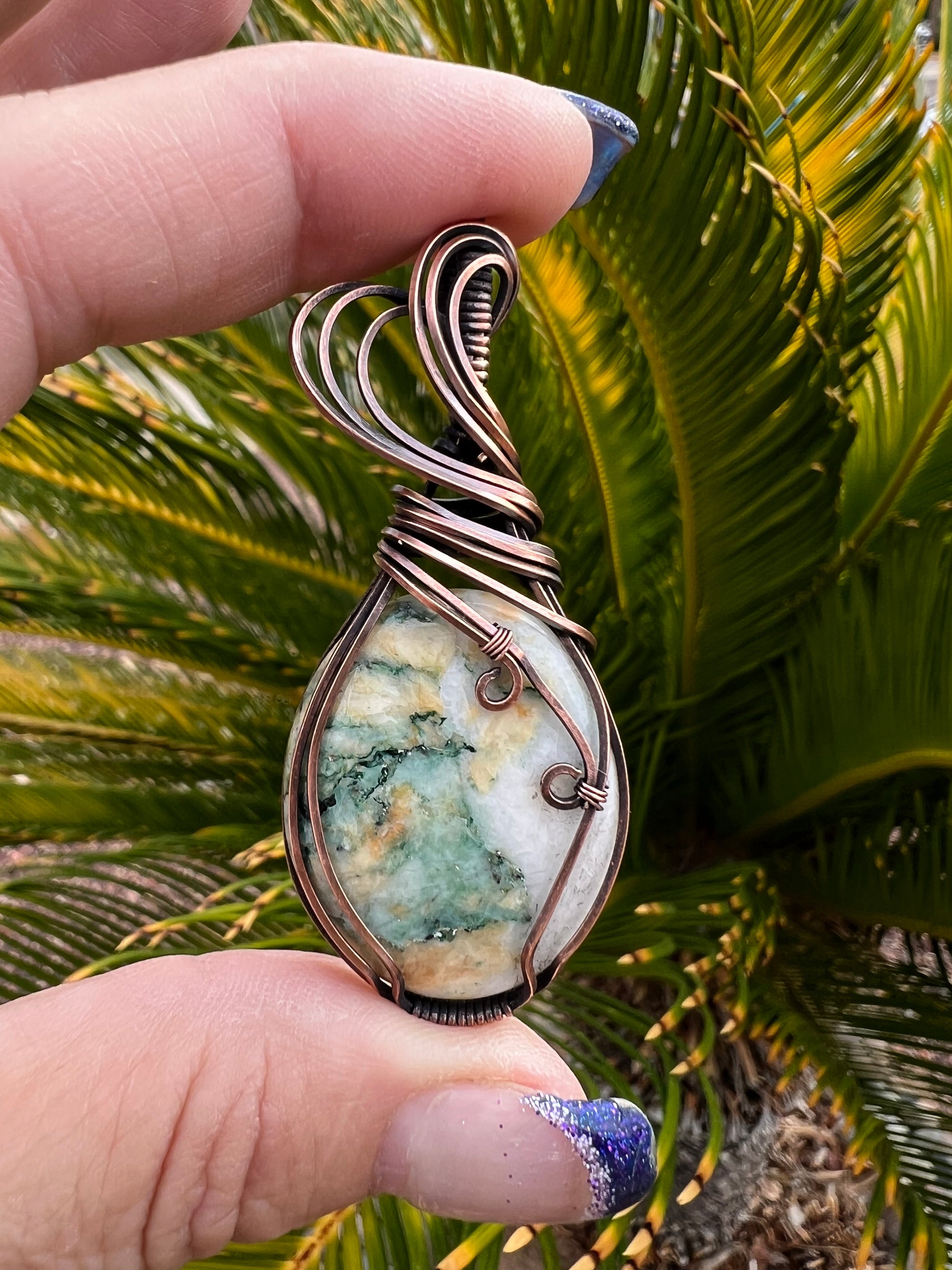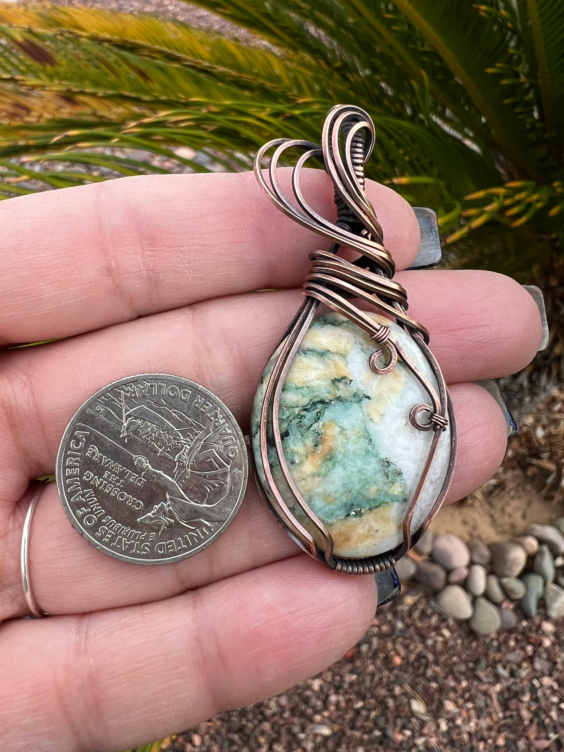 Mariposite Wrapped In Bare Copper Wire Oxidized and polished for an antique look.