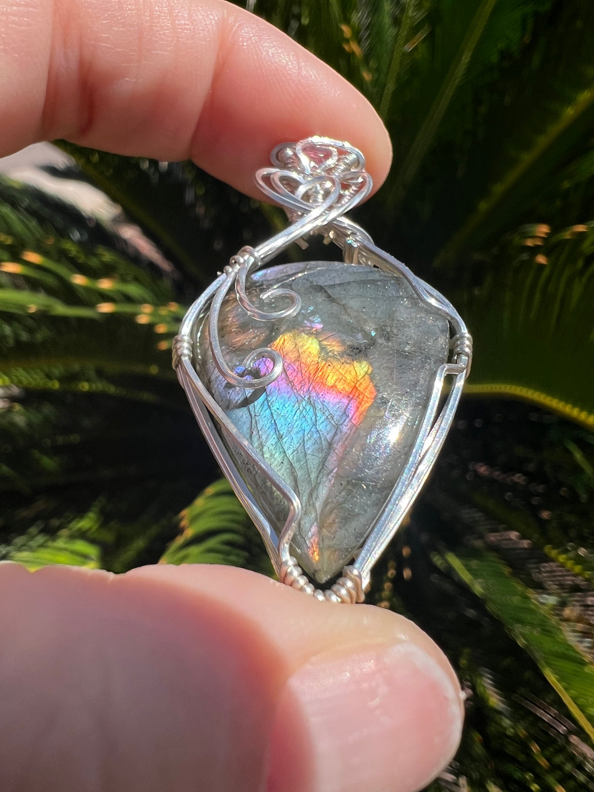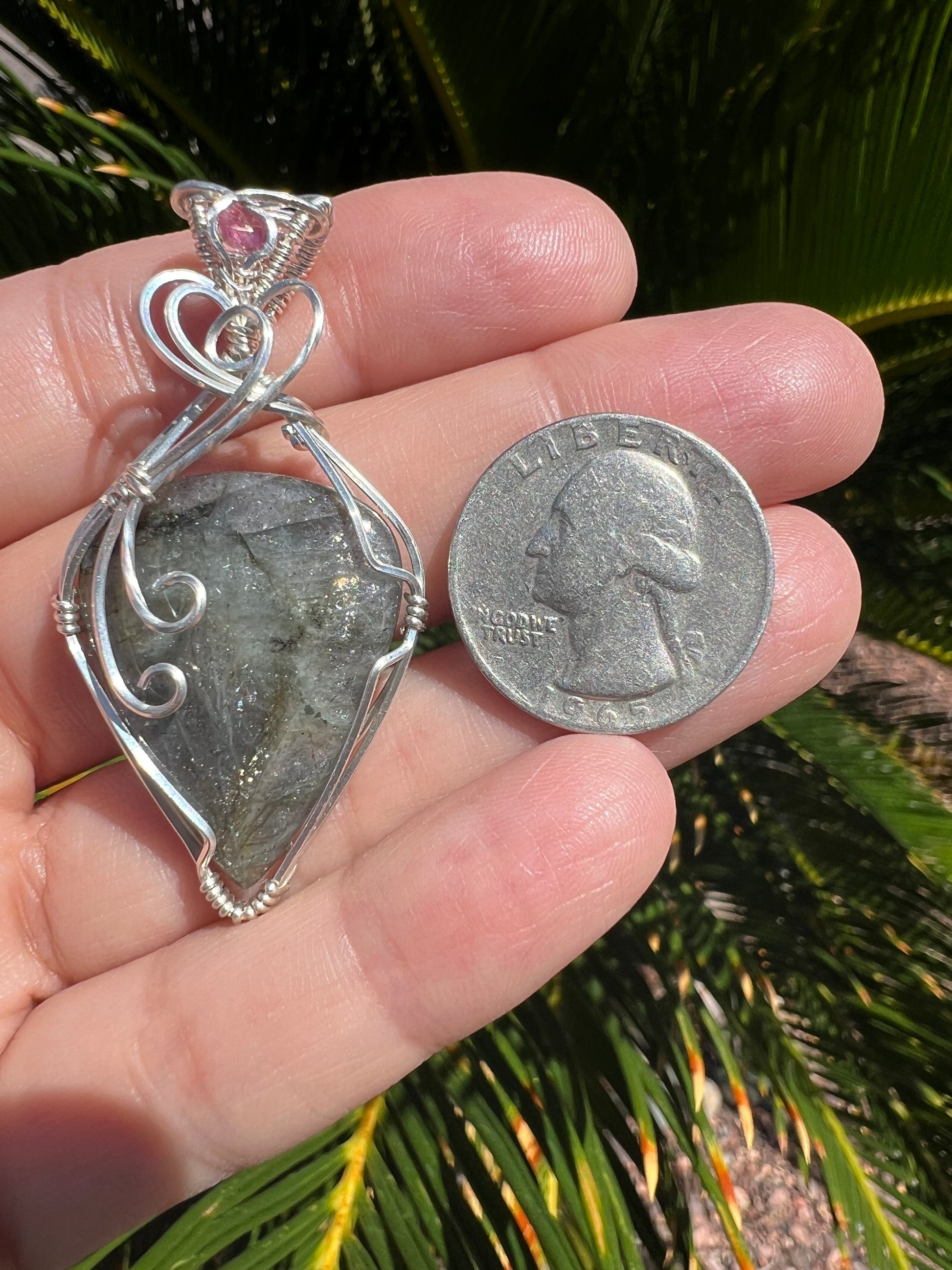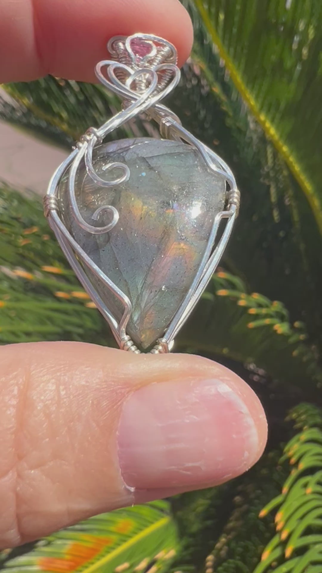 Multicolored Labradorite w/ Faceted Pink Tourmaline accent in the bail Wrapped in Solid Sterling Silver wire.