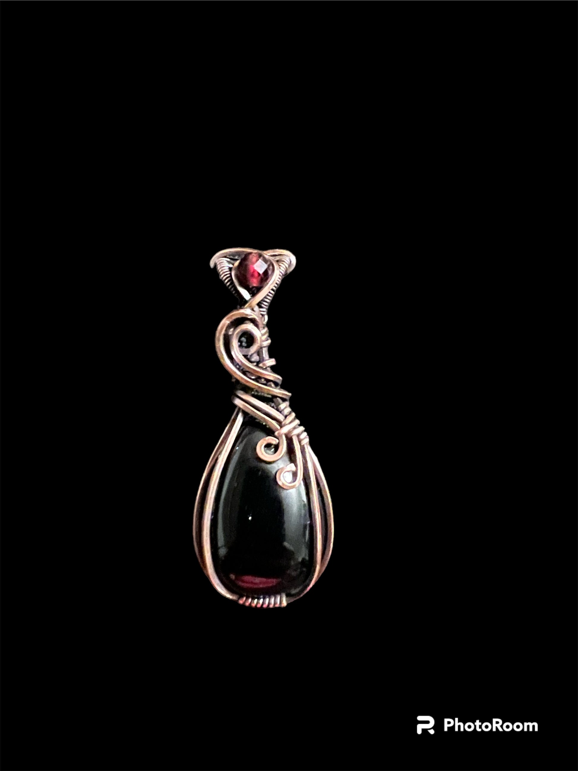 Black Onyx in Bare Copper wire with a Faceted Ruby bead accent on the bail. Oxidized and polished for an antique look 1 3/4 inches long 3/4 inch wide