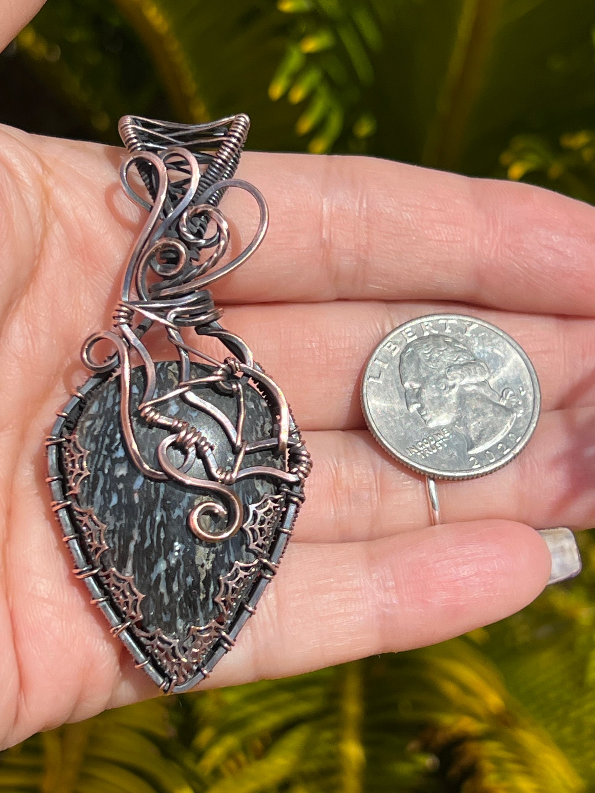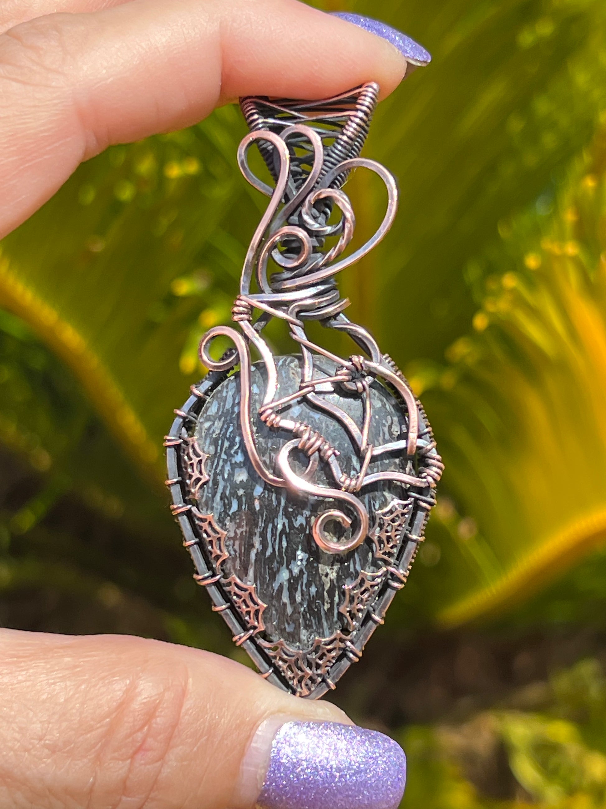 Grounded in the ancient strength of Palm Root, this pendant is hand-woven in copper with intricate web-like details and swirling wirework. A piece that whispers of protection and mystery, connecting you to both Earth’s roots and unseen realms. One of a kind, handcrafted with care.