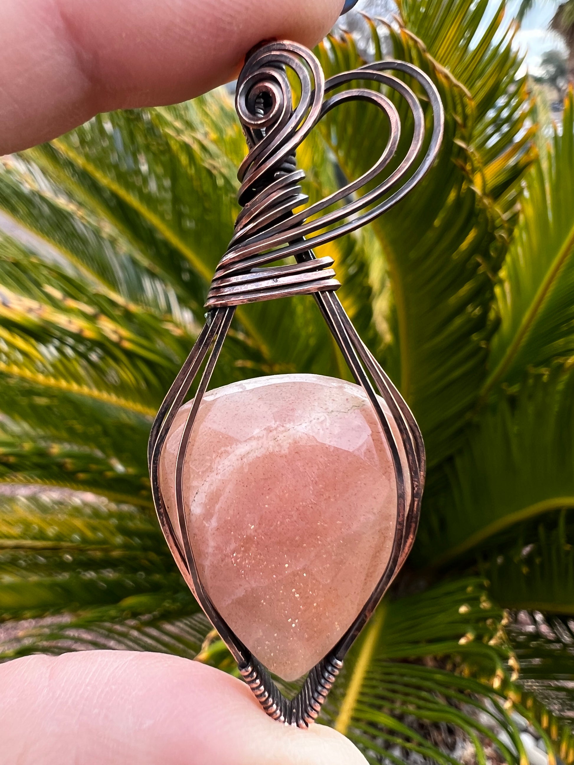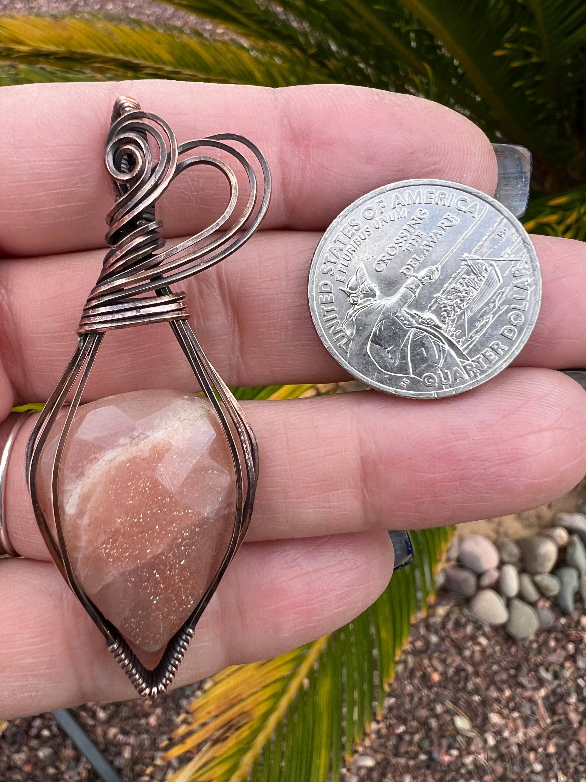 Rose Cut Peach Sunstone in Bare Copper Oxidized and polished for an antique look.