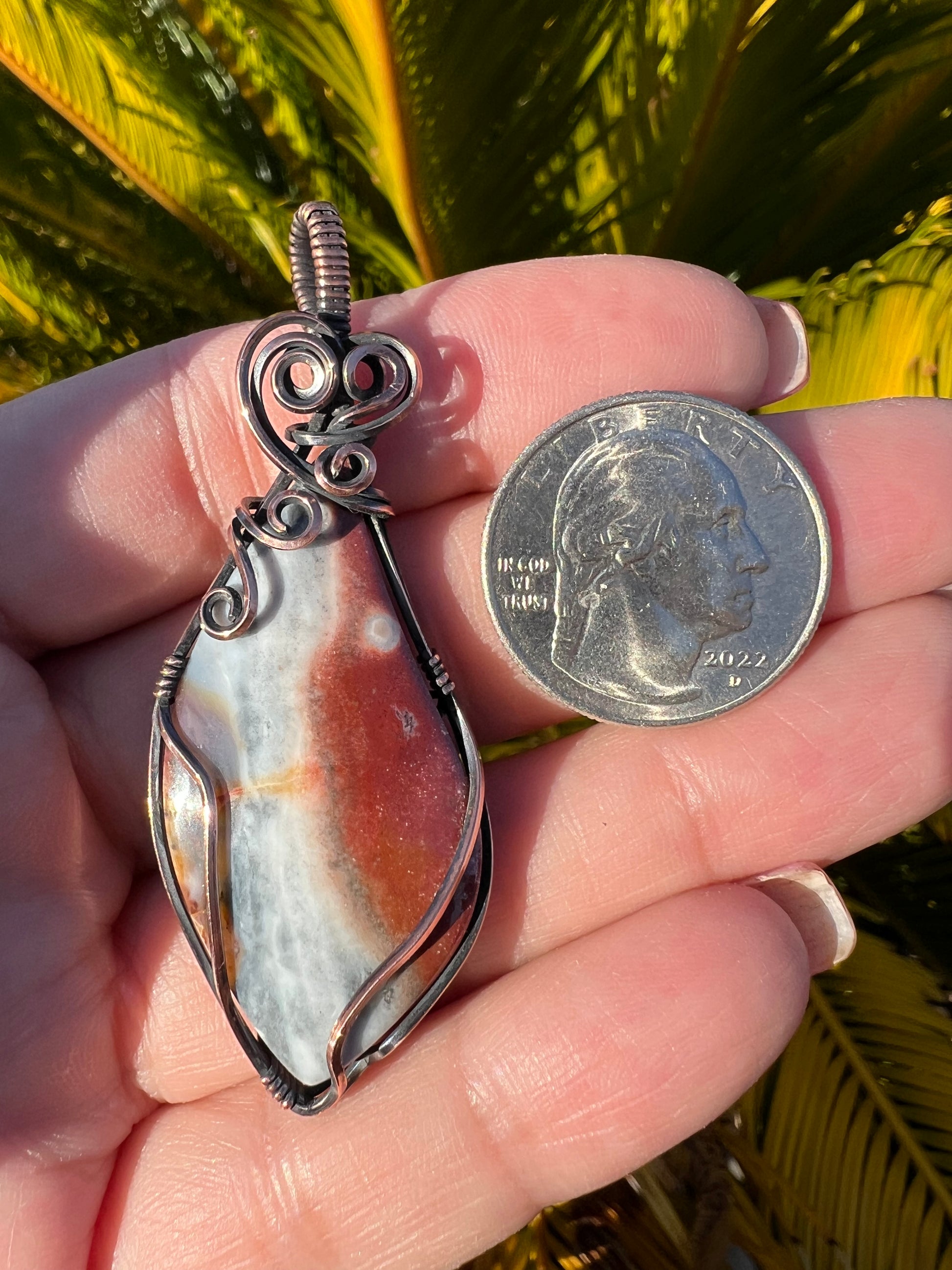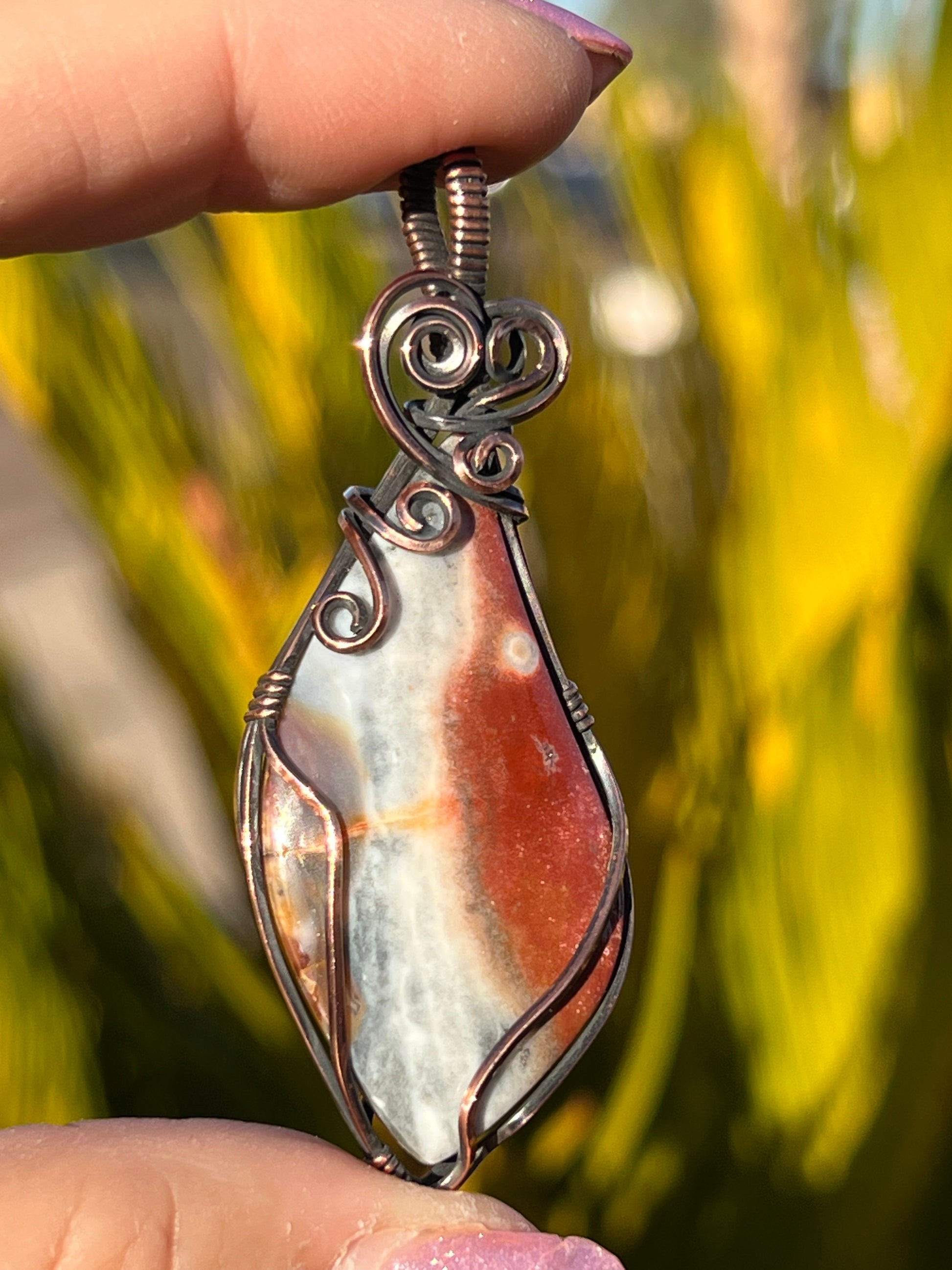 Rooted in ancient memory and ignited with elemental fire, this petrified wood pendant carries a timeless rhythm. Hand-wrapped in warm antiqued copper with flowing scrolls and soft curves, the stone reveals a stunning landscape of crimson, frost-white, and smoky blue-gray — like lava meeting glacier.
