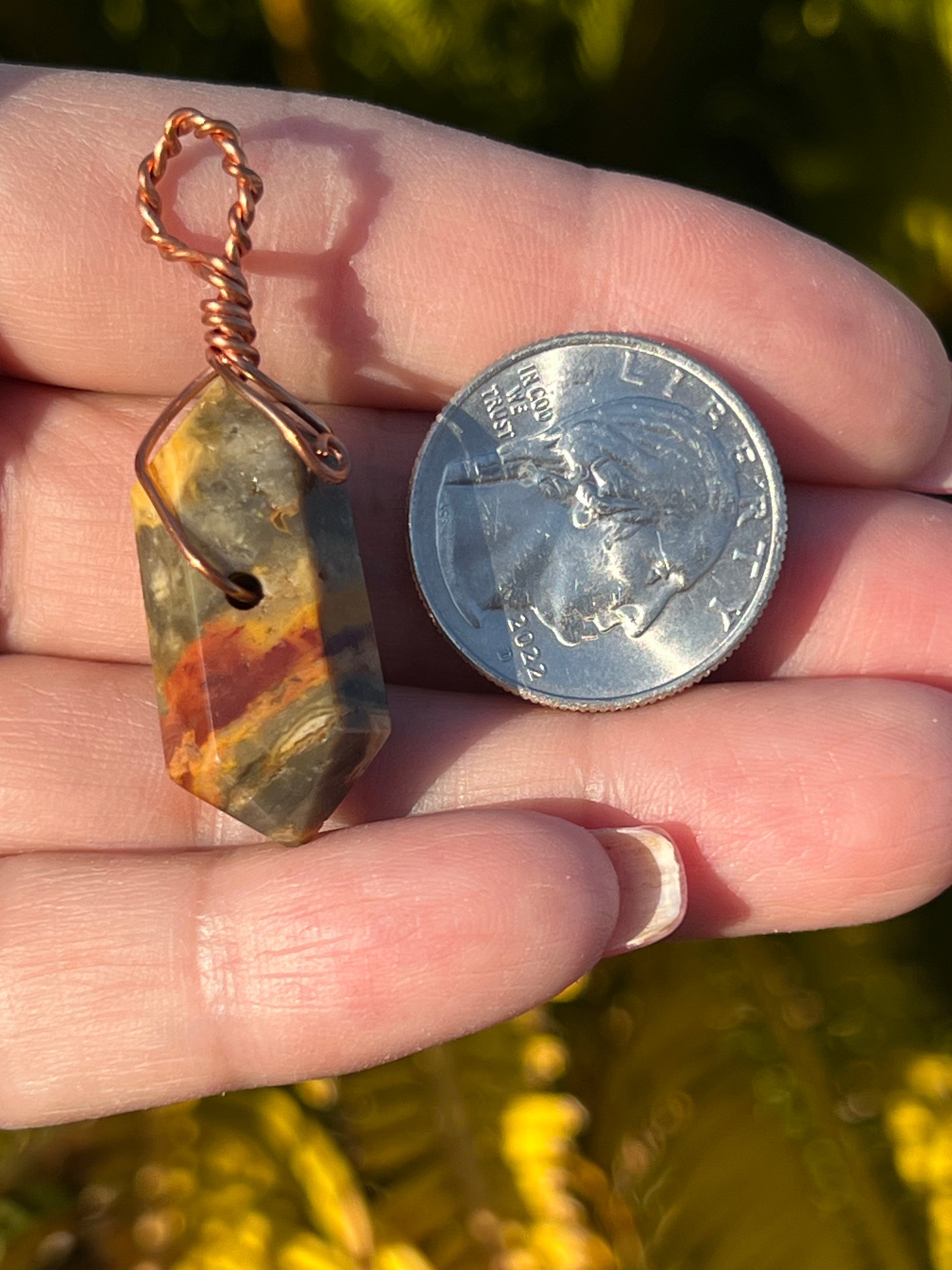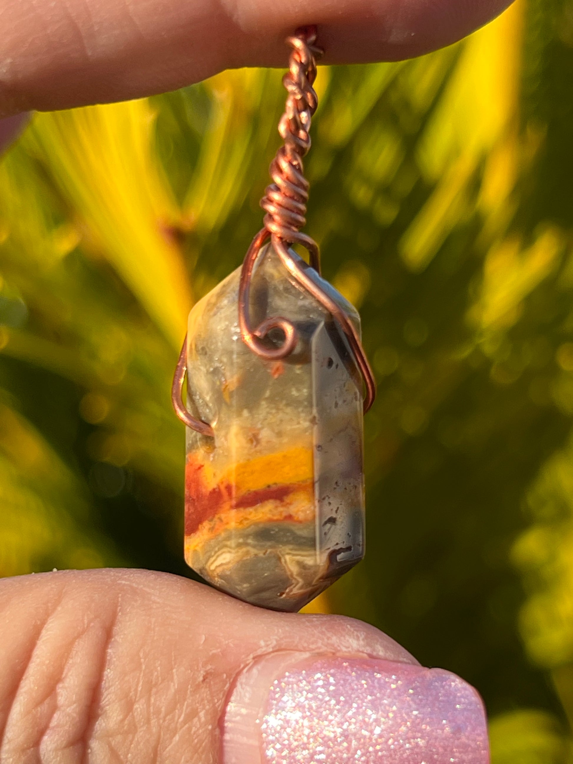 Bold streaks of ochre and crimson blaze across this Picasso Jasper pendant like fire etched in stone. With its raw geometric cut and simple twisted copper wrap, this piece evokes grounded power and primal strength — a talisman of focused fire, creativity, and inner resolve.
