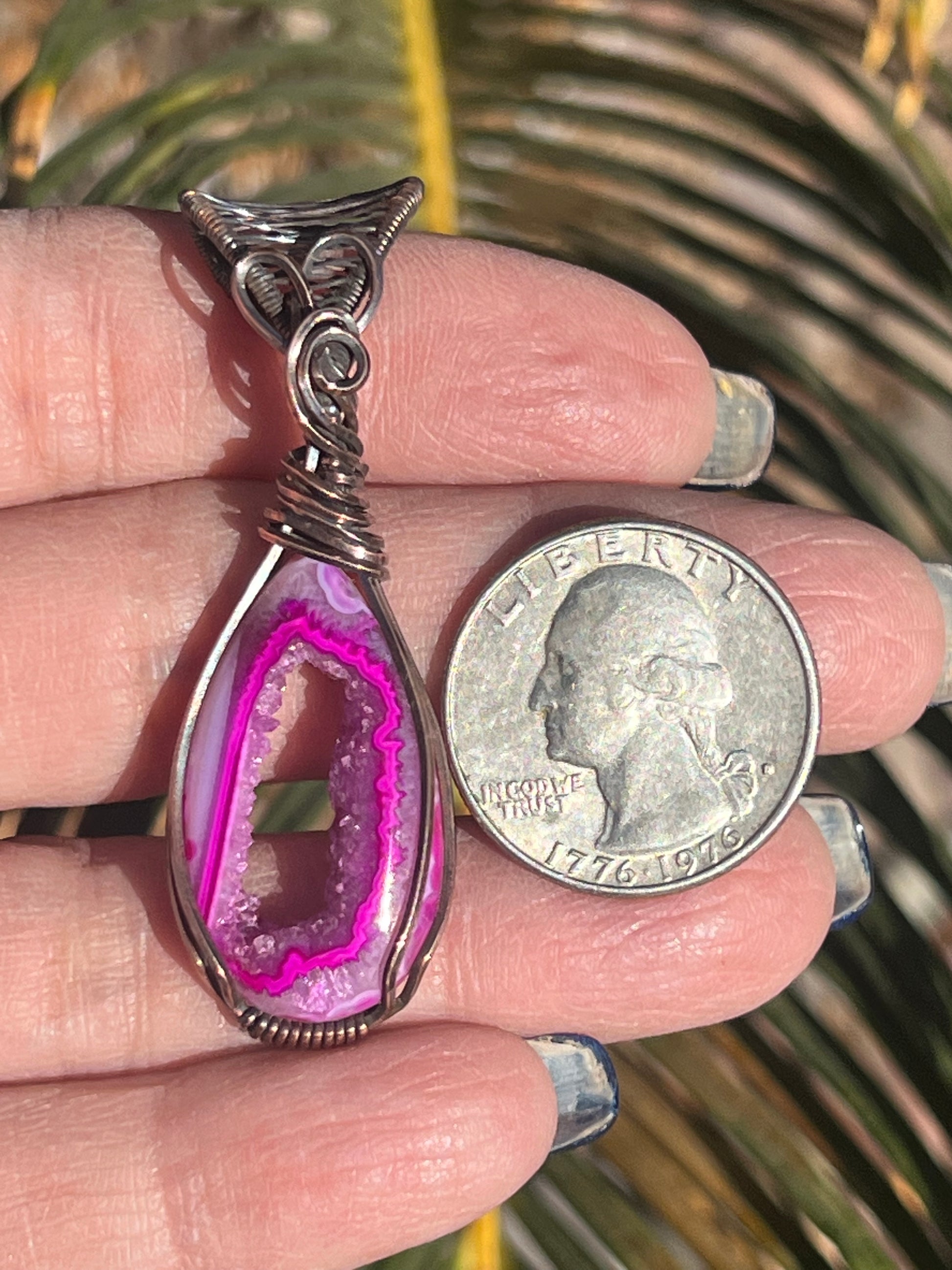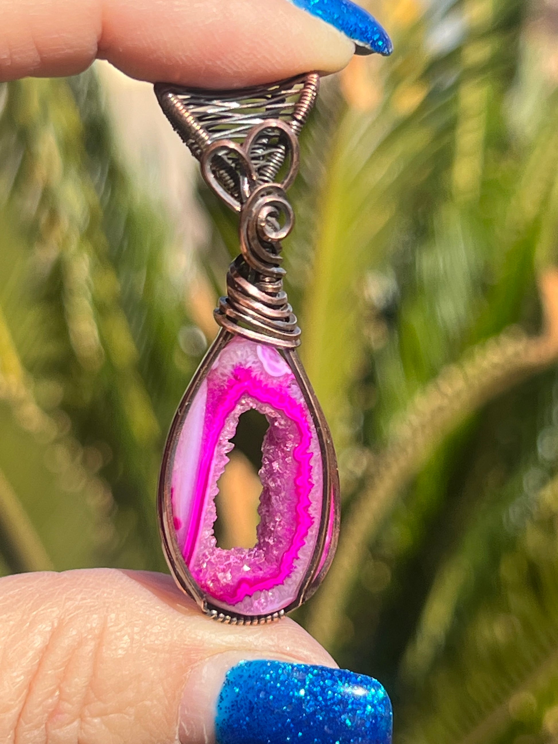 Pink Druzy this stone is dyed. Wrapped in Copper wire Oxidized and Polished for an Antique Look