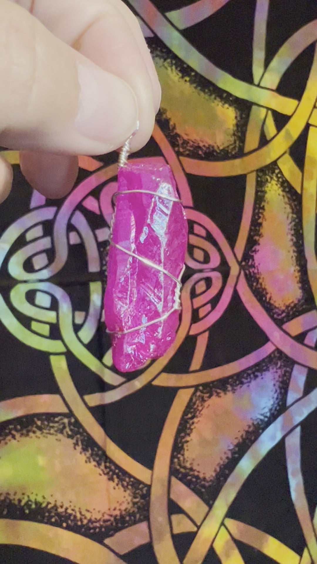 Pink iridescent painted Quartz Crystal in a simple wrap of Silver Plated Parawire. It is 2 inches long.