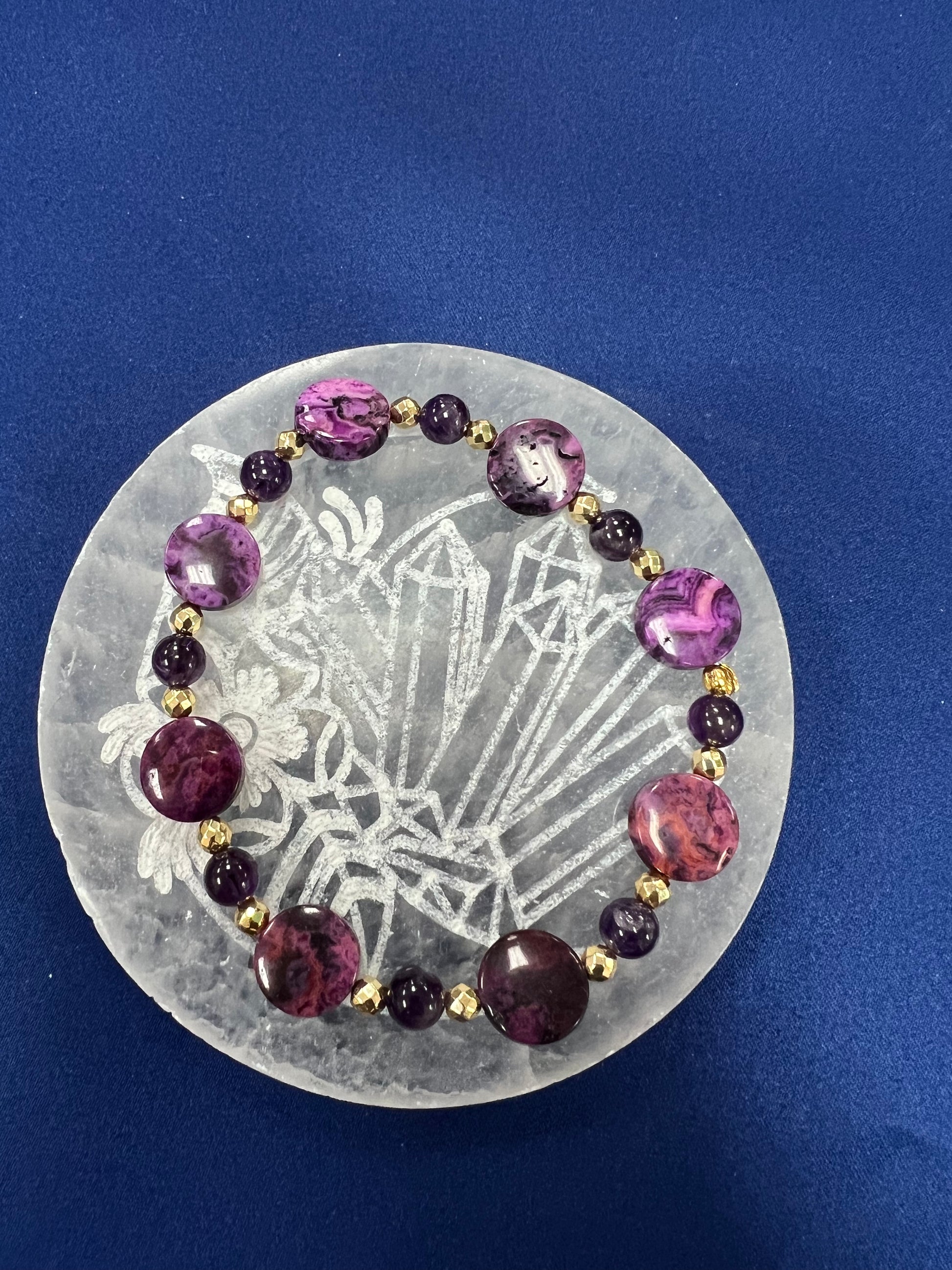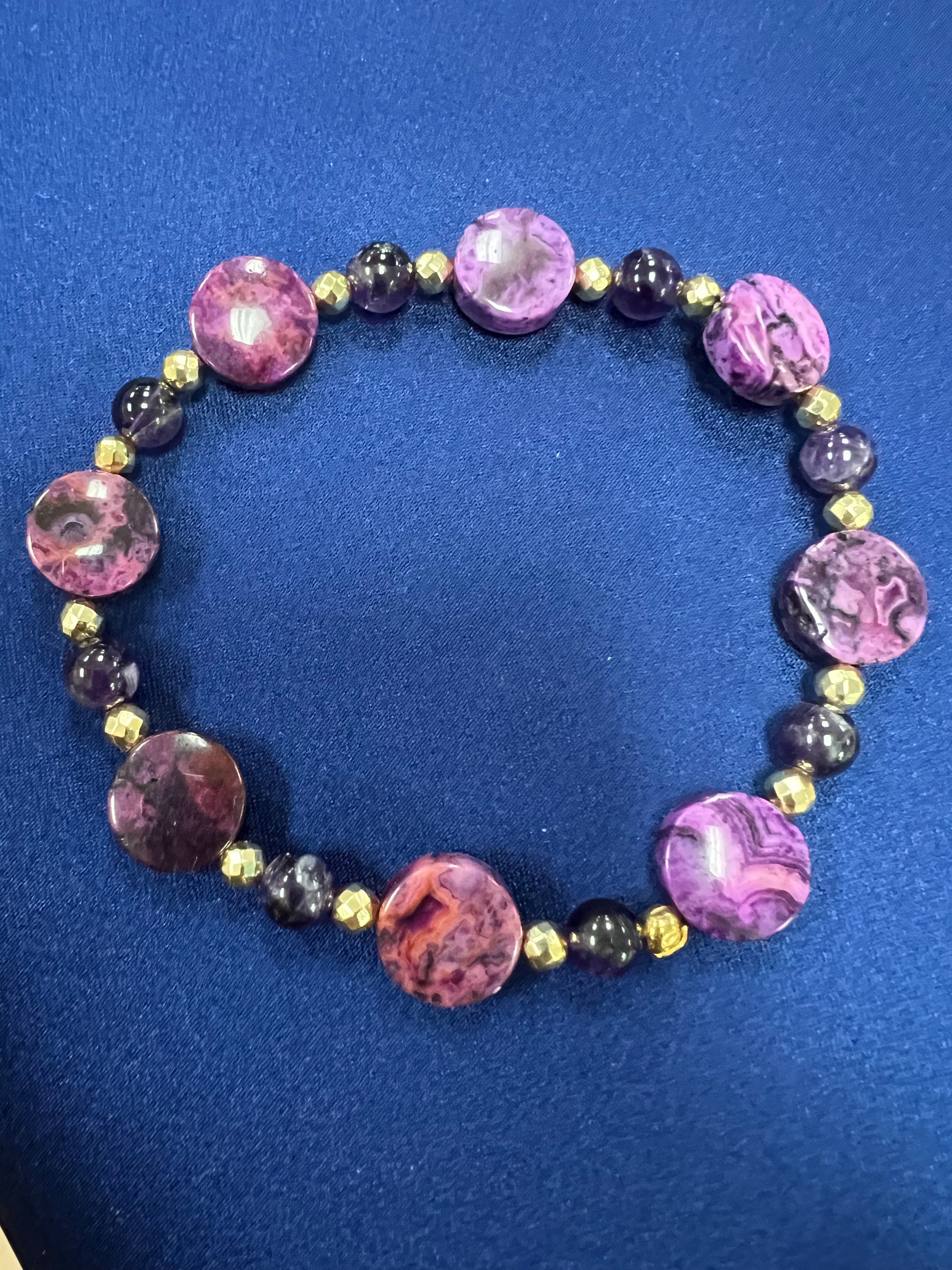 10 mm disc shaped Crazy Lace dyed purple & accented with 4mm gold colored faceted Hematite beads on double .5 mm black strechy cord. Fits an 8 inch wrist.