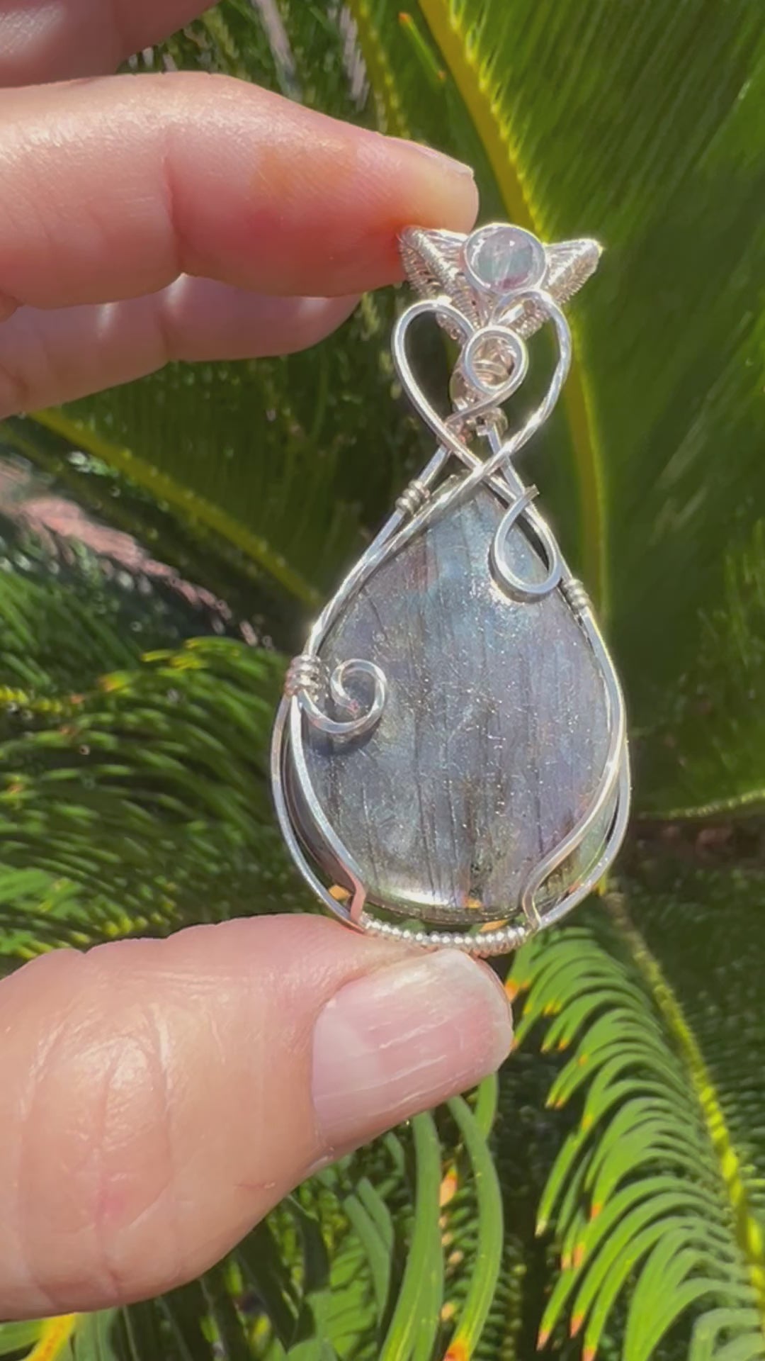 Purple Labradorite Wrapped in Silverplated Nontarnish Wire with a Flourite bead accent. 2 inches long