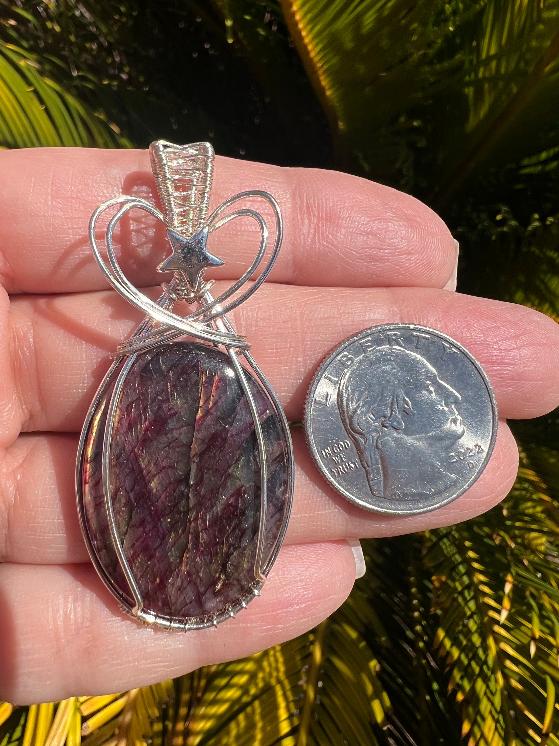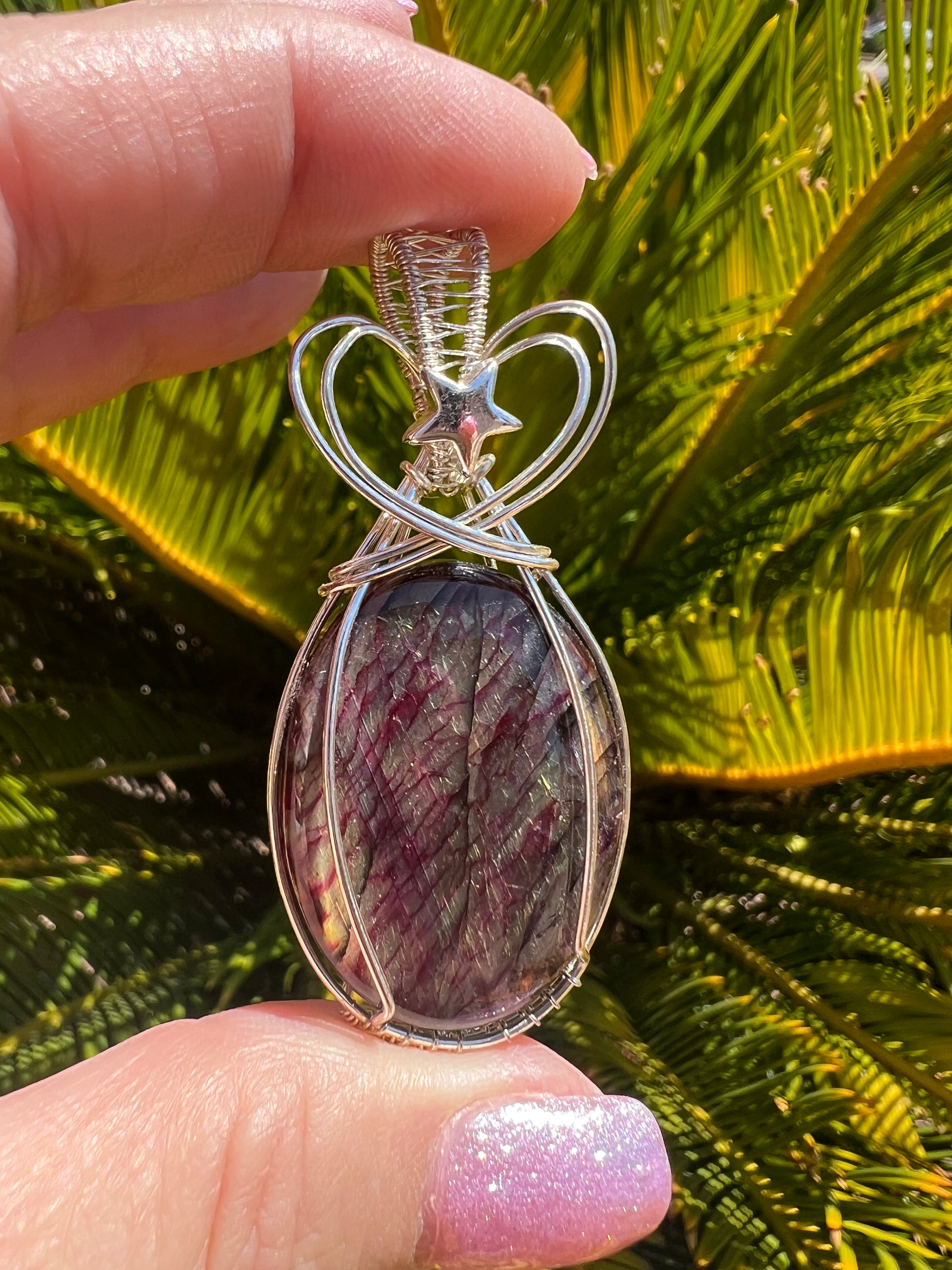 Shifting with flashes of violet and shadow, this mystical labradorite is wrapped in sterling silver and crowned with a silver hematite star. The energy is otherworldly—protective, intuitive, and luminous like starlight through twilight. A powerful talisman for dreamers, seekers, and those walking the in-between.