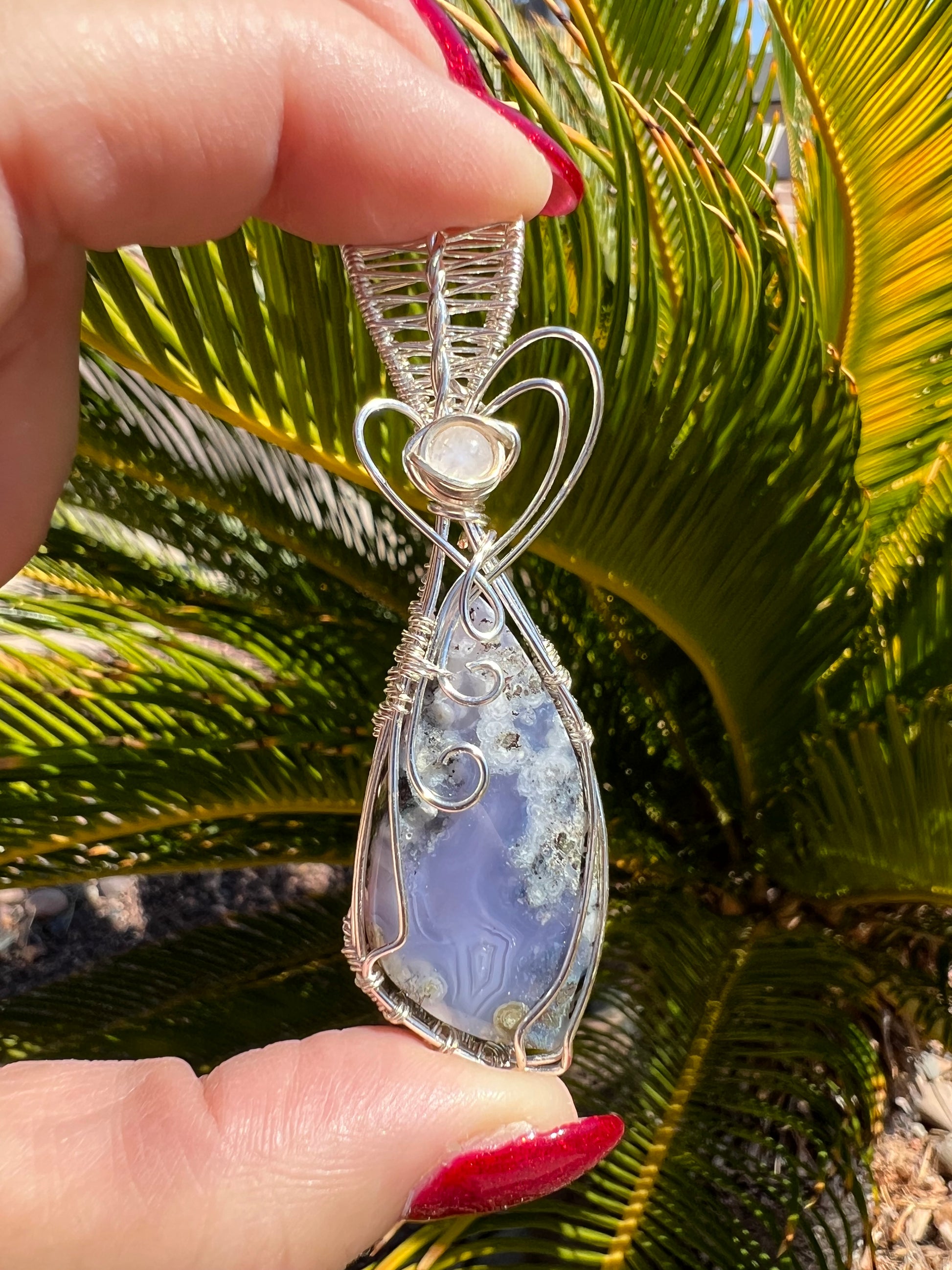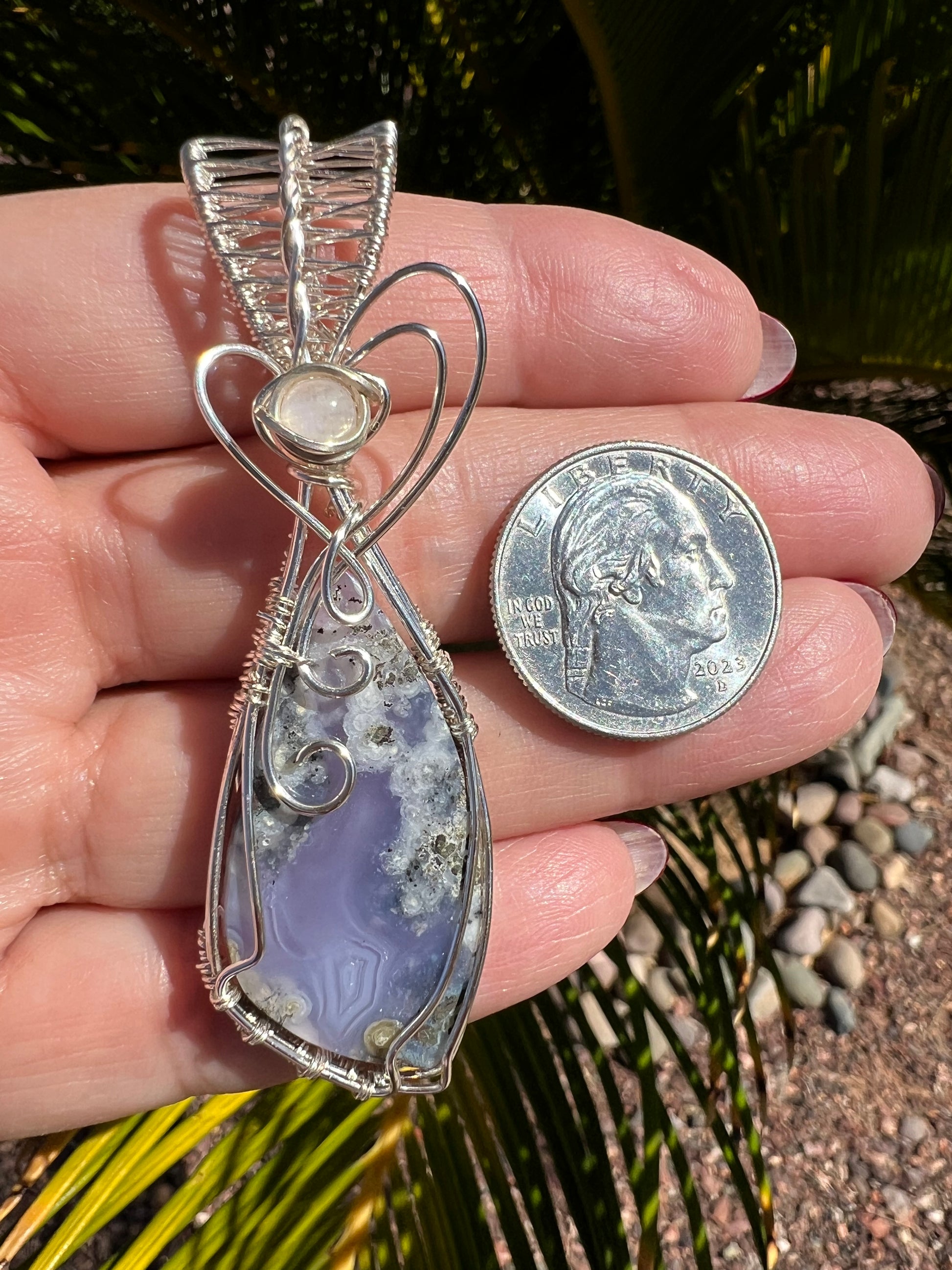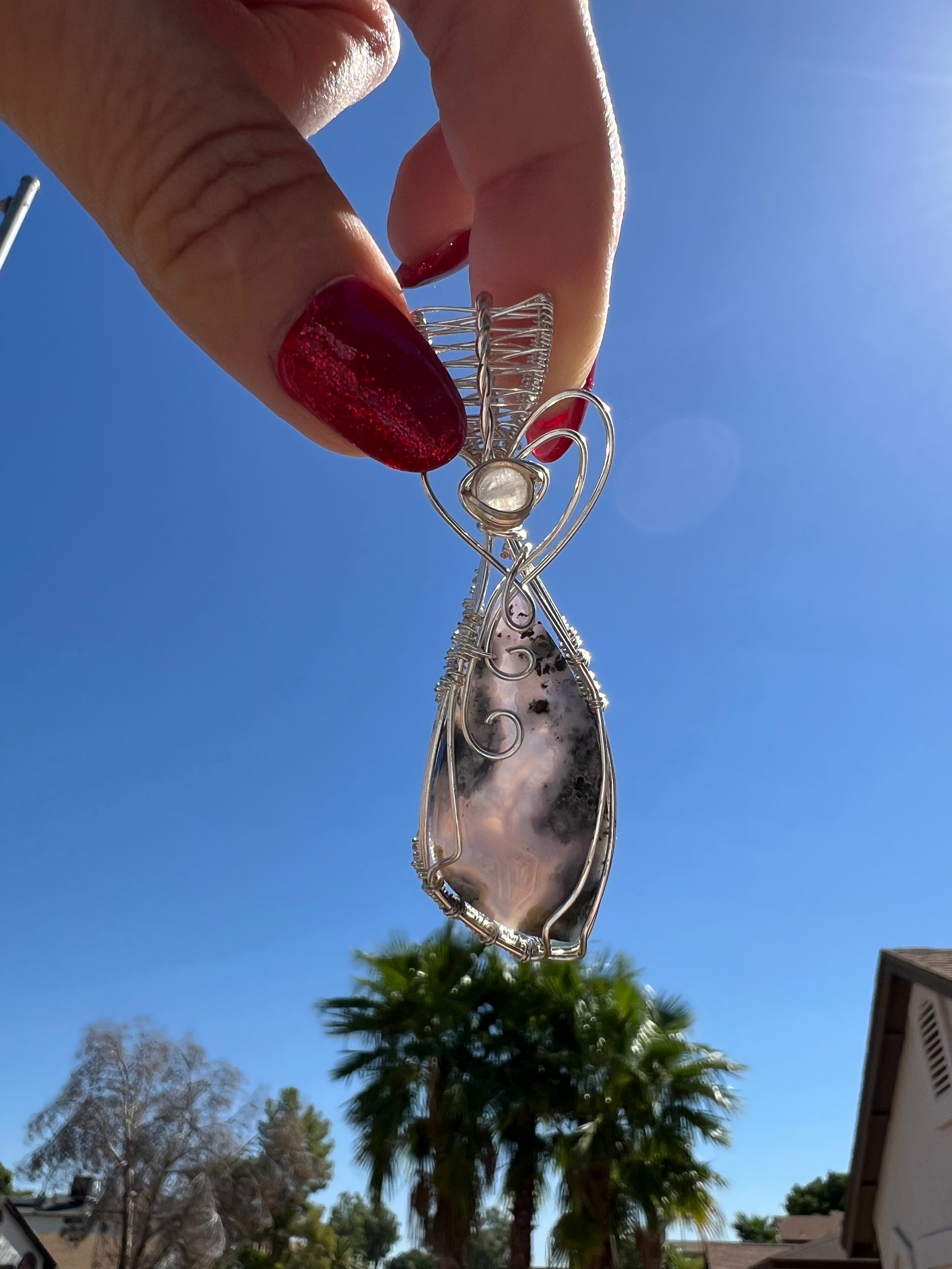 Purple Moss Agate with Moonstone accent in Silver Plated nontarnish Parawire. Gorgeous stone! 3 in long 3/4 in wide.