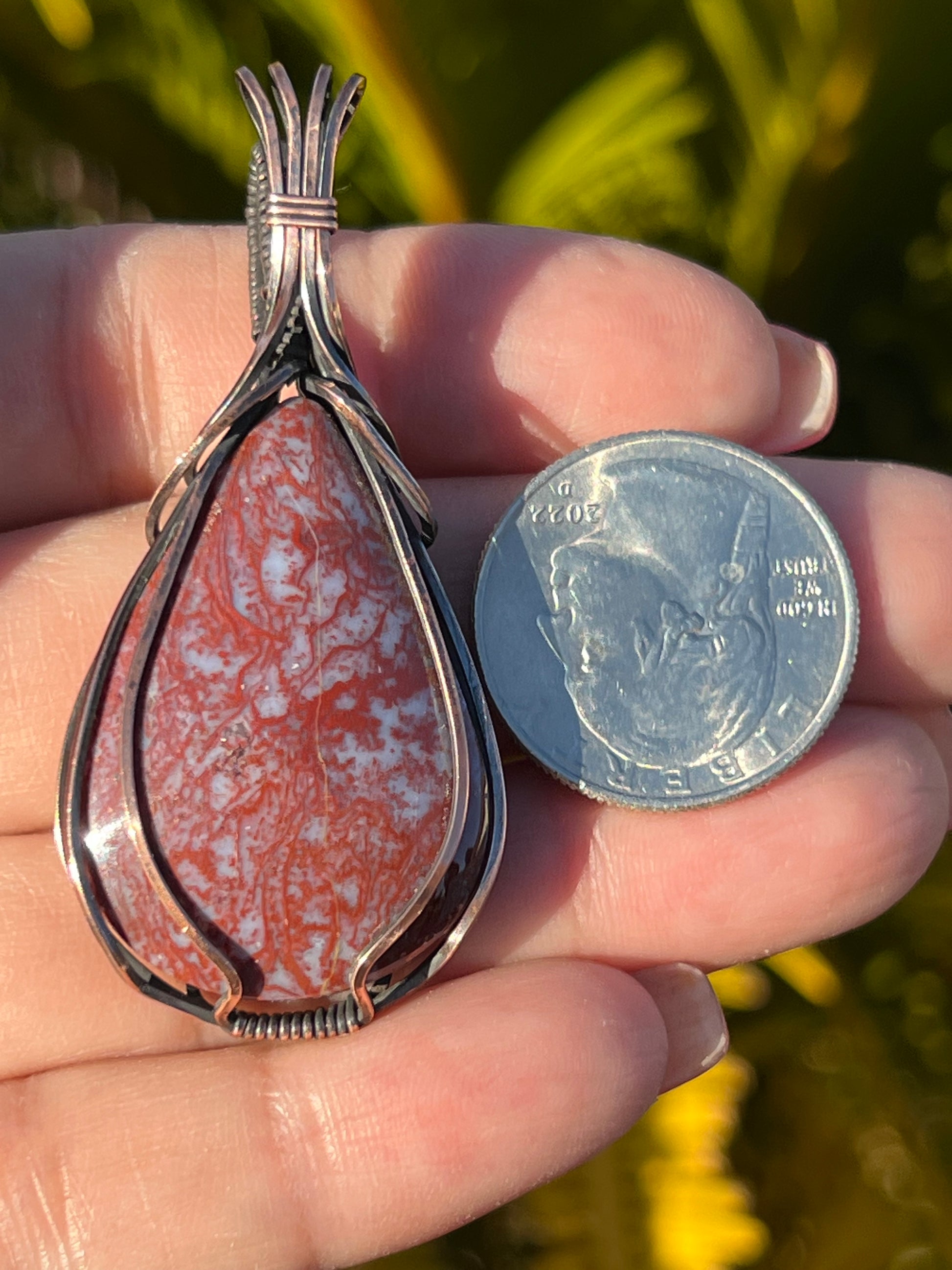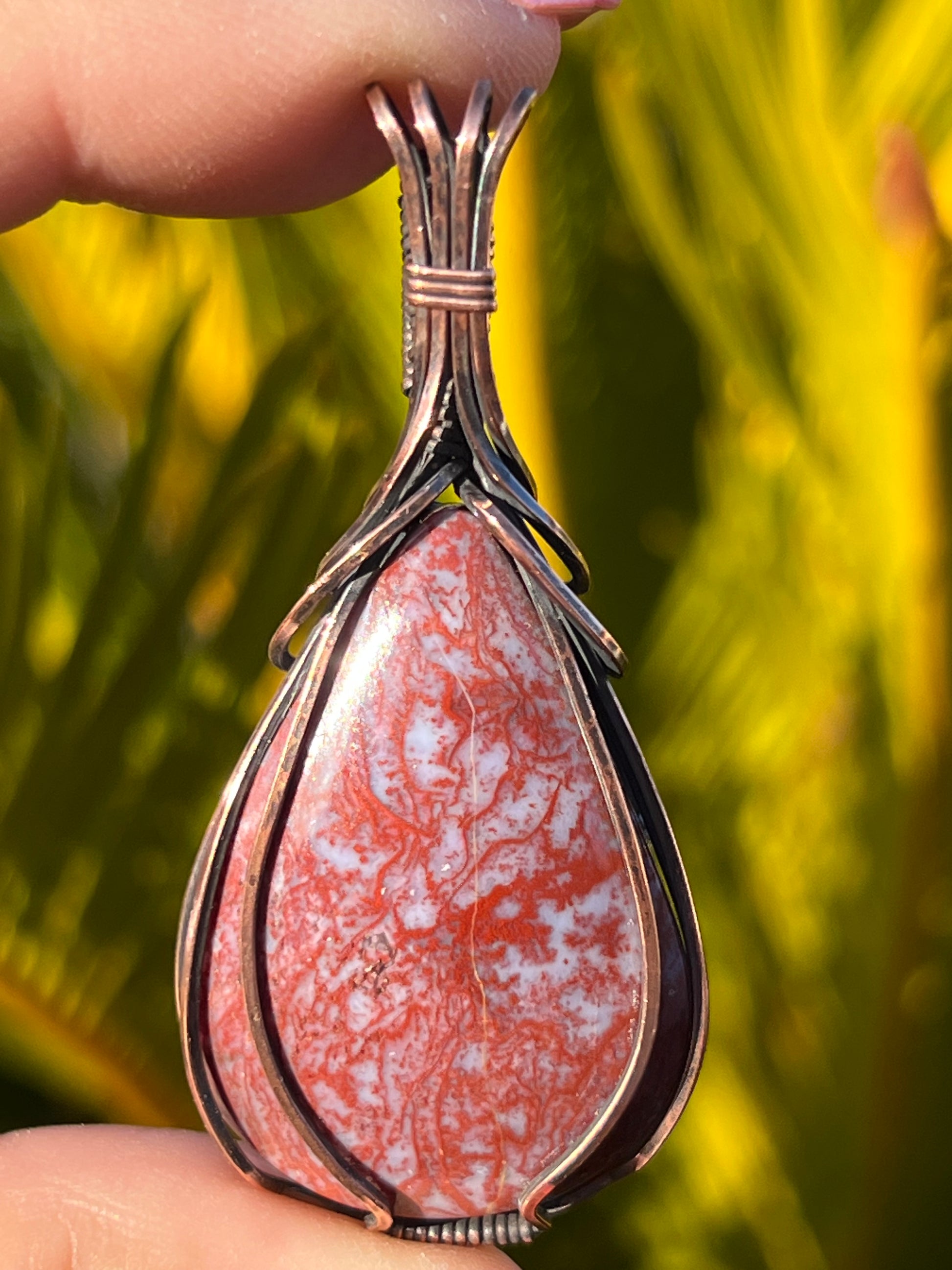 Bold and grounding, this Red Jasper pendant blooms with fire and earth. Wrapped in warm copper with a fan-like crown at the top and graceful curved framing, this stone glows with energy — like roots catching flame beneath the surface.