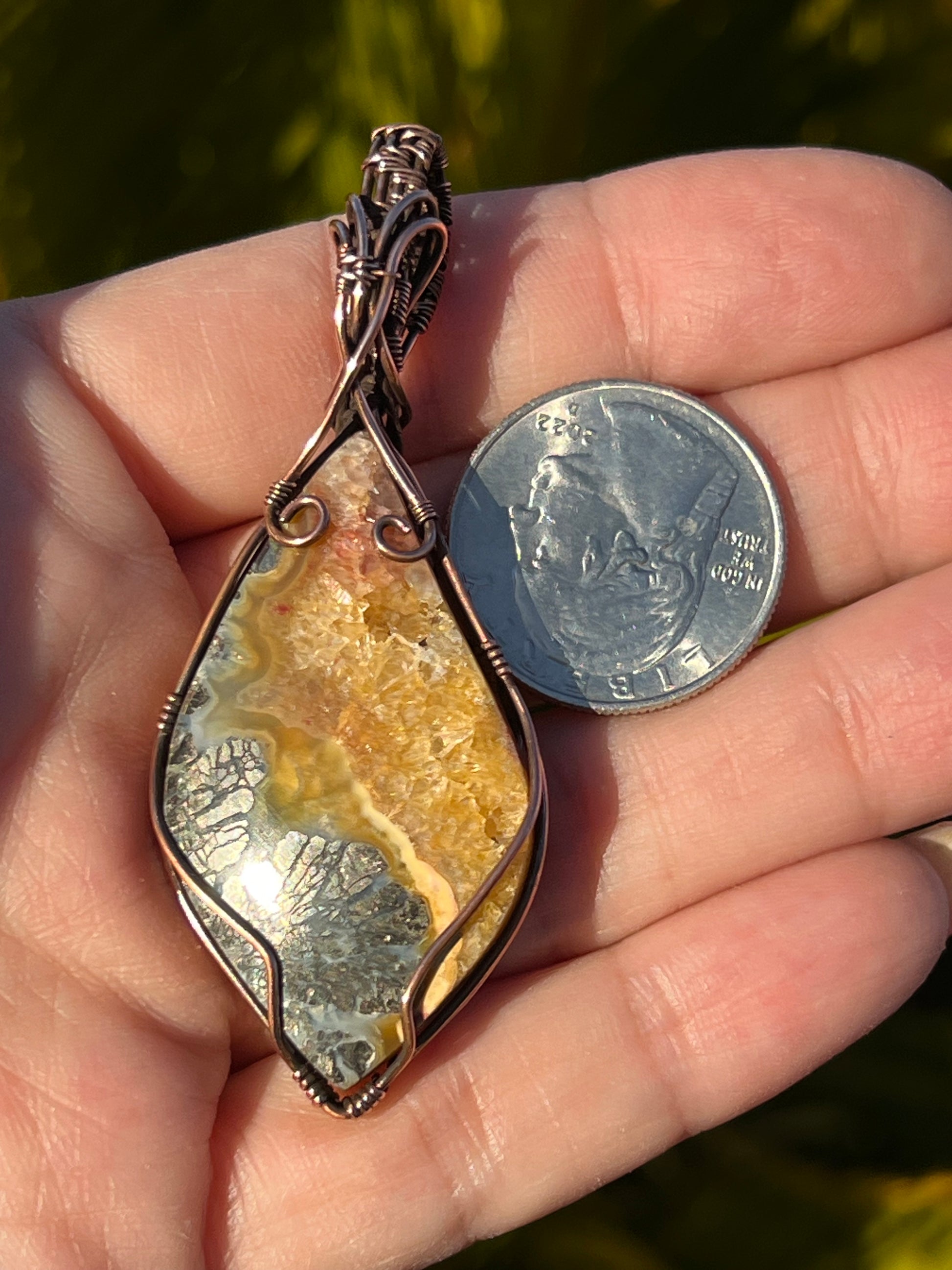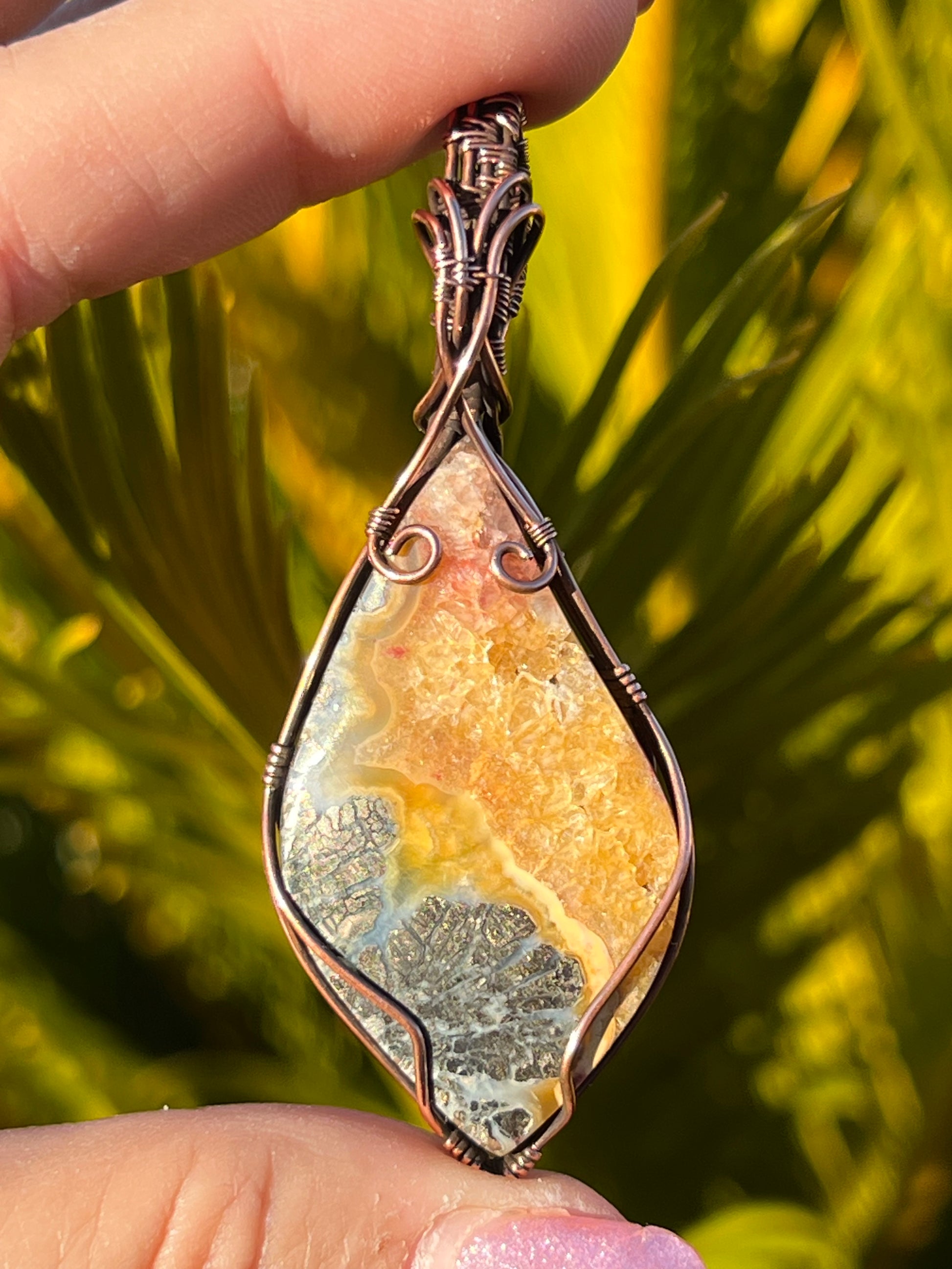 Like sunlight frozen in stone, this Red Marcasite pendant glows with a warm golden sparkle and intricate fossil-like patterning. Wrapped in copper with delicate scrollwork and elegant weaves, it captures the radiant dance between earth and fire.