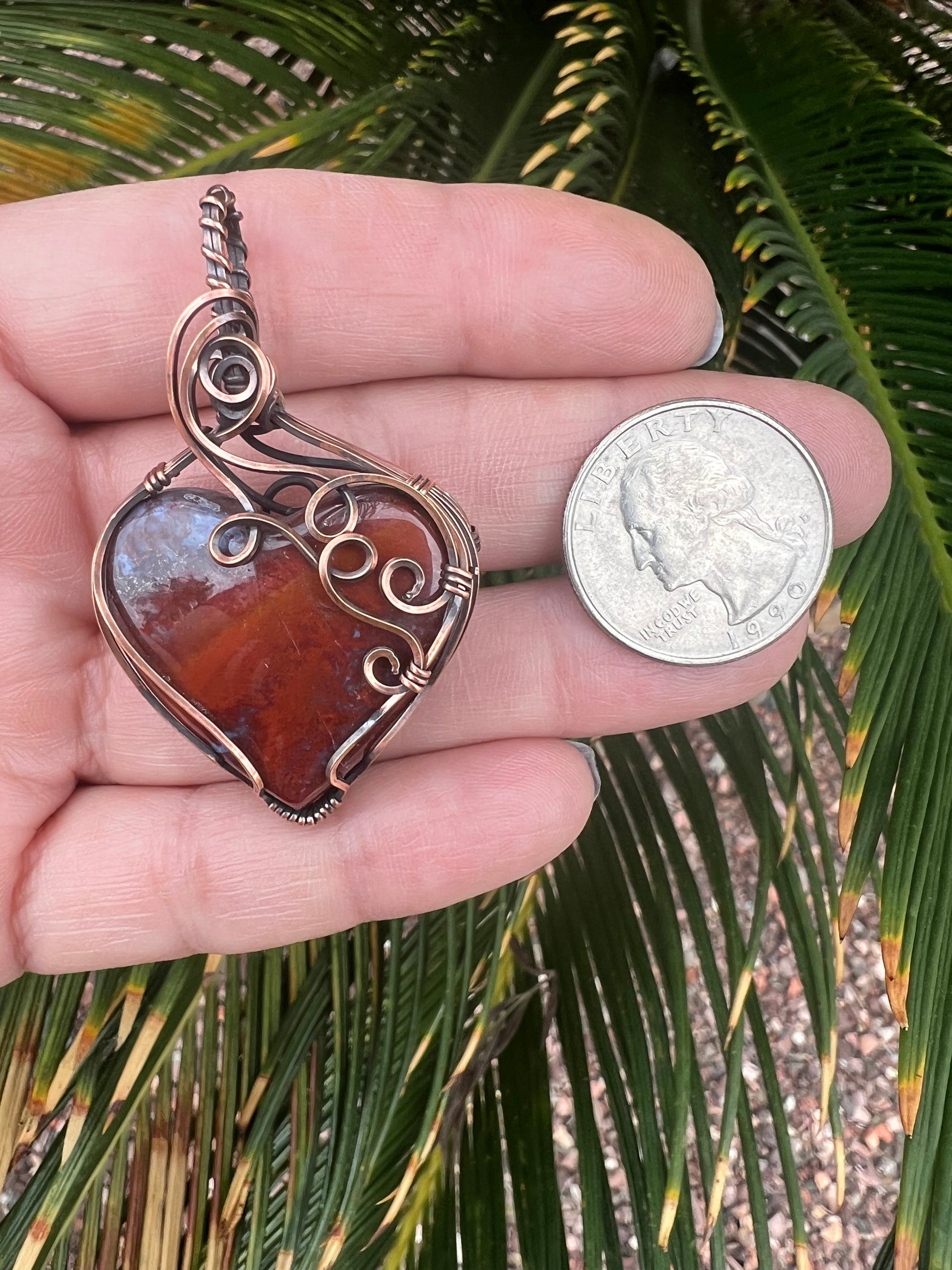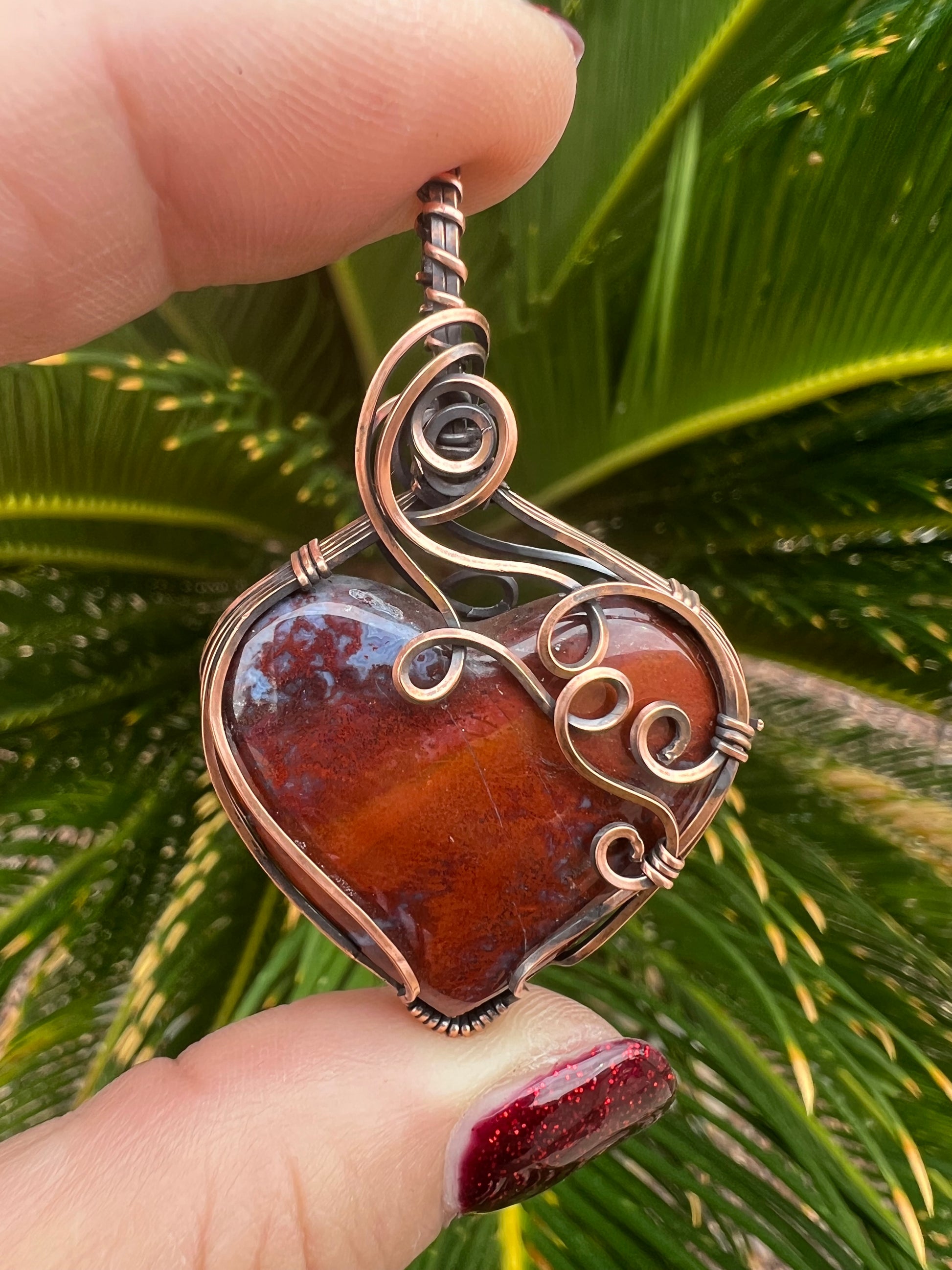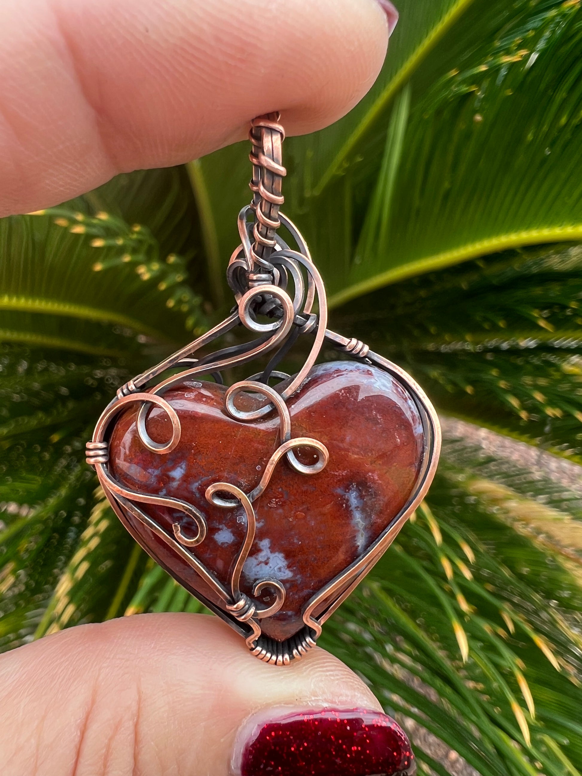 Red Moss Agate Heart Reversible Wrap in Oxidzed Bare Copper Wire 2 1/2 inches long