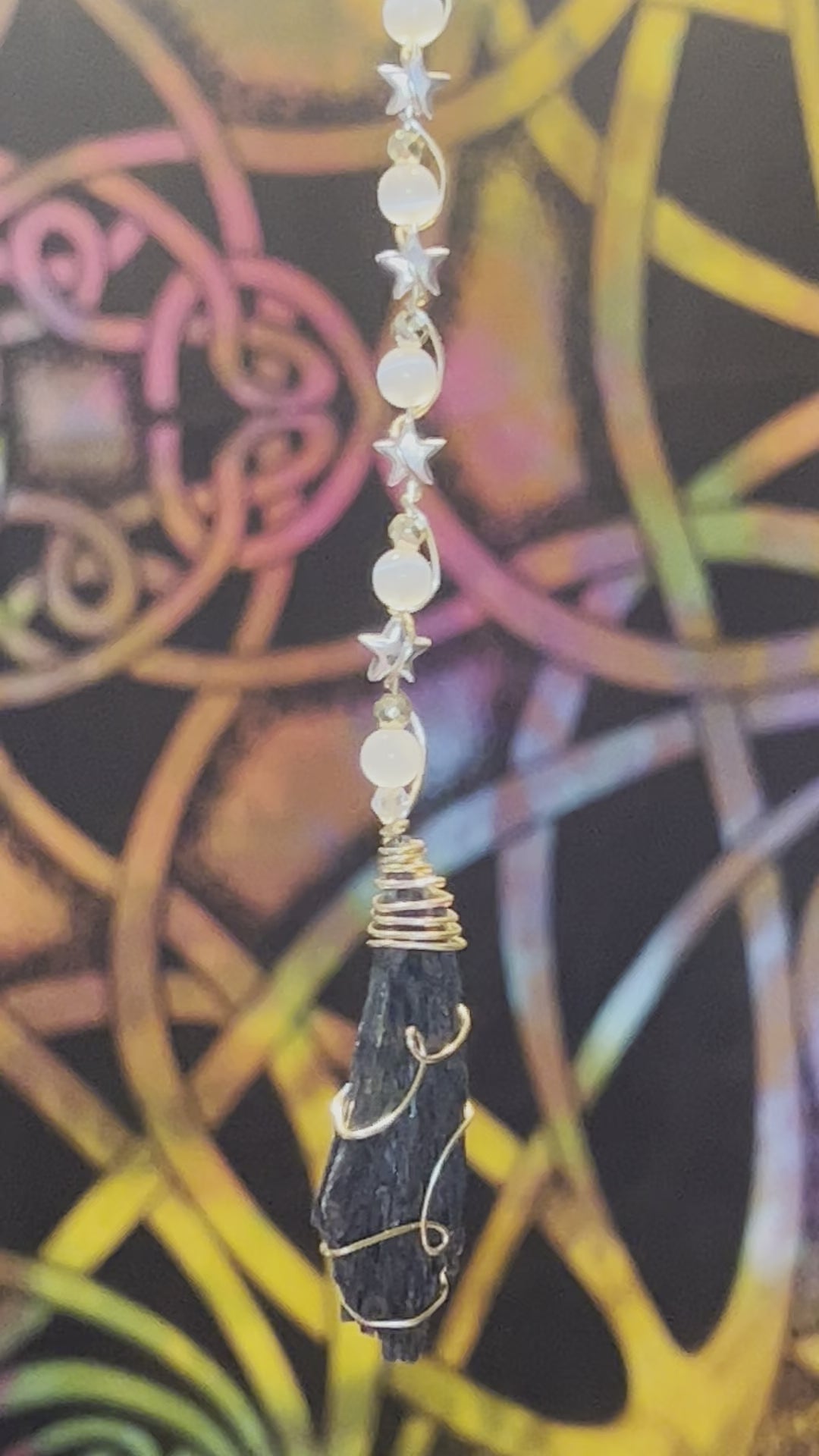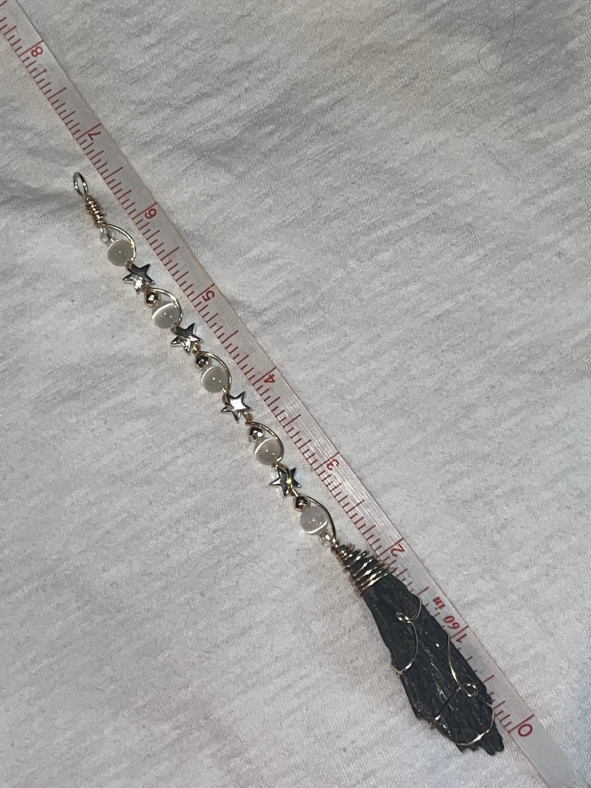 This Broom is made with Selenite, Hematite and Black Kyanite wrapped in Gold colored Parawire. It’s a big one at 7 inches long.