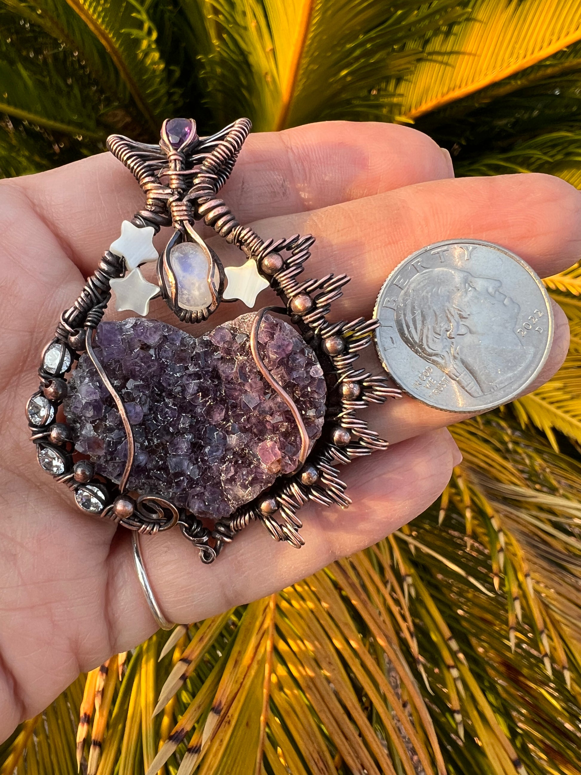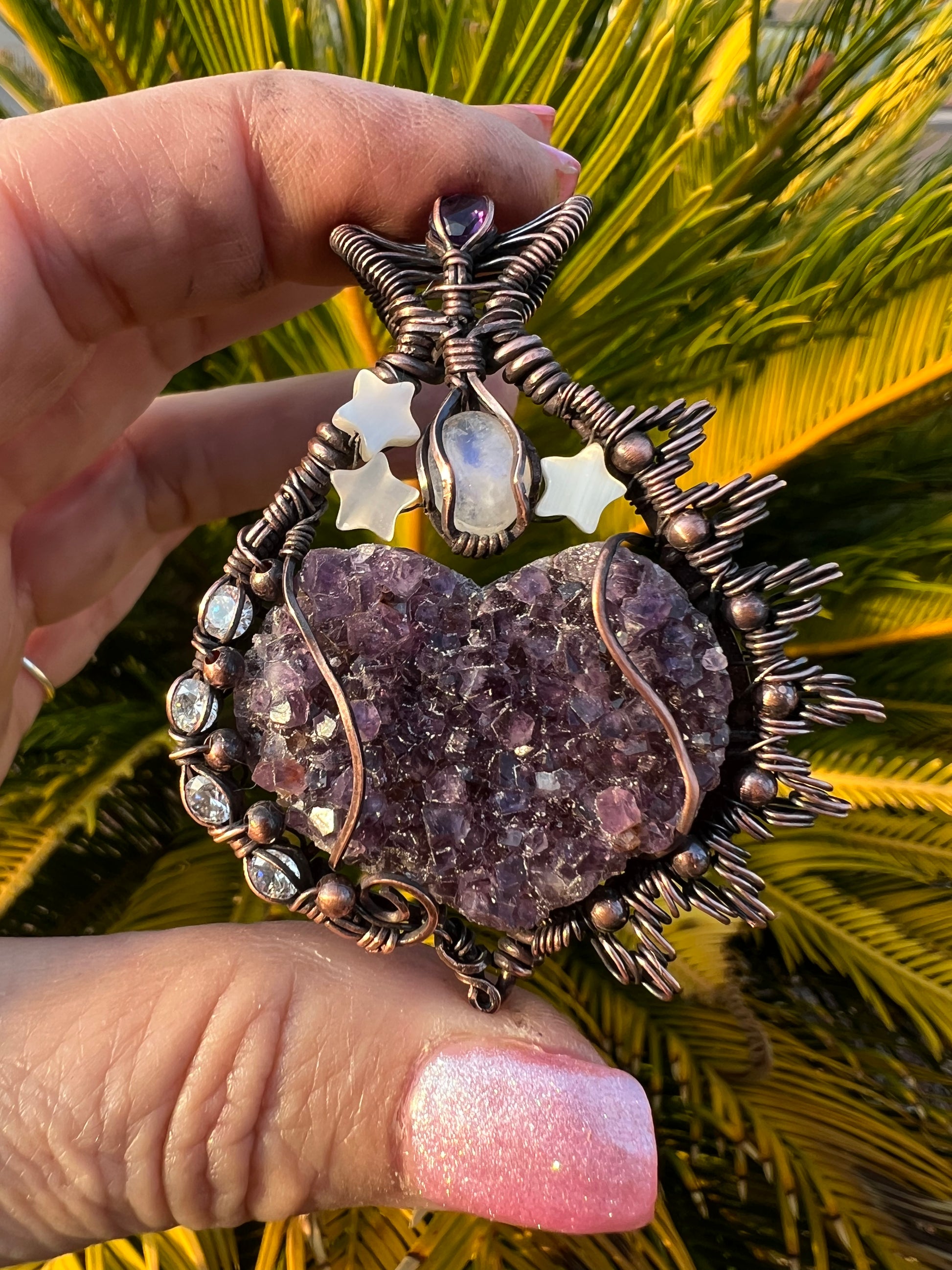 A raw amethyst heart wrapped in copper and crowned with moonstone, stars, and sparkle. For the one whose heart is guided by starlight and soul.
