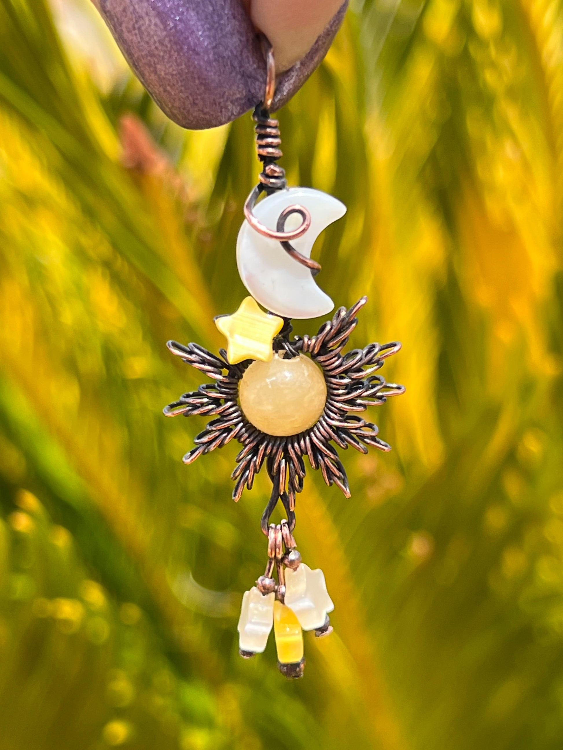 Together, they weave a cosmic talisman of balance — night and day, shadow and light, dream and action. Wrapped in copper, this pendant channels harmony between celestial forces.