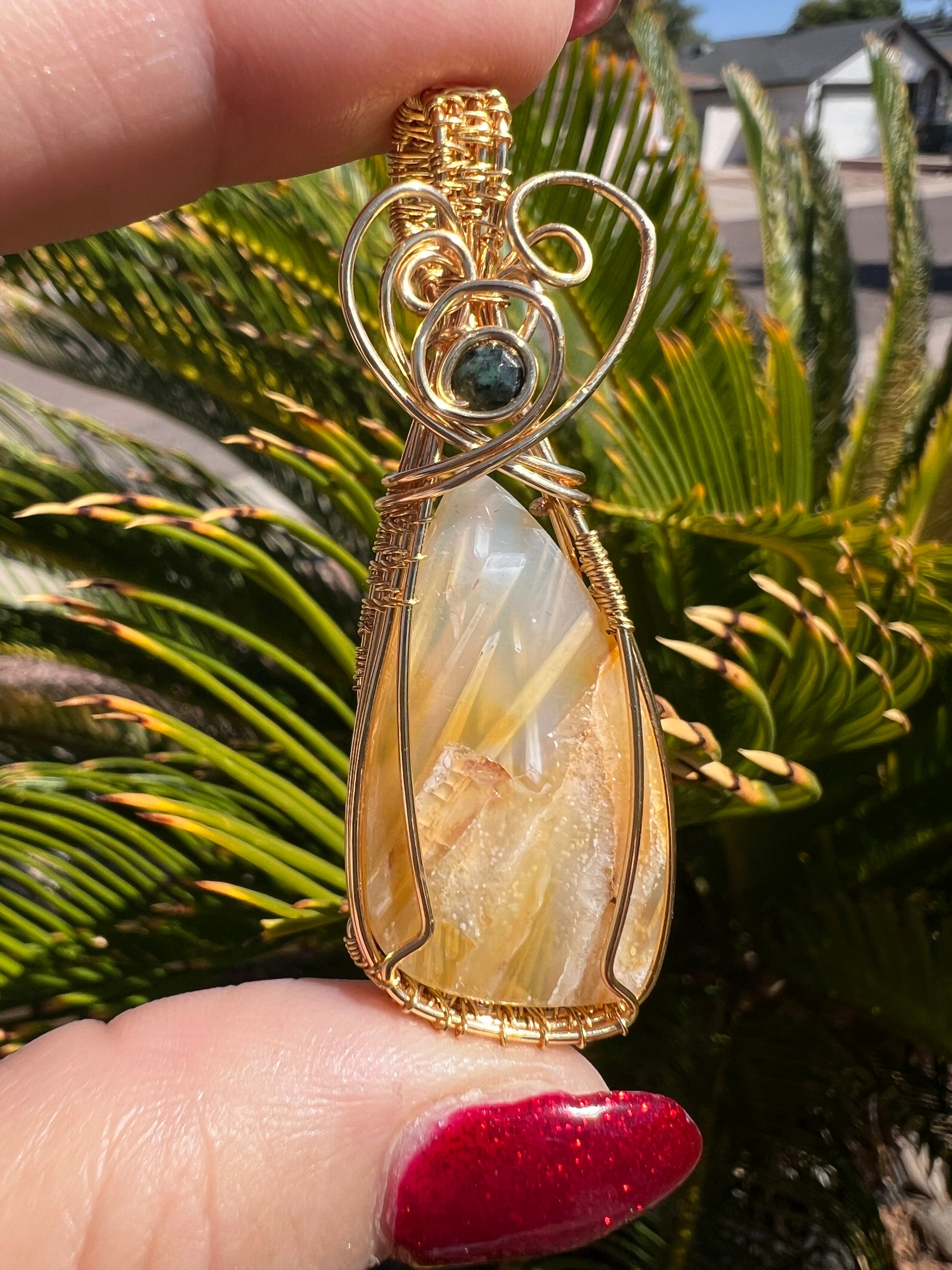 Tube Agate in Gold Color Plated nontarnish wire accented with a genuine Emerald bead.