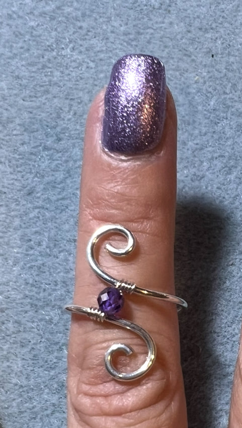 Two graceful silver spirals meet at the center, framing a faceted purple zircon that catches the light with every movement. This open-wrap sterling silver ring is adjustable for comfort, blending fluid design with a vibrant pop of color. Perfect for adding a touch of elegance and artistry to your everyday style.