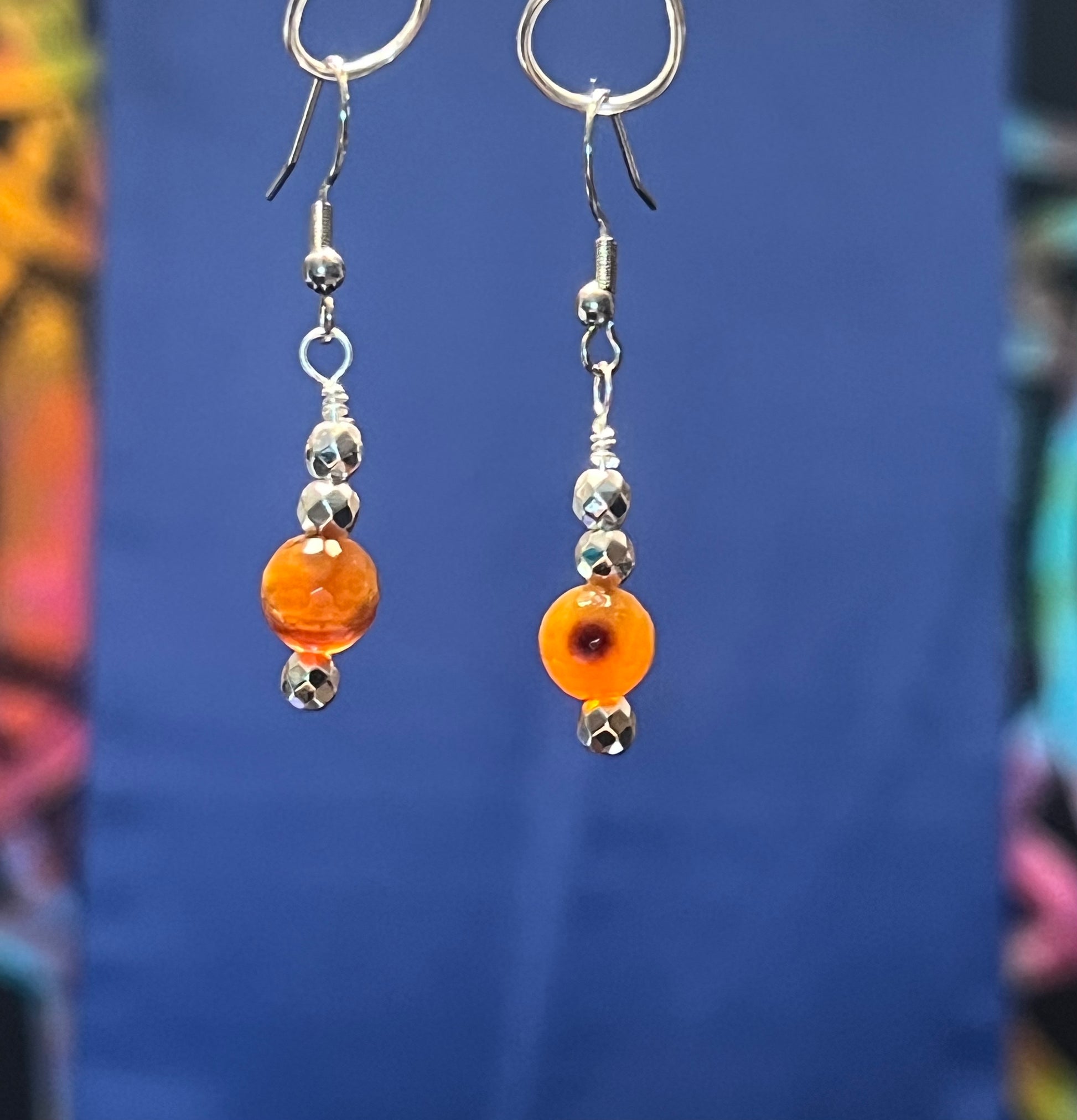 Brown Striped Agate Silver Hematite beads. Stainless Steel Ear hooks. 1 3/4 inches long from top of hook to bottom