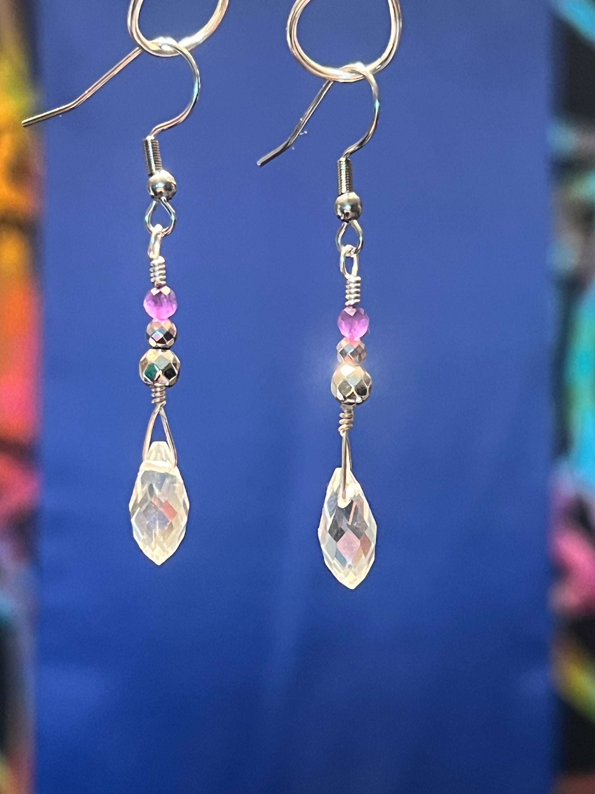 Crystal Briolette accented with Silver Hematite and Amethyst beads, Stainless Steel Ear hooks. 2 1/4 inch long from top of hook to bottom