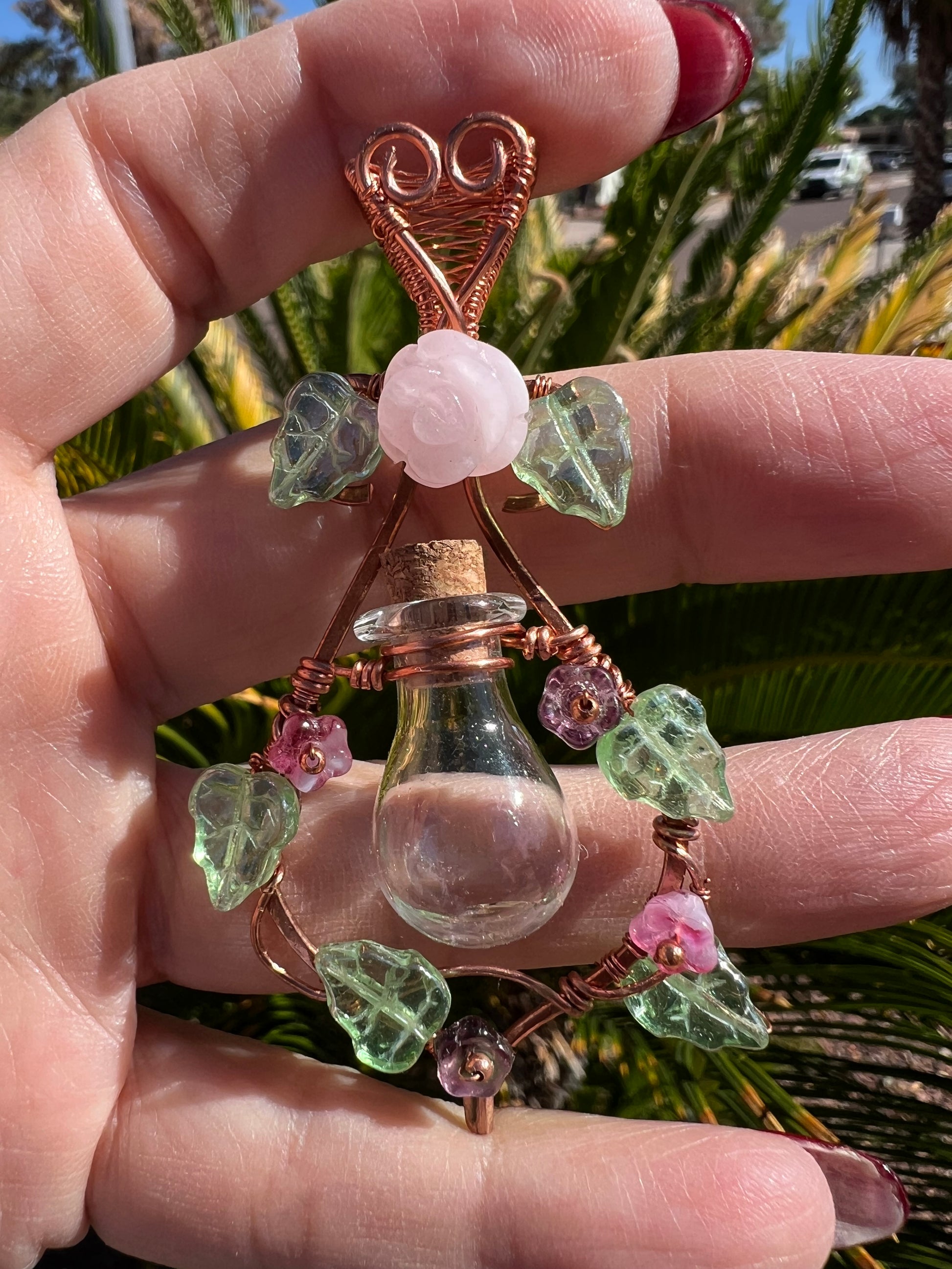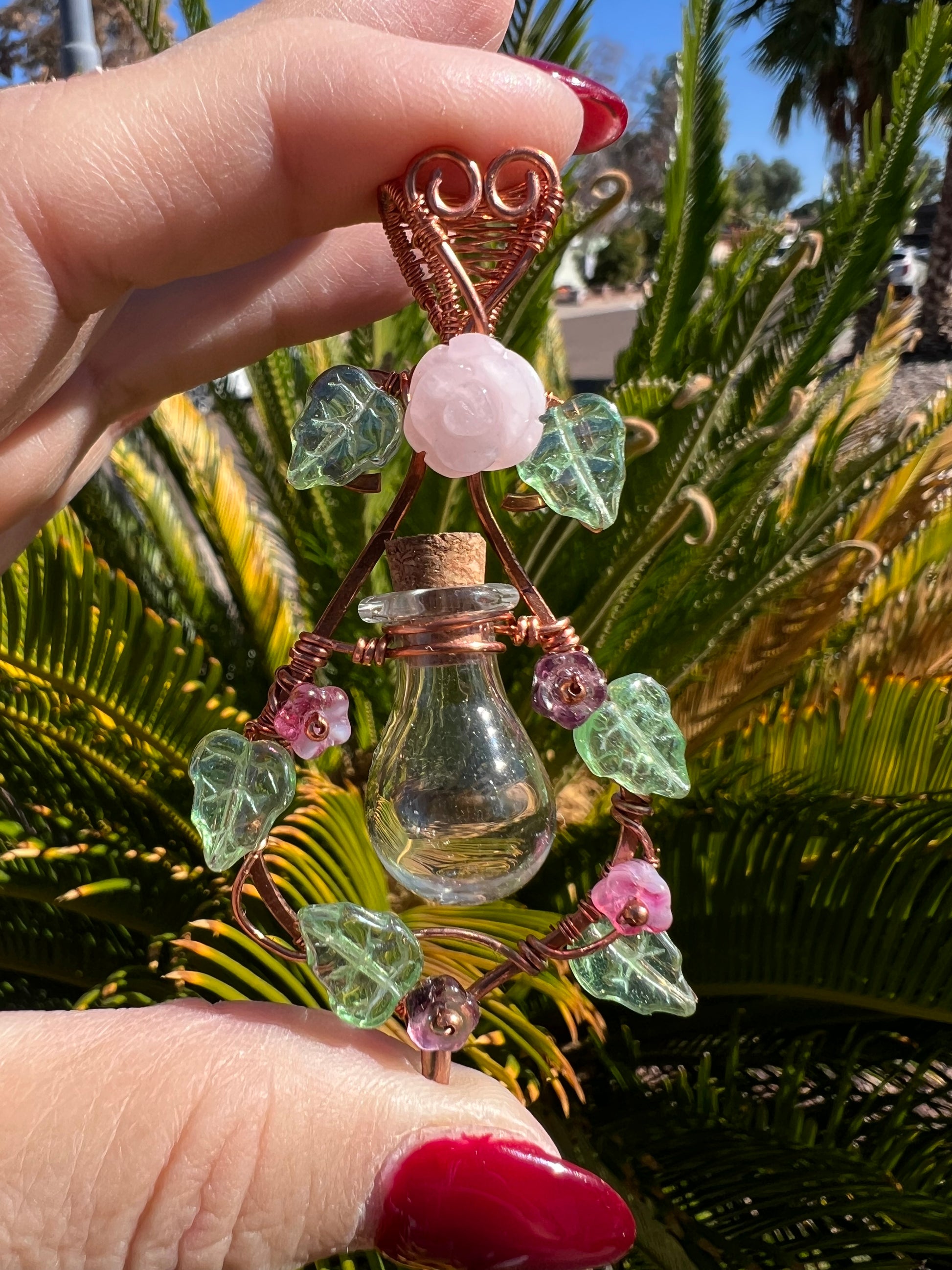 Bottle nestled in a Rose Garden wrapped in Bare Copper wire.