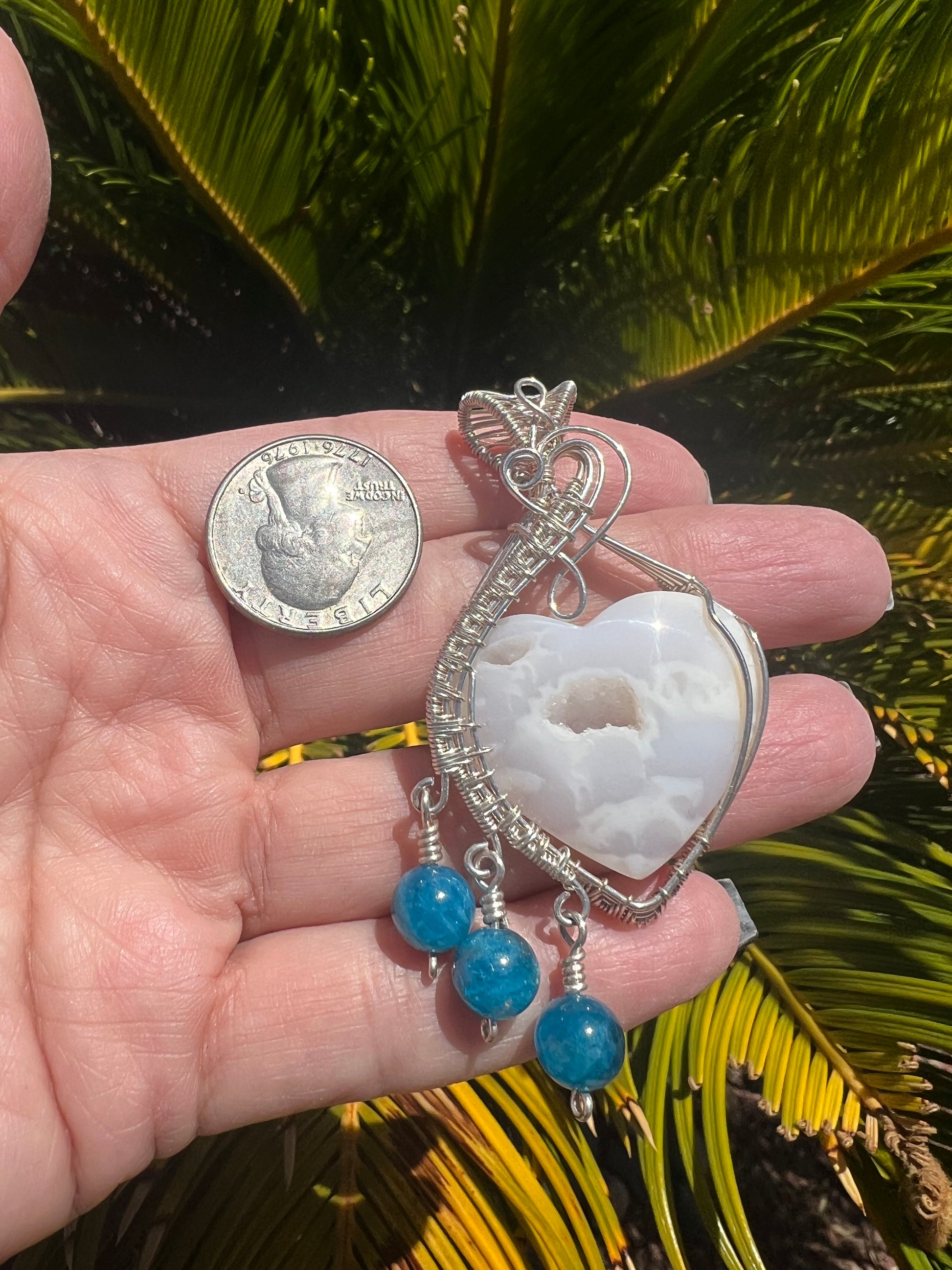 This handcrafted pendant features a heart-shaped white plume agate with a natural druzy center, wrapped in sterling silver. Three blue apatite beads dangle below, adding vibrant energy and movement. A stunning piece for clarity, heart healing, and inspired expression.